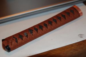 Tsuka nebyla součástí zakoupeného setu. Proto byla vyrobena nová, včetně všech součástek. Rejnočí kůže je kolem celého dřevěného jádra, lakovaná. Oplet byl použit obyčejný, bavlněný. (Namikawa heibei co.ltd.) Důležitá je stejně jako u ostatních částí meče sugata. Základní tvar. Není od věci si správný tvar rukojeti nastudovat. U opletu se pro správný tvar a funkci používají jako podklad vycpávka, papírové vložky ashigami. Jejich správné použití zajišťuje nejen pěkný tvar opletu, ale také jeho funkčnost. U nového meče by měl být oplet řádně vyplněný, s pravidelným vzorem a čistý. Překvapilo mně, když jsem viděl na nově opletených mečích oplety špinavé a poškozené, jako po několika letech používání. Koncový uzly mají svá pravidla a neškodí, když jsou jednoduše řečeno hezké.