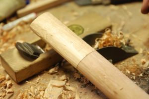 Co se týče mnou prezentované předělávky. Trvala cca. 12 hod. Technicky se jedná o nejrychlejší a nejlevnější možnou variantu zpracování. Zakoupená čepel (cena cca 5 500 Kč) byla osazená habaki a měla pochvu bez laku osazenou součástkami z rohoviny. Toto příslušenství bylo použitelné pro další zpracování.
