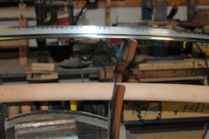 Tvar ucházející, příliš dlouhý trn. Ten jsem zkrátil o cca 7cm a trochu upravil jeho tvar. Osazení hamachi bylo křivé a bylo výrazně posunuté za menemachi. Správně jsou proti sobě. Důvodem byl zřejmě chybějící zářez v spodní straně habaki pro hamachi. Upravil jsem tedy obě osazení do správného tvaru a pozice proti sobě. U habaki jsem vyříznul zářez pro ostří.
