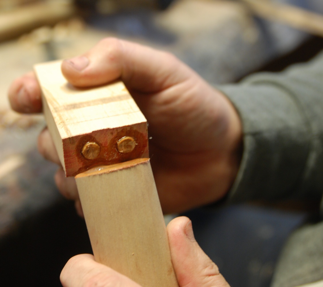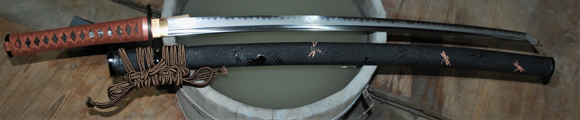It was a little short. Only about 2cm longer than the blade. I cut off the end of the kojiri and set the saya with a piece of alder wood. The joint was on a tenon and glued with epoxy glue. The kurigata was at a greater distance than the correct placement. So I removed it, and filled the hollow after it with wood. I used a planer to slim the scabbard down considerably and correct its shape a bit. After adjusting the shape, I seated the kurigata at the correct distance from the koiguchi. After adjusting the length of the saya, I placed the kojiri back on its end. The only part that remained basically unchanged was the koiguchi. After sanding the scabbard, painting it followed. In addition, the kaerizuno component was attached. A recess for the kogatana was also made on the ura side of the scabbard. It is only stylized (the pocket for the blade of the knife is not finished) and a horn-like kozuka insert is glued in the back of the fold. It serves only an aesthetic function. At the request of my son, for whom the sword is intended, the saya was decorated with a dragonfly motif.