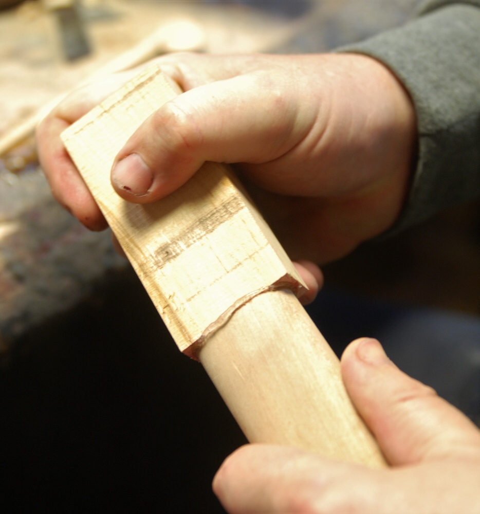Shape passable, too long thorn. I shortened it by about 7cm and adjusted its shape a bit. The hamachi fitting was crooked and was significantly offset behind the menemachi. Correctly they are opposite each other. This was probably due to a missing notch in the underside of the hamachi for the hamachi. So I adjusted both mounts to the correct shape and position opposite each other. I cut a notch in the habaki for the blade.