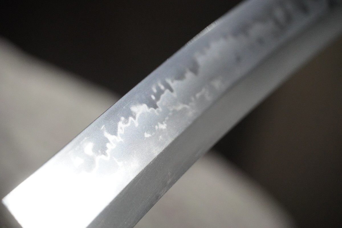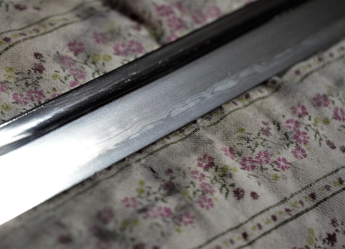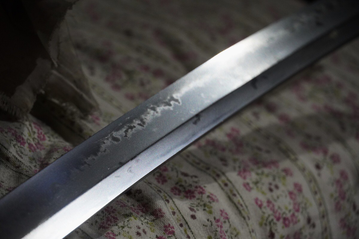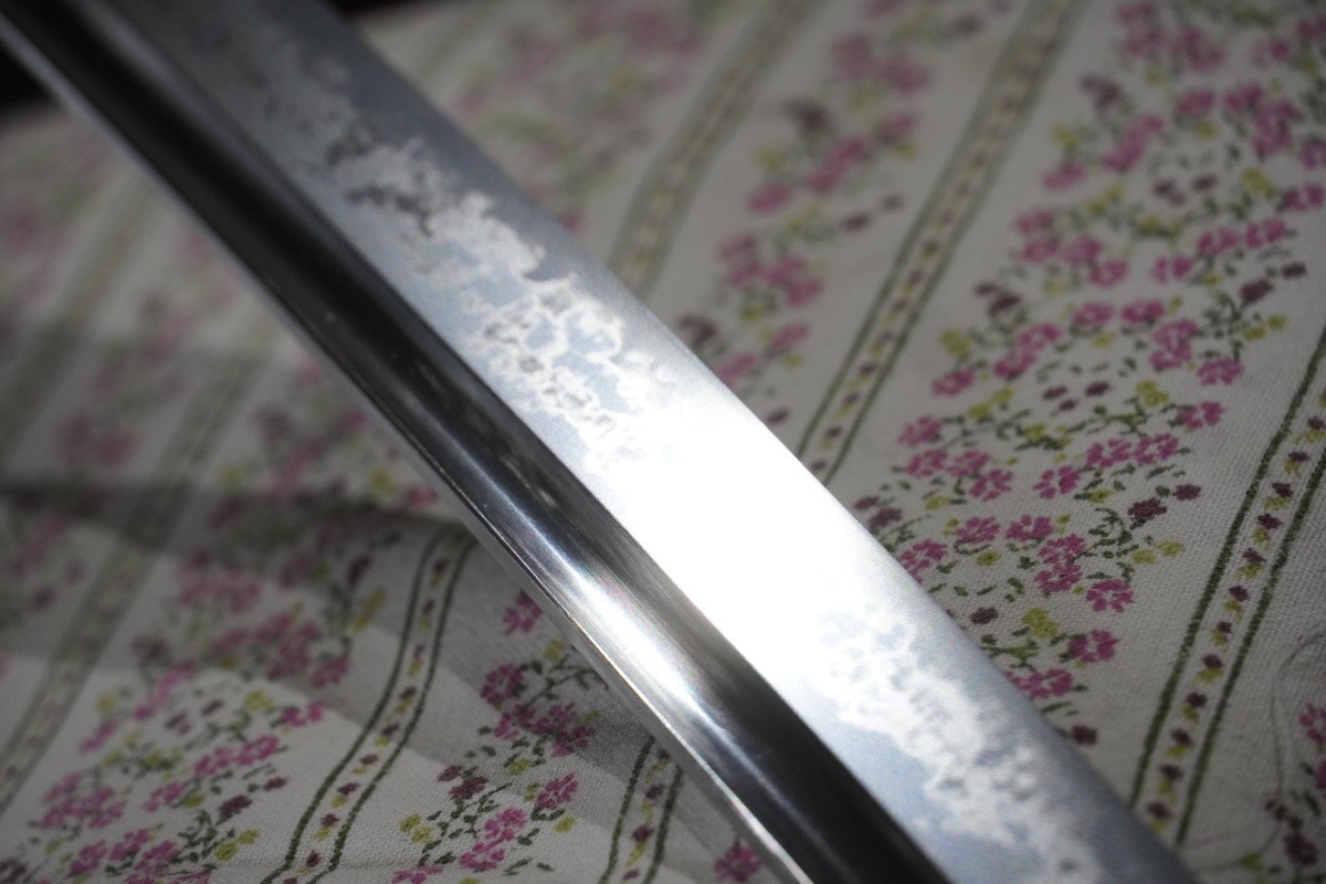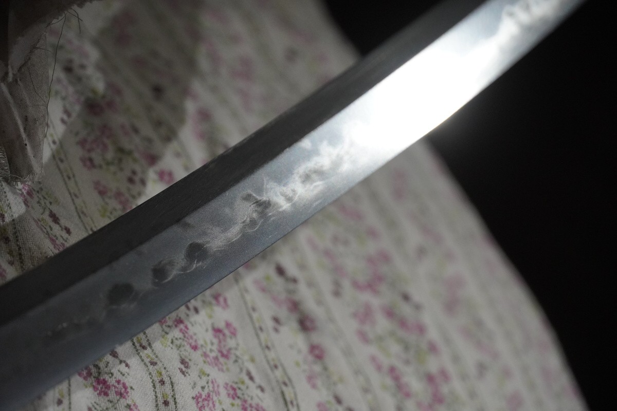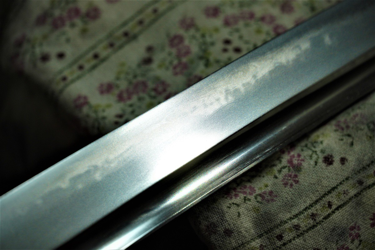 Blade katana in Bizen style. Nagasa approx. 80 cm, bo-hi (grooves). Hamon midare, gunome, choi. Distinctive nie utsuri. Structure itame, ko-mokume. Kinsuji, sunagashi.