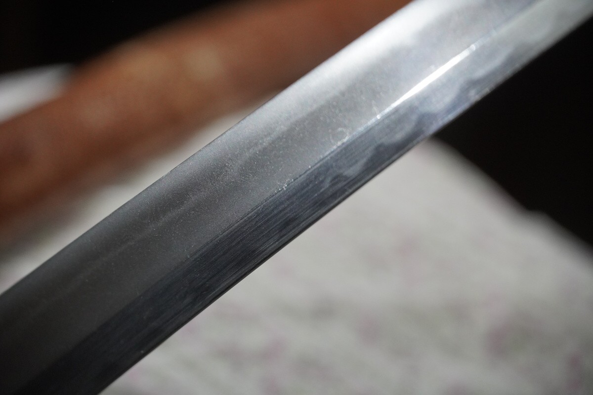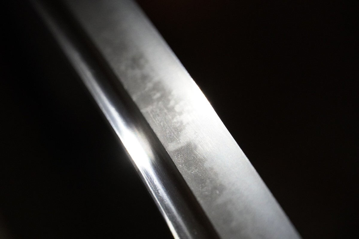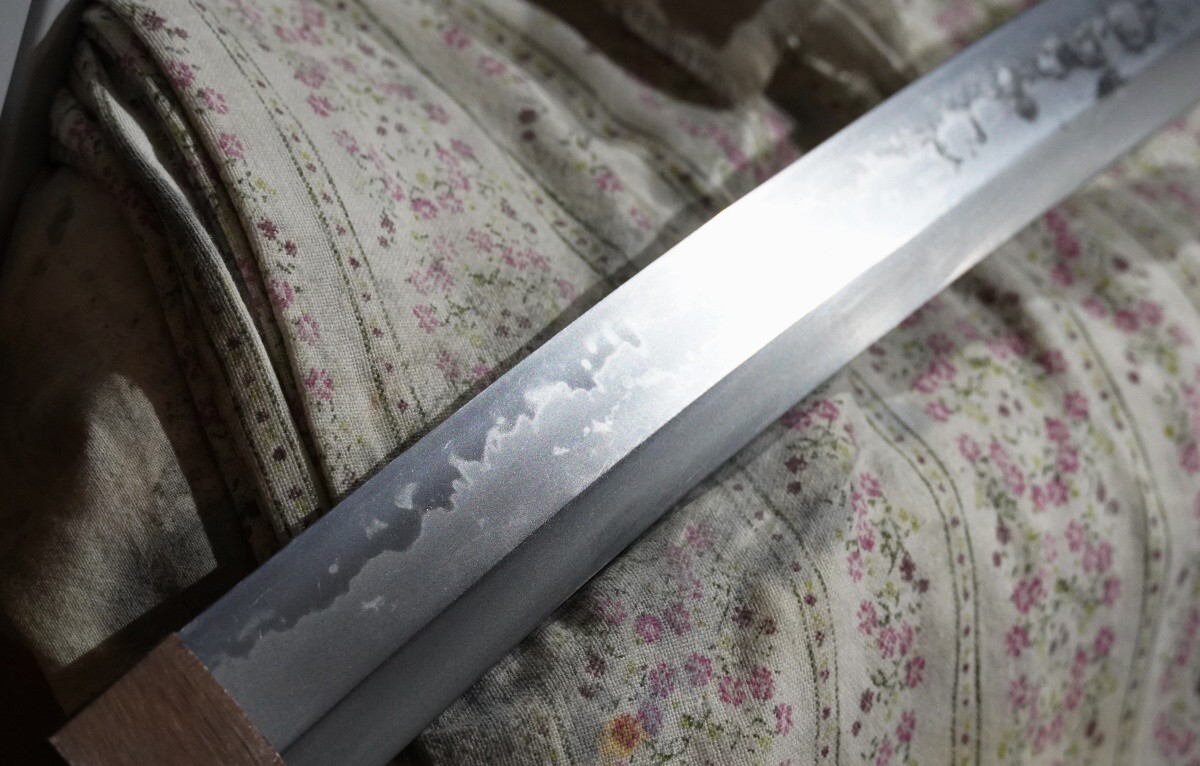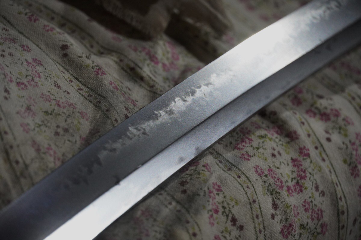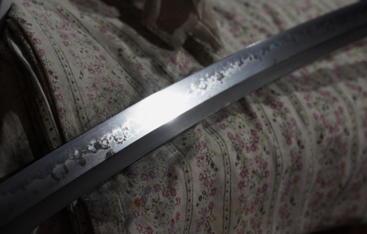 Blade katana in Bizen style. Nagasa approx. 80 cm, bo-hi (grooves). Hamon midare, gunome, choi. Distinctive nie utsuri. Structure itame, ko-mokume. Kinsuji, sunagashi.