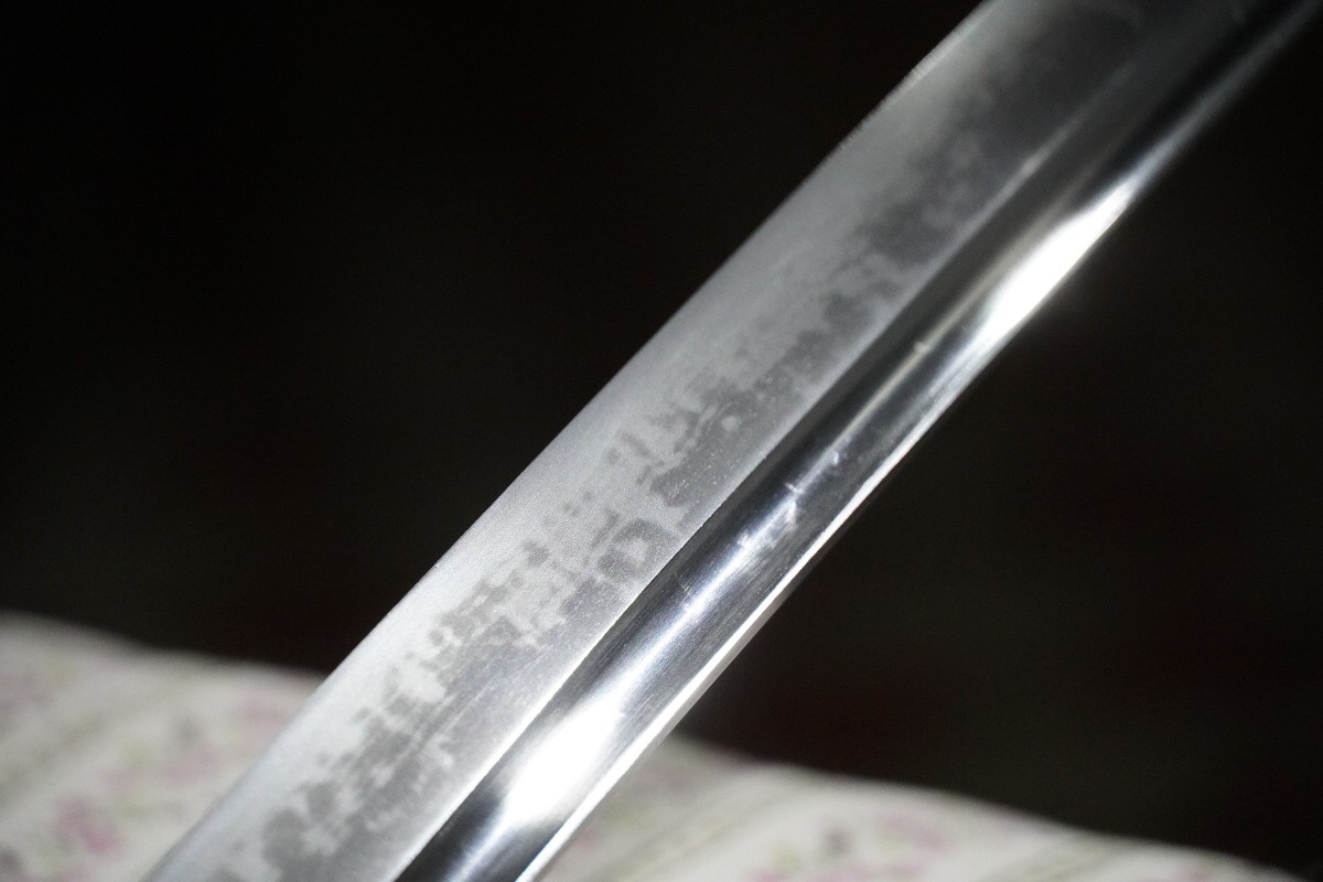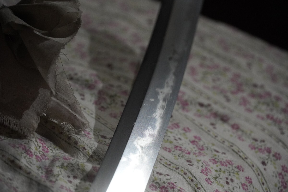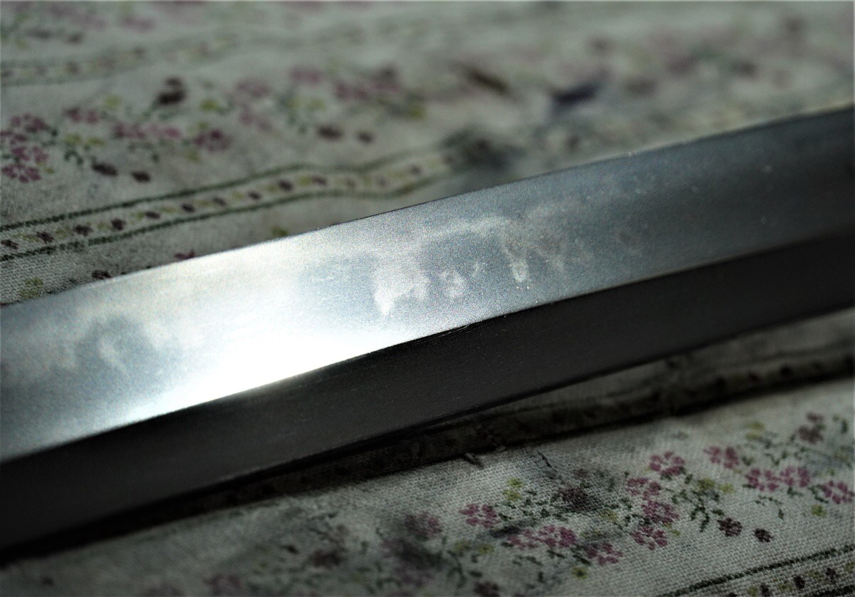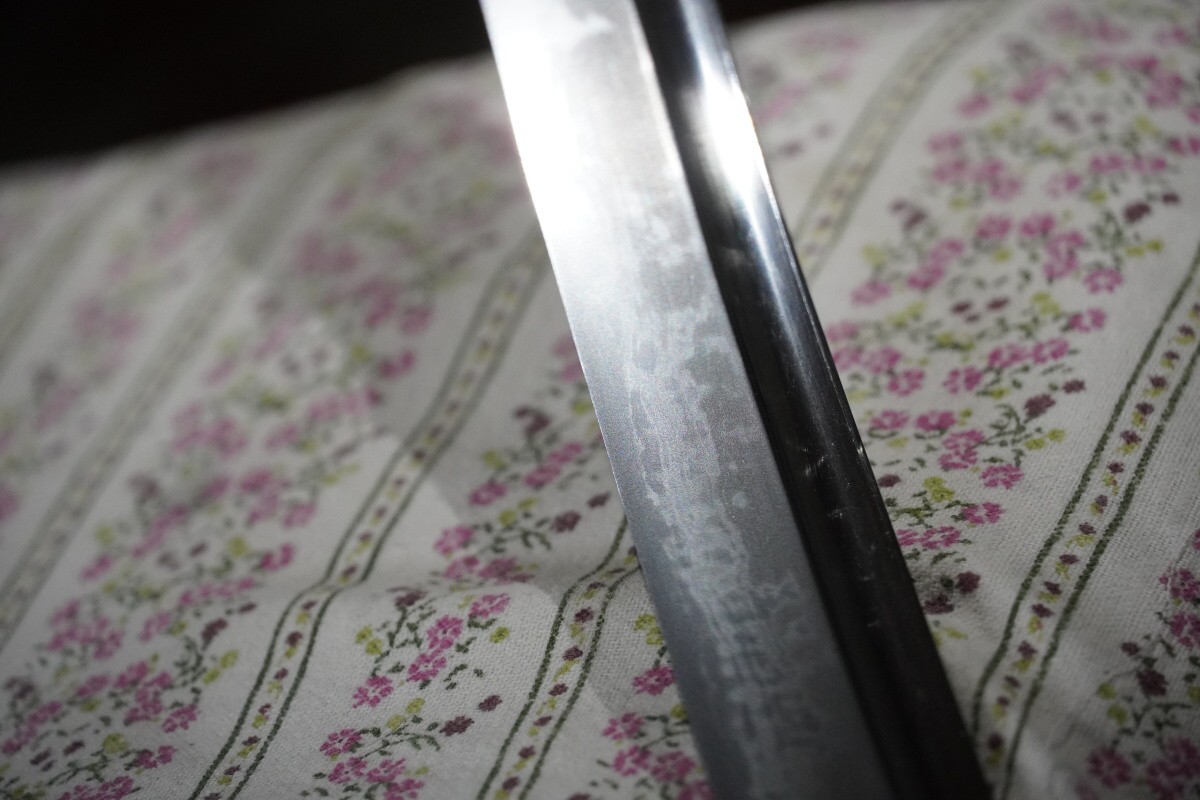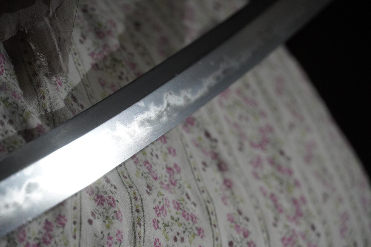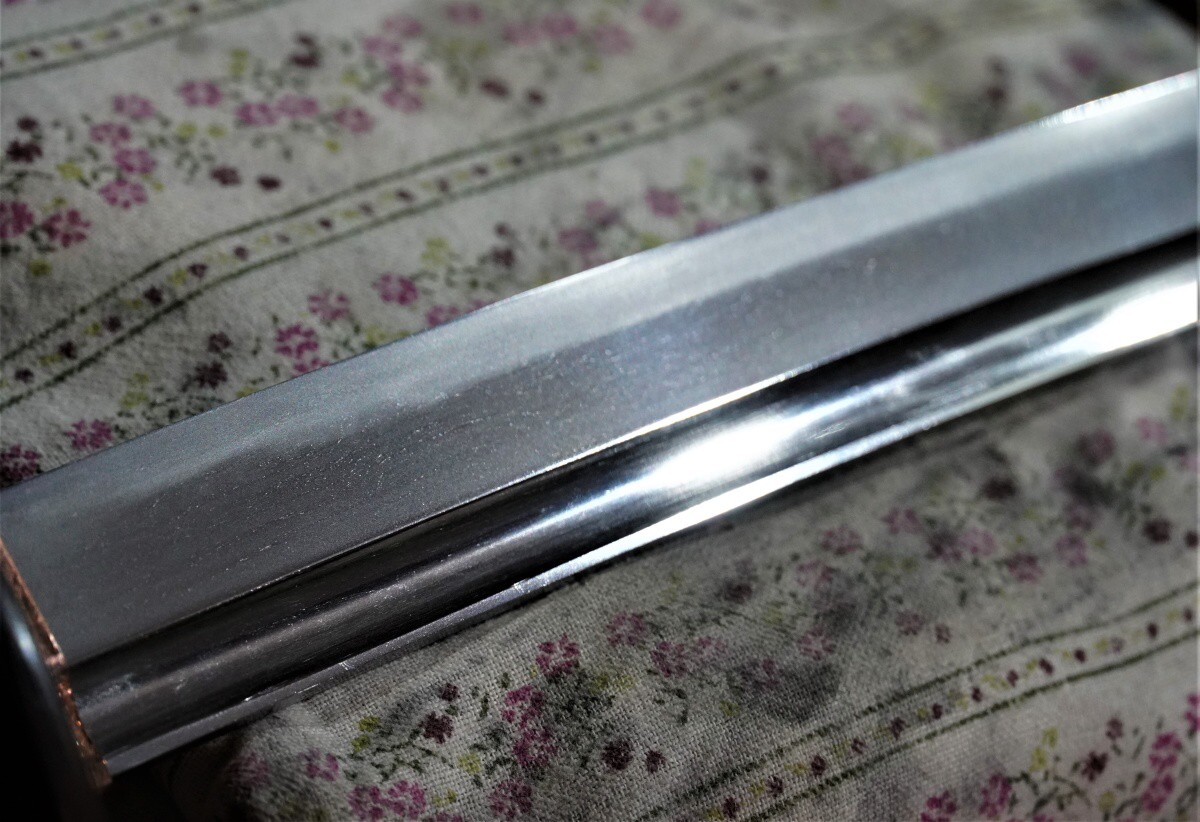 Blade katana in Bizen style. Nagasa approx. 80 cm, bo-hi (grooves). Hamon midare, gunome, choi. Distinctive nie utsuri. Structure itame, ko-mokume. Kinsuji, sunagashi.