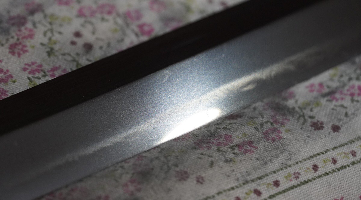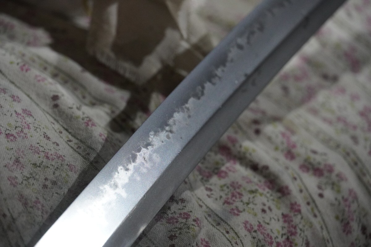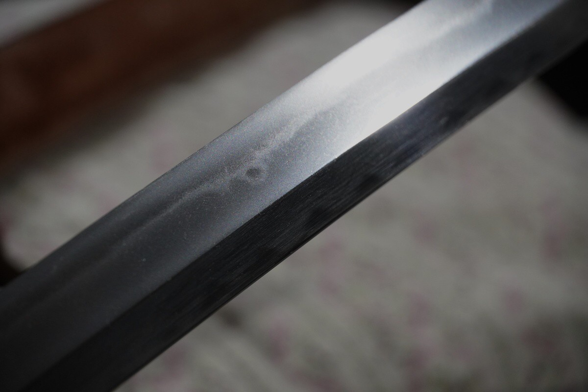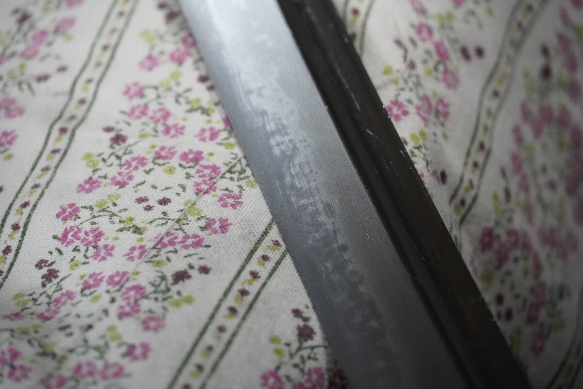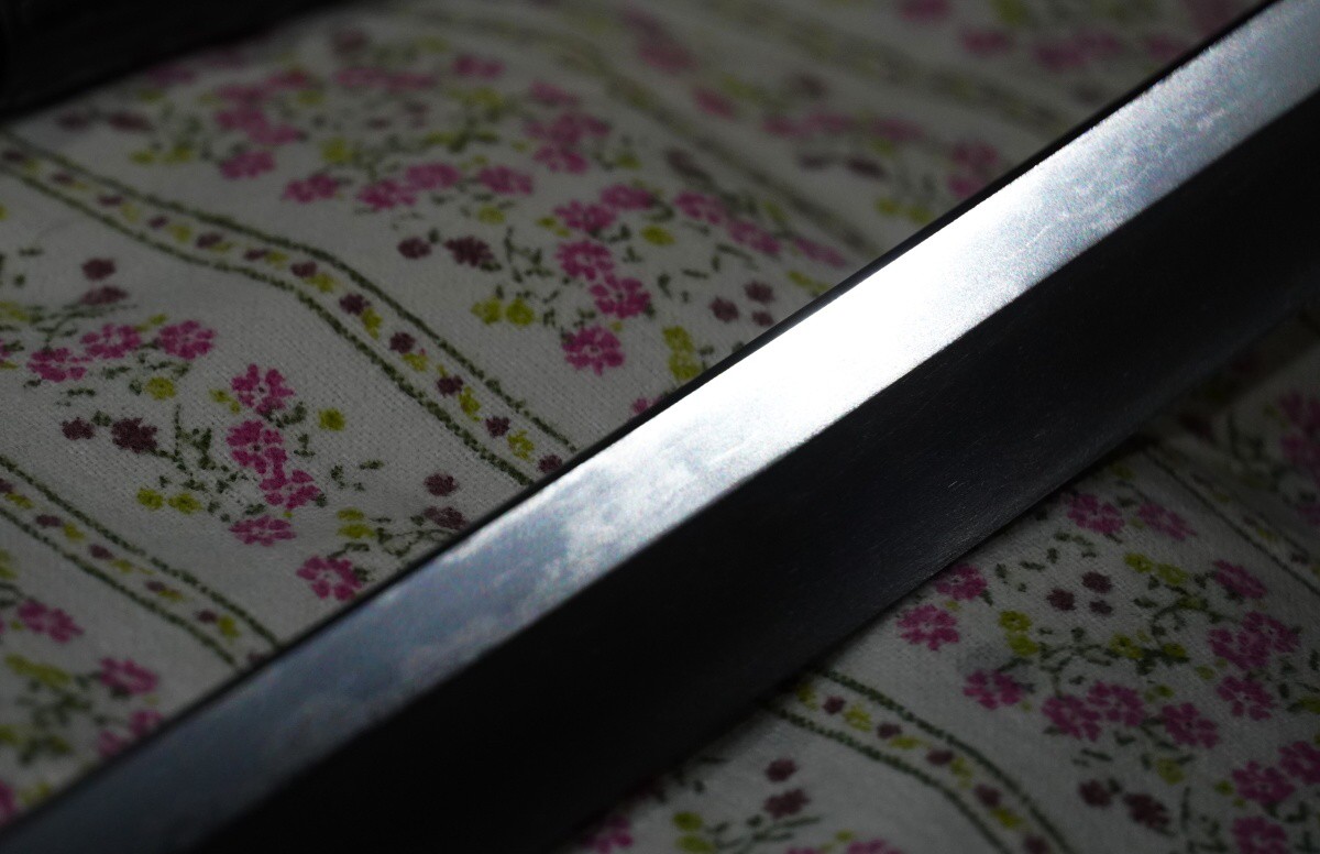 Blade katana in Bizen style. Nagasa approx. 80 cm, bo-hi (grooves). Hamon midare, gunome, choi. Distinctive nie utsuri. Structure itame, ko-mokume. Kinsuji, sunagashi.