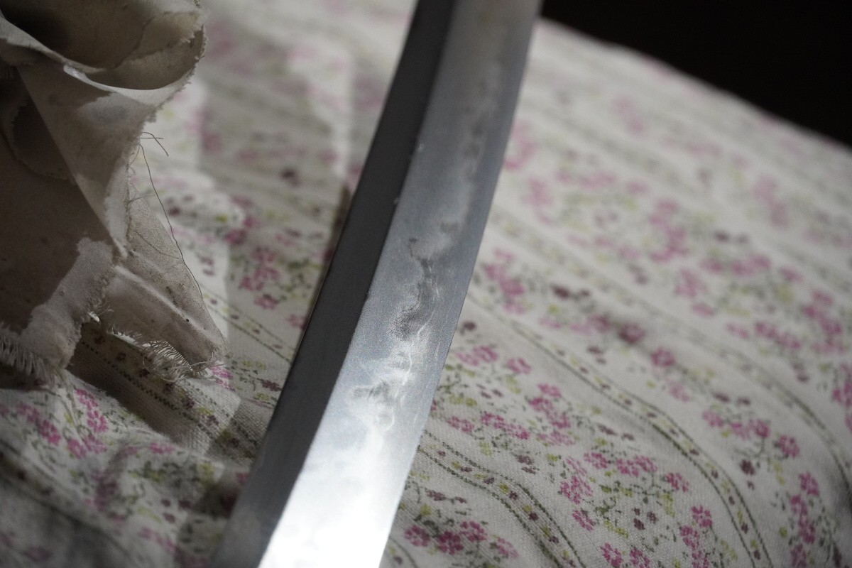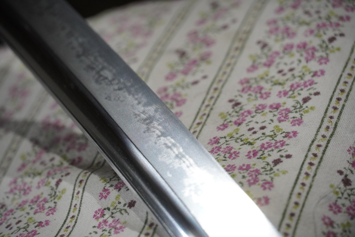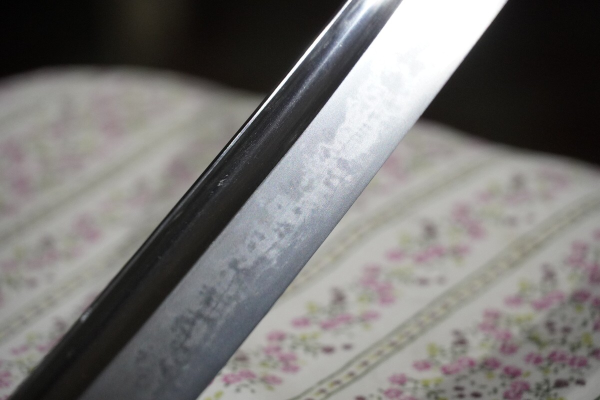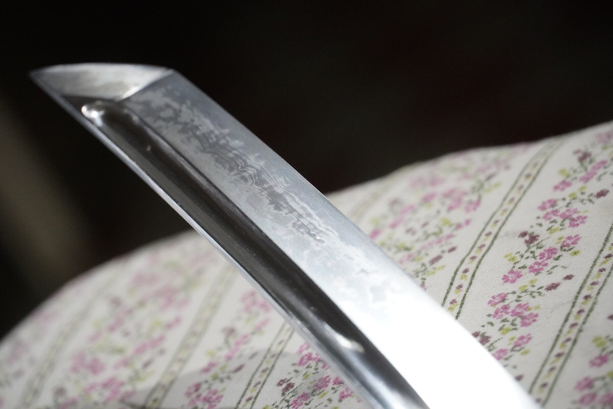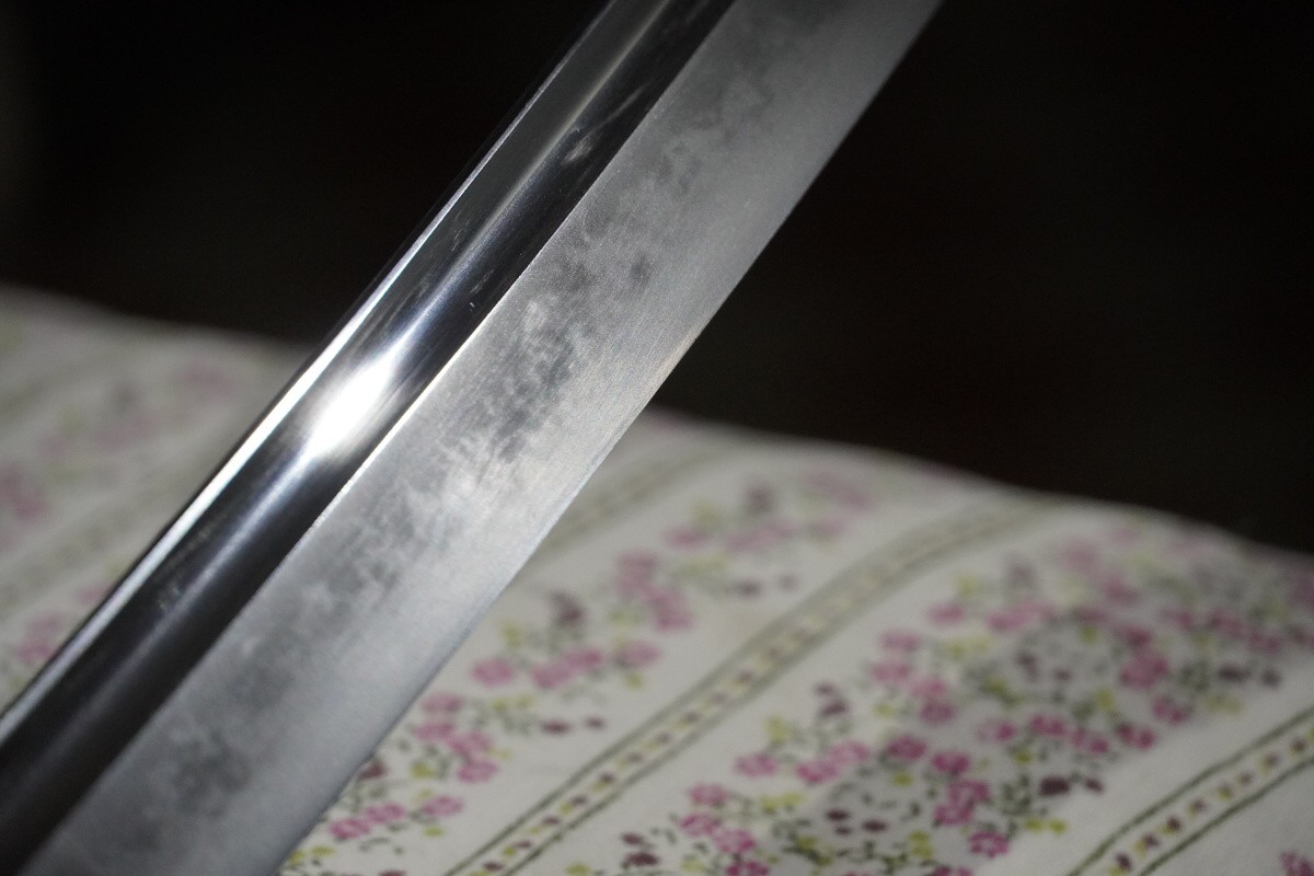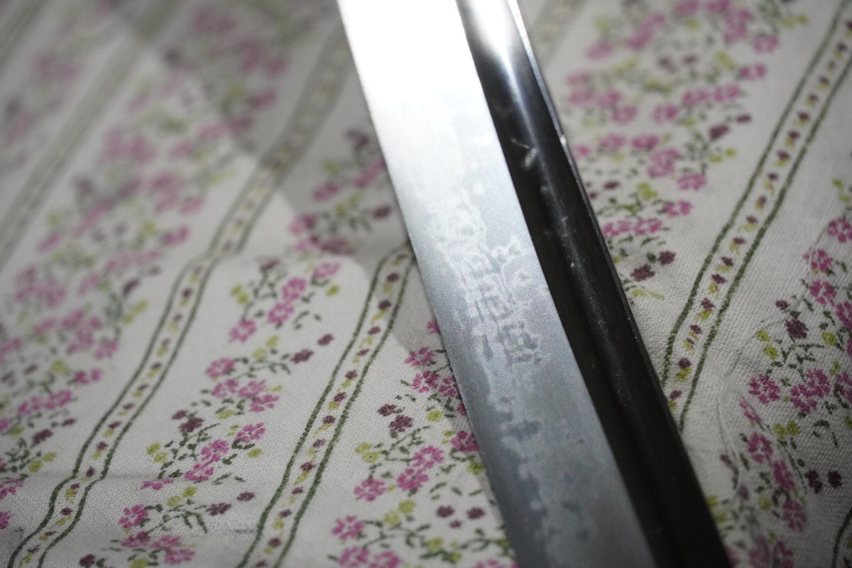 Blade katana in Bizen style. Nagasa approx. 80 cm, bo-hi (grooves). Hamon midare, gunome, choi. Distinctive nie utsuri. Structure itame, ko-mokume. Kinsuji, sunagashi.