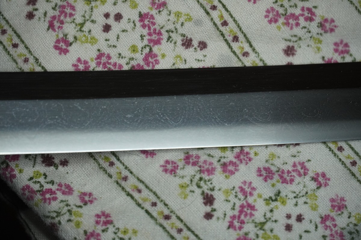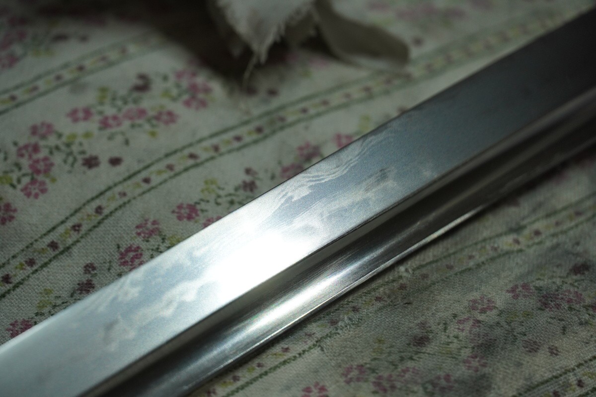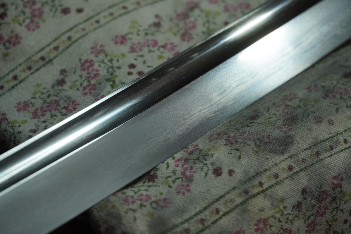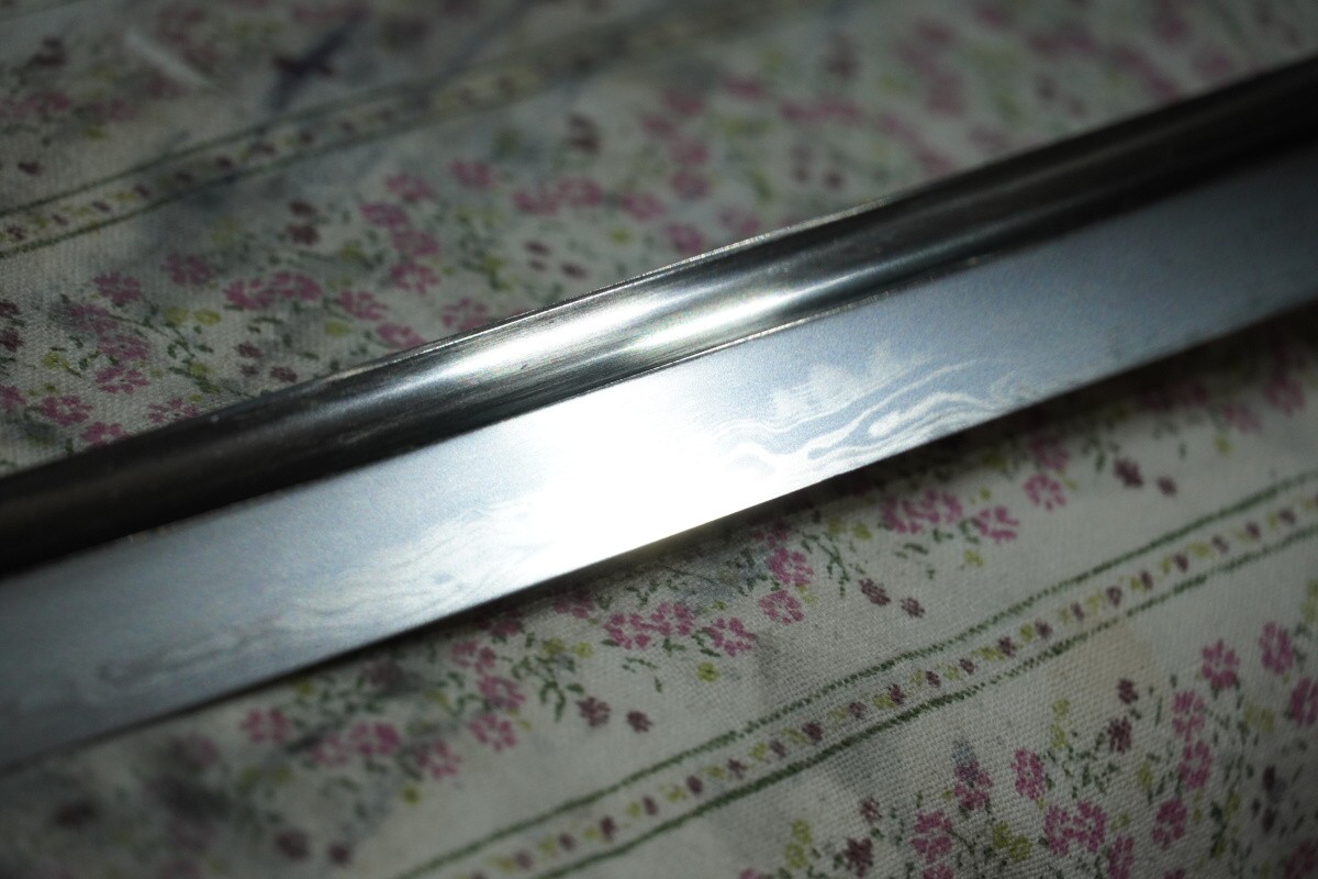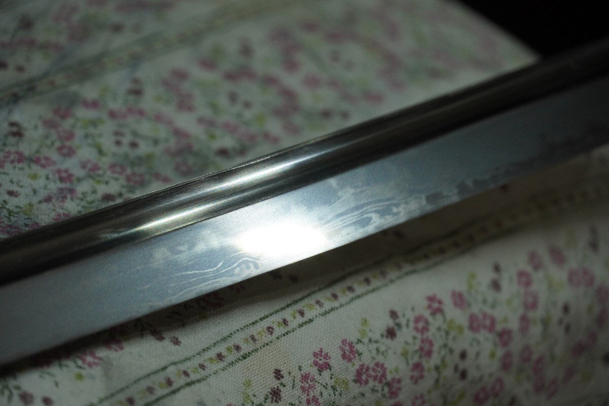Shinto style katana, nagasa 75cm, steel oroshigane, hada itame, mokume, hamon suguha, nie. Polishing in modern hadori style.