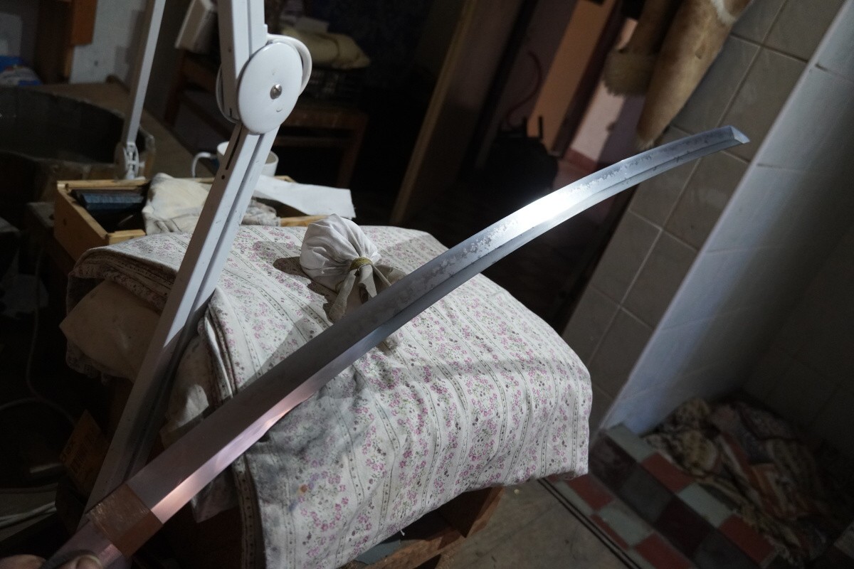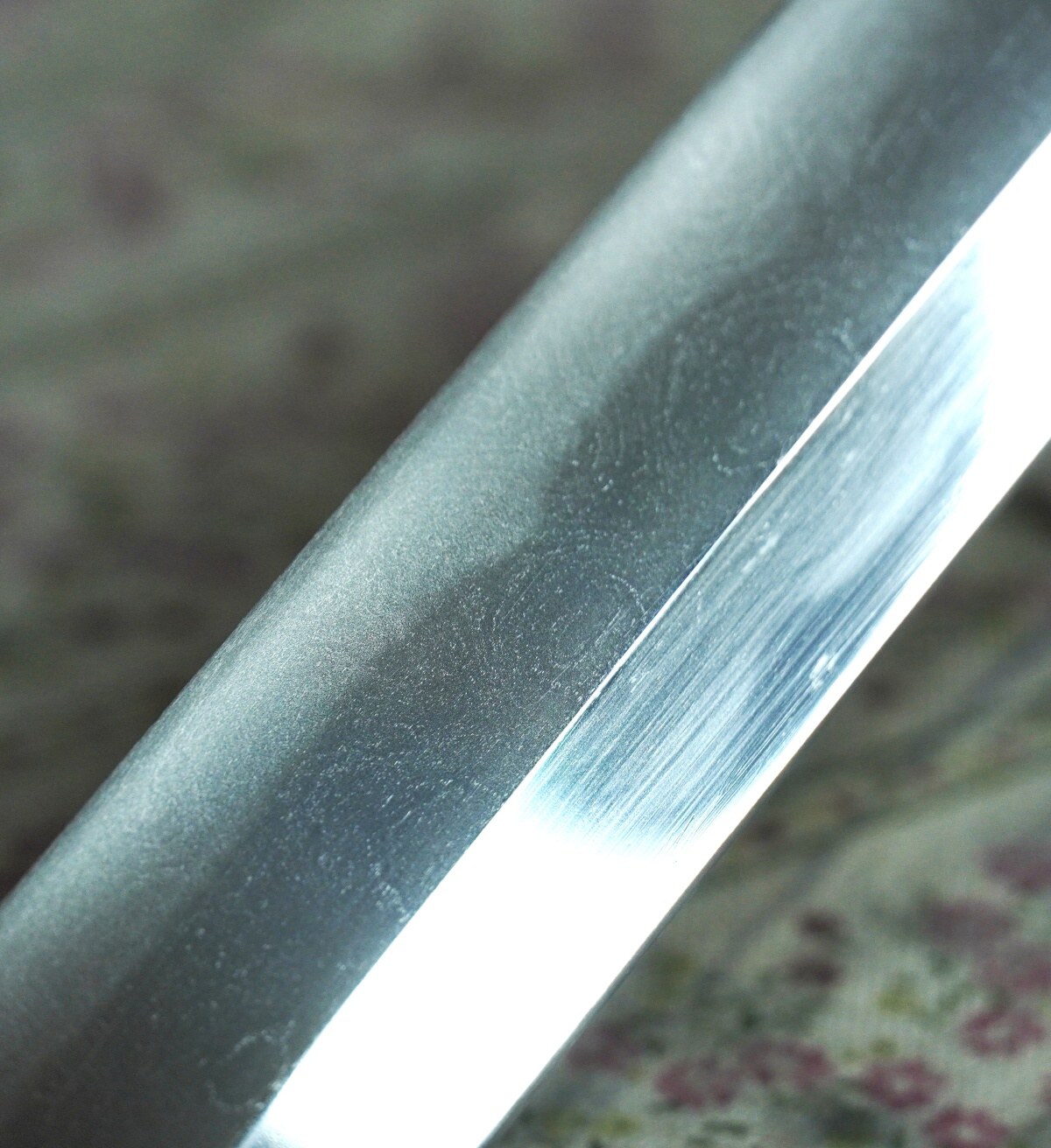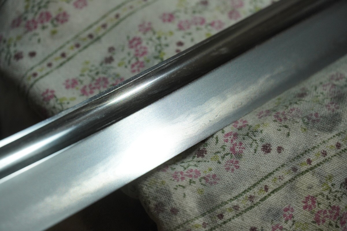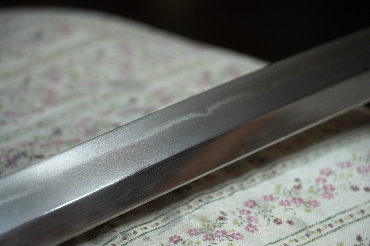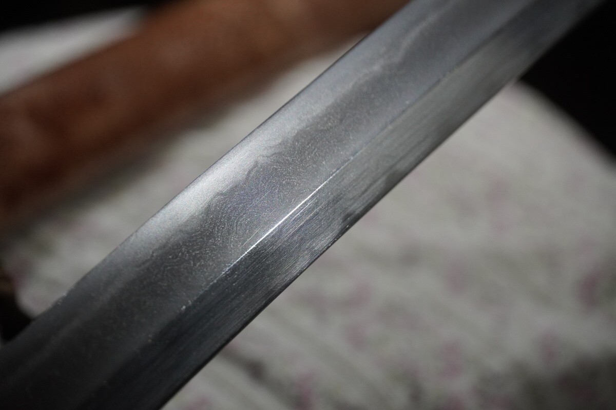 Shinto style katana, nagasa 75cm, steel oroshigane, hada itame, mokume, hamon suguha, nie. Polishing in modern hadori style.