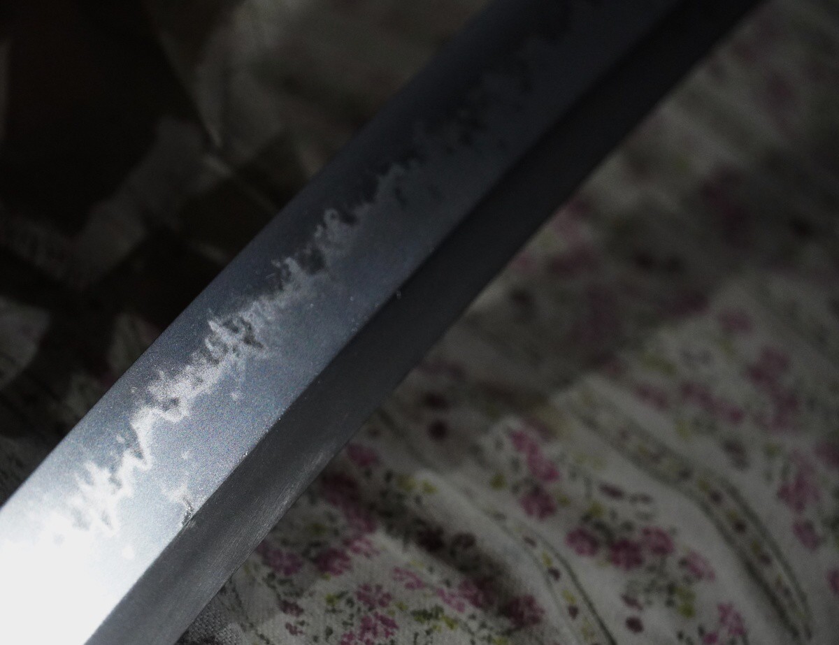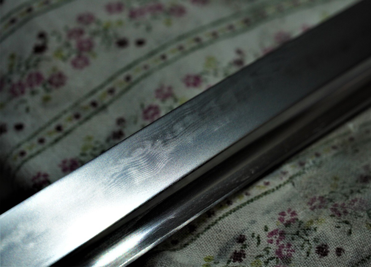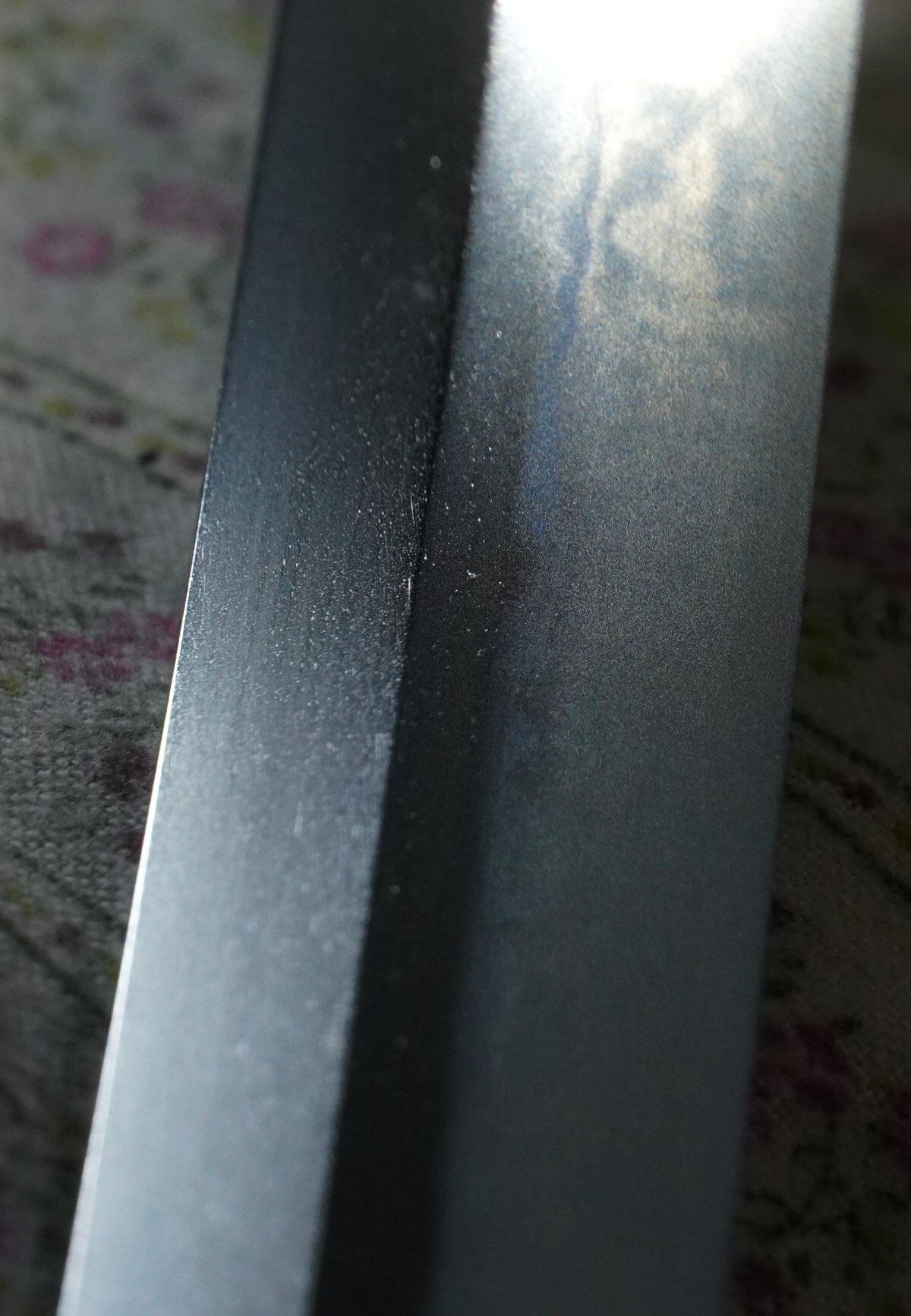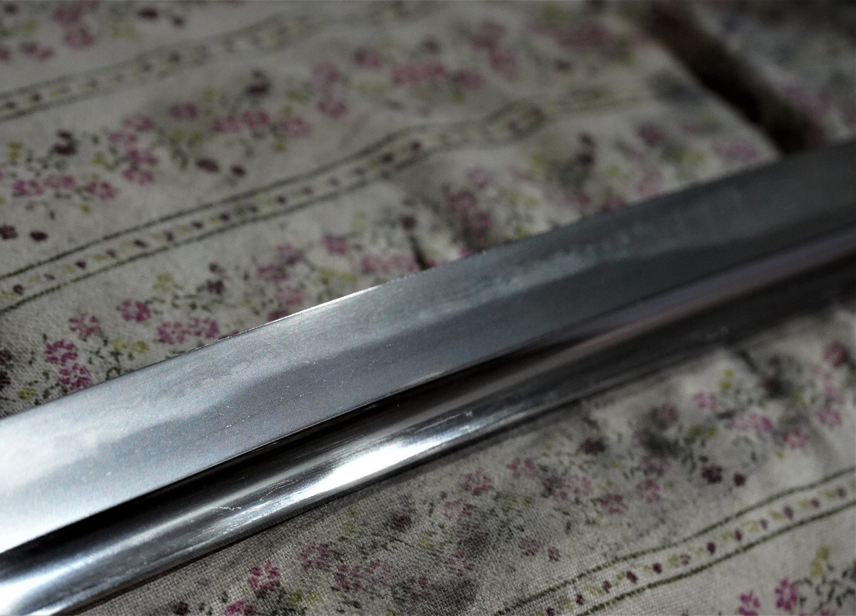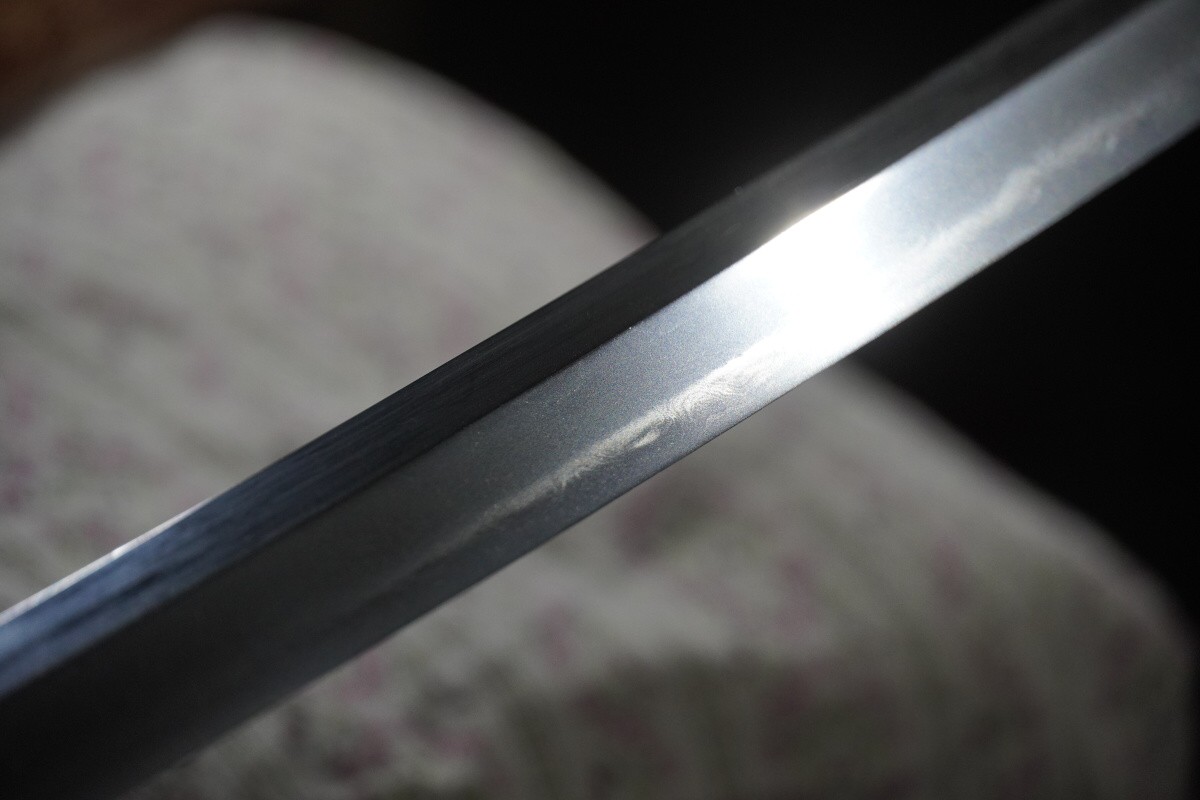 Shinto style katana, nagasa 75cm, steel oroshigane, hada itame, mokume, hamon suguha, nie. Polishing in modern hadori style.