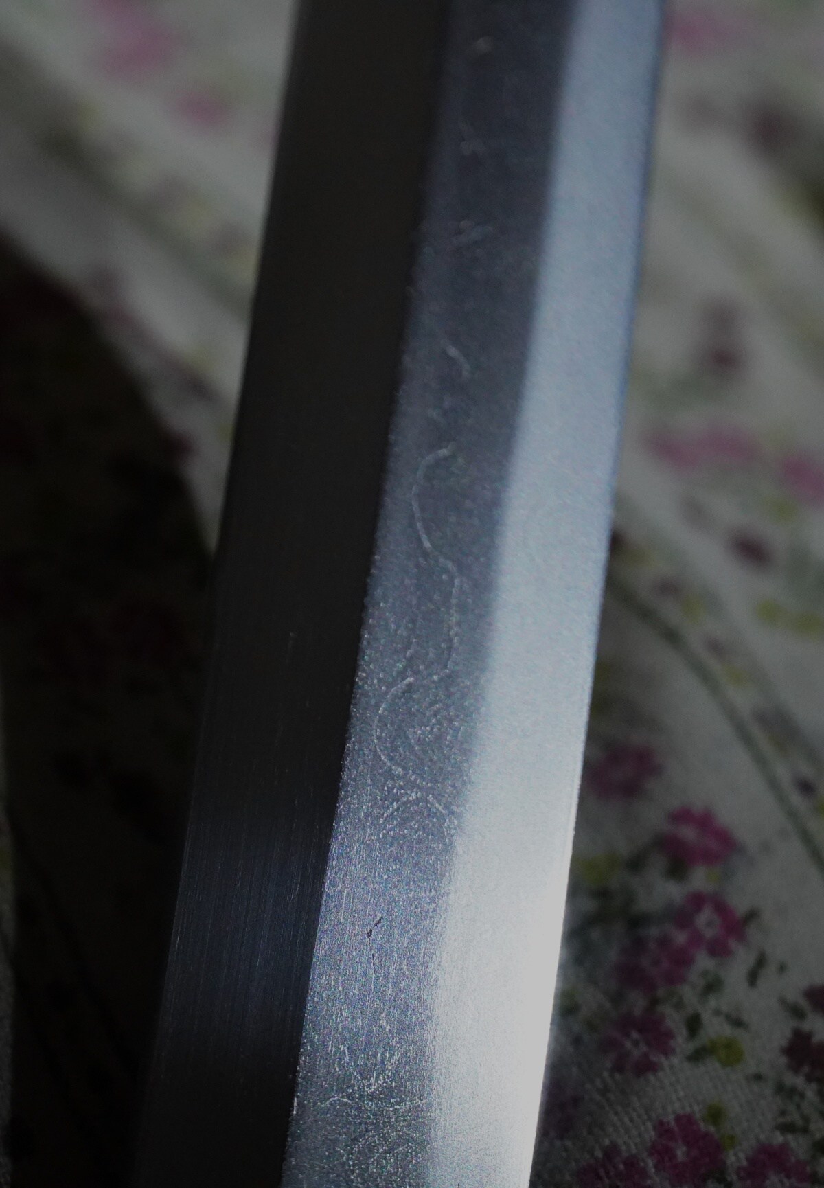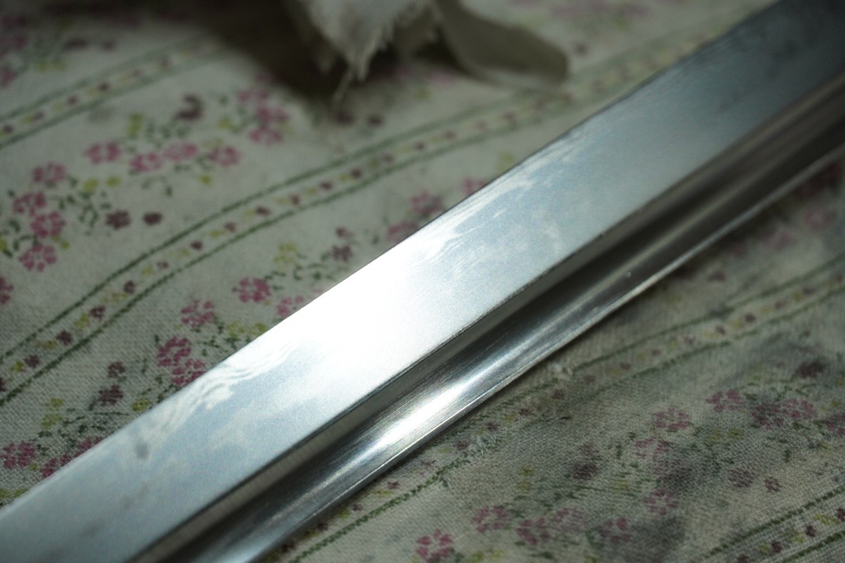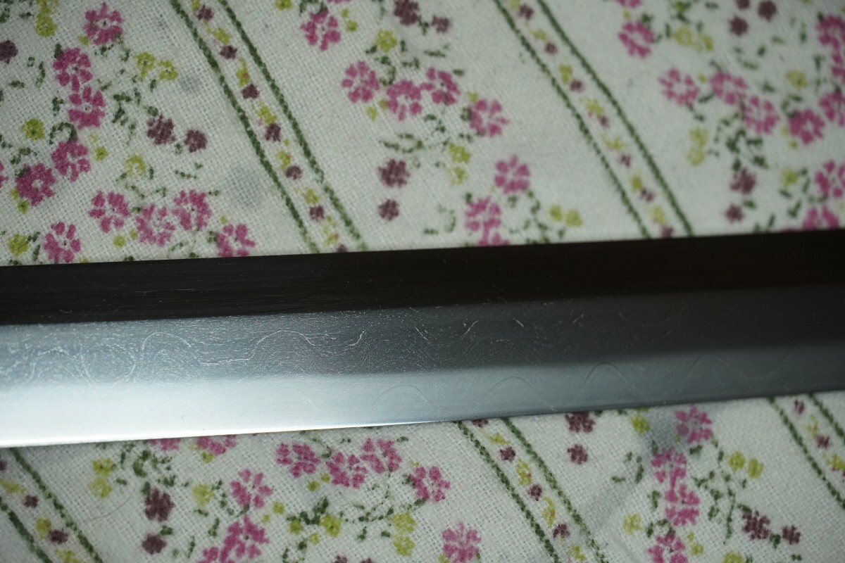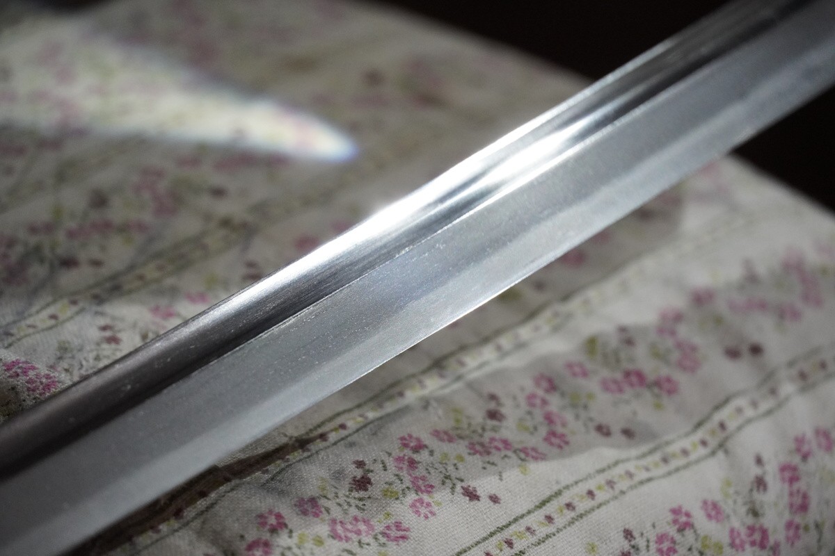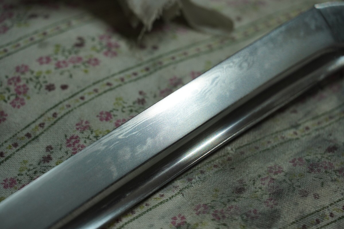 Shinto style katana, nagasa 75cm, steel oroshigane, hada itame, mokume, hamon suguha, nie. Polishing in modern hadori style.