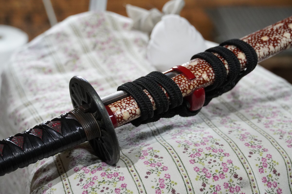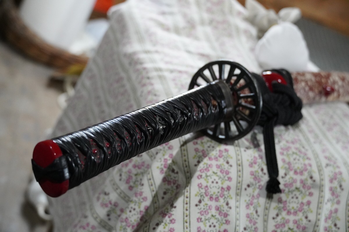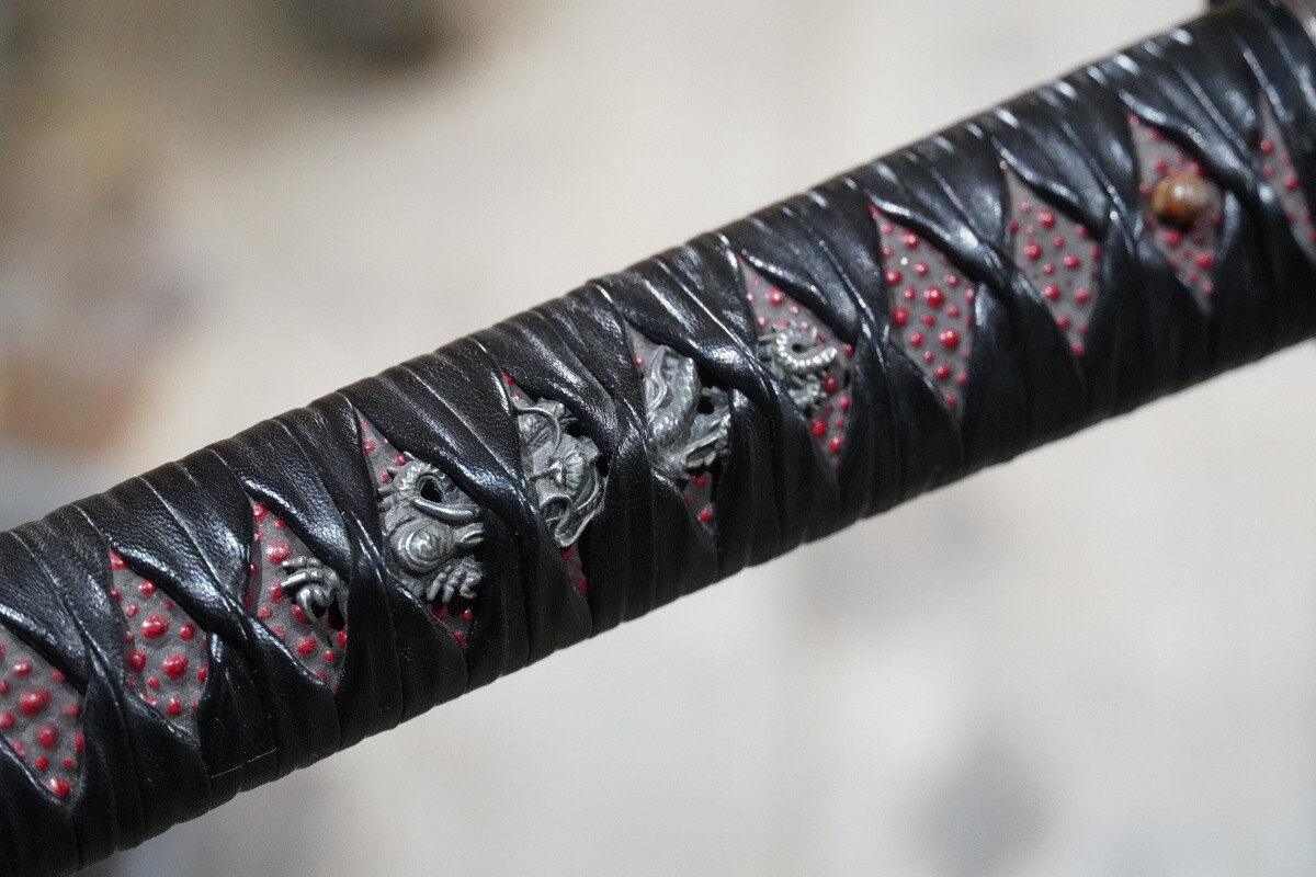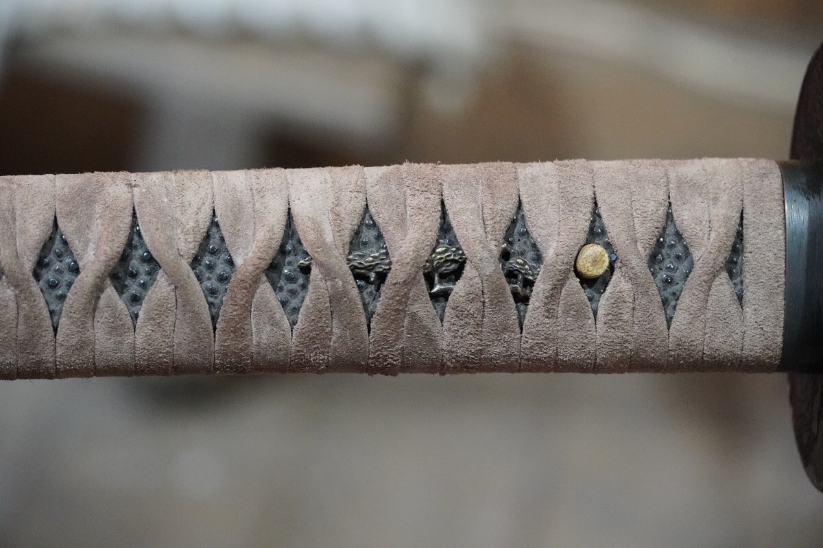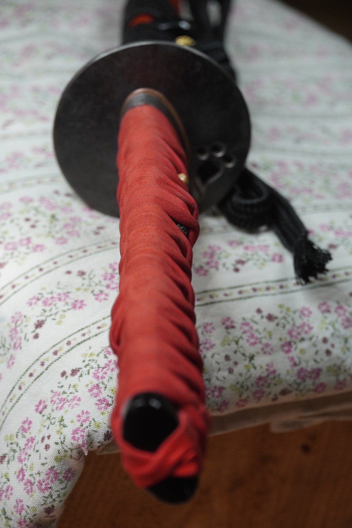 The set is a partial copy of the original set. It is a functional war set. The tsuba with a tattooed edge is made of folded steel. The leather wrapped handle is lacquered. The kashira and parts on the scabbard are made of horn and are also lacquered.