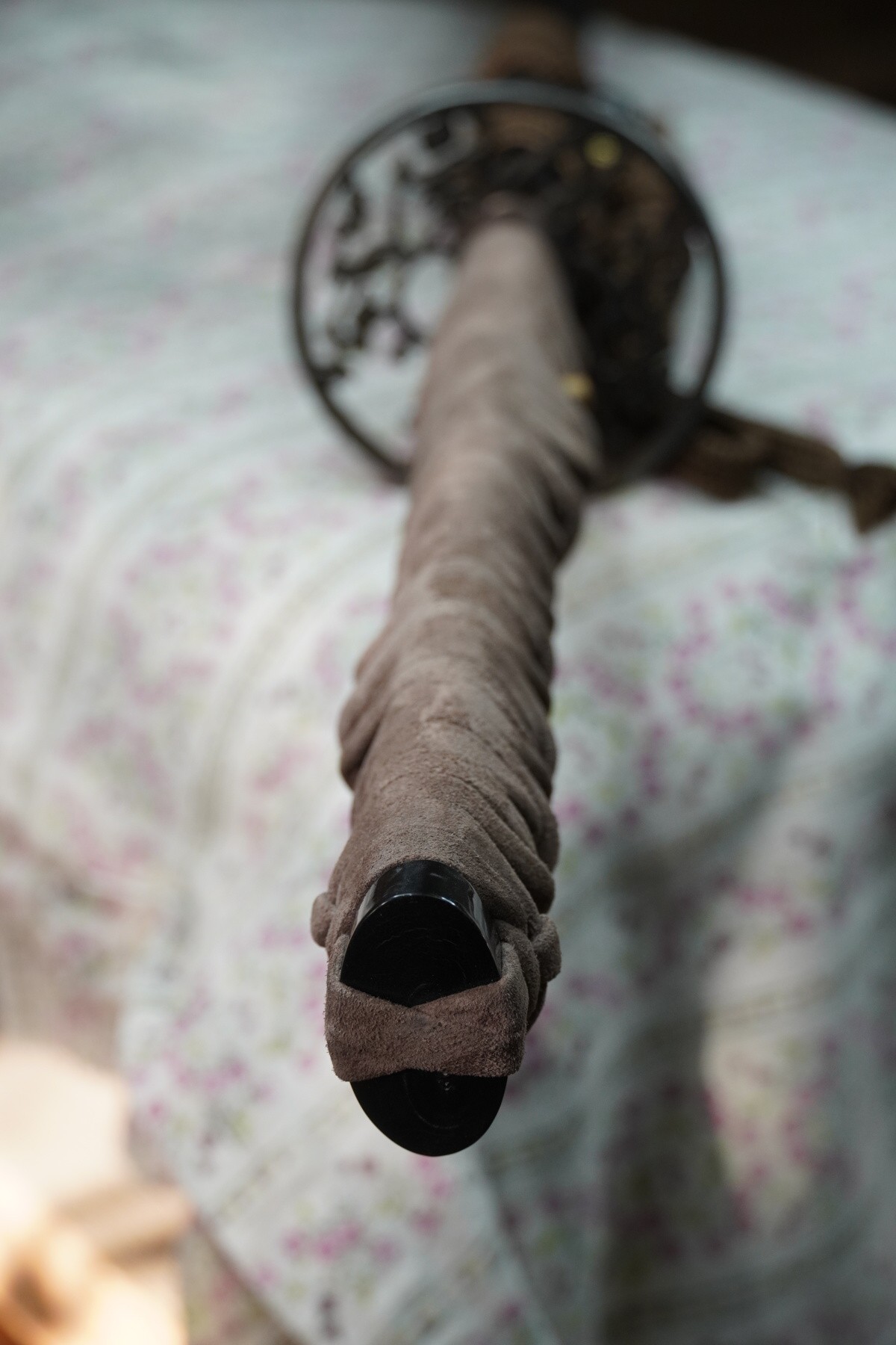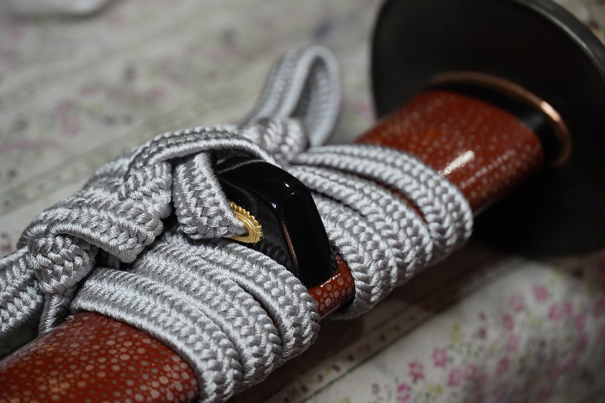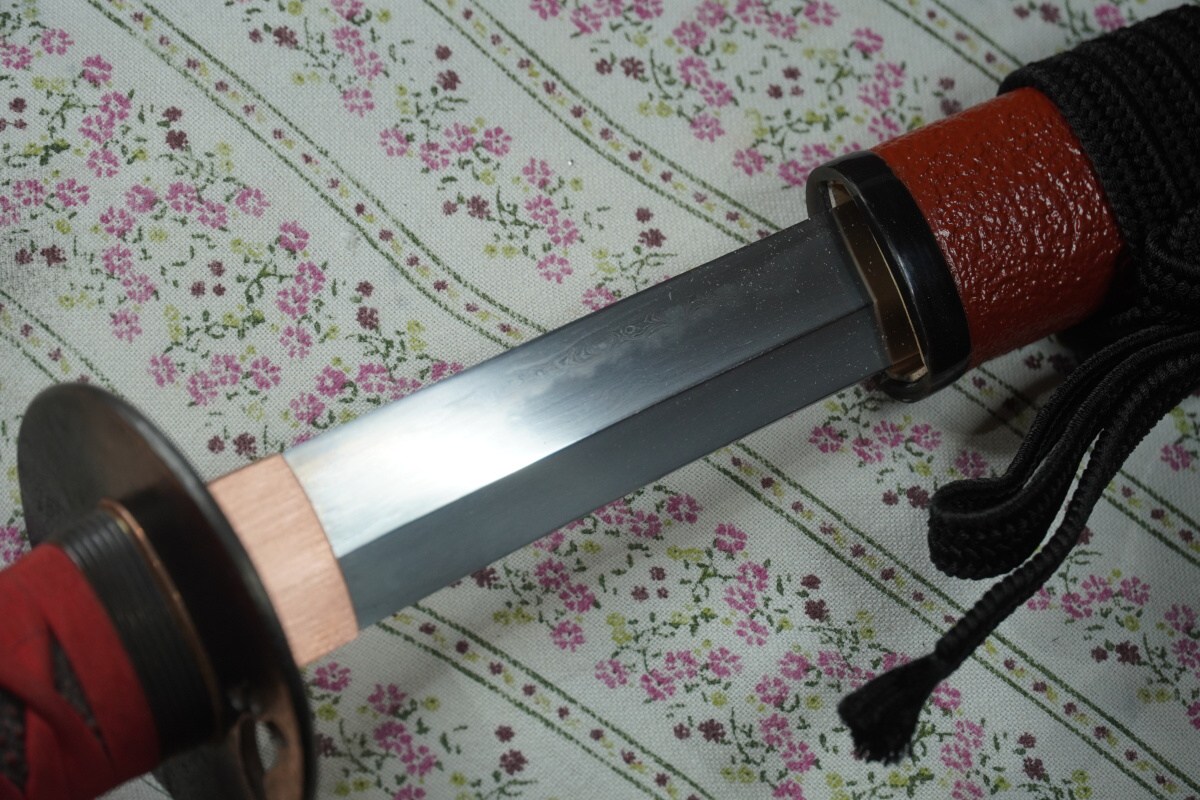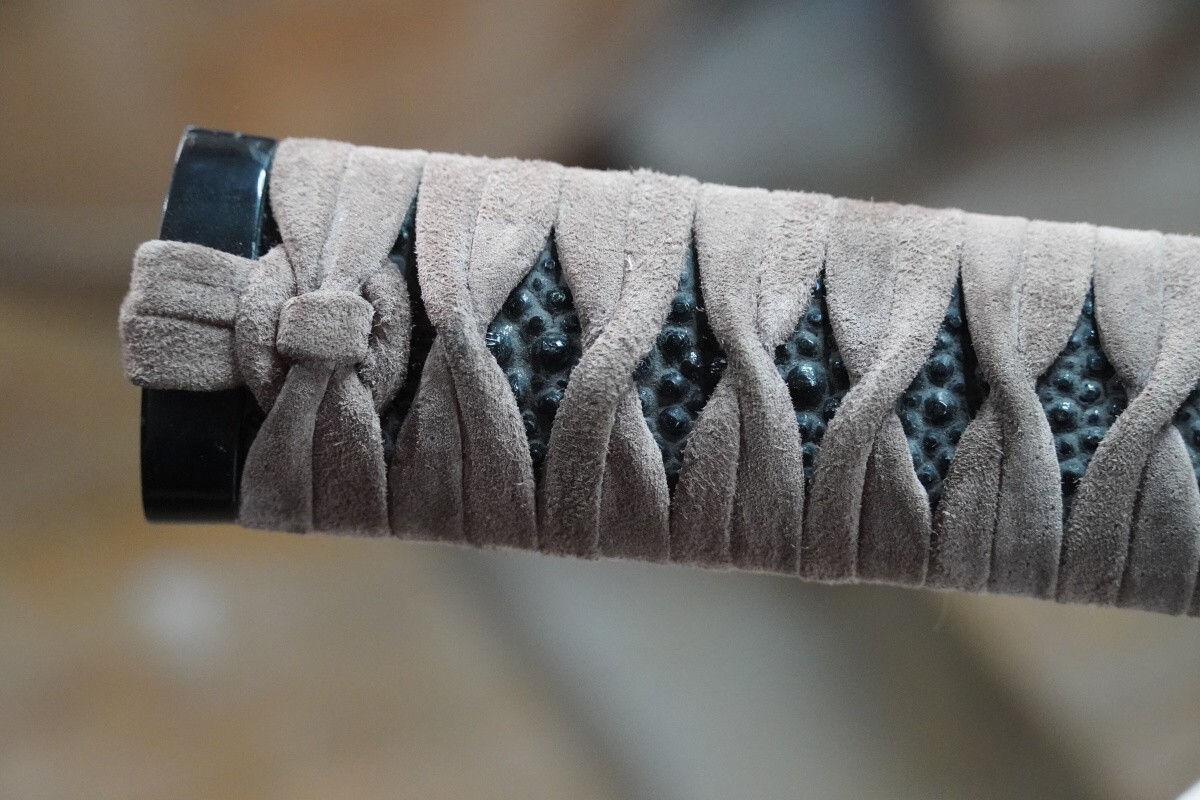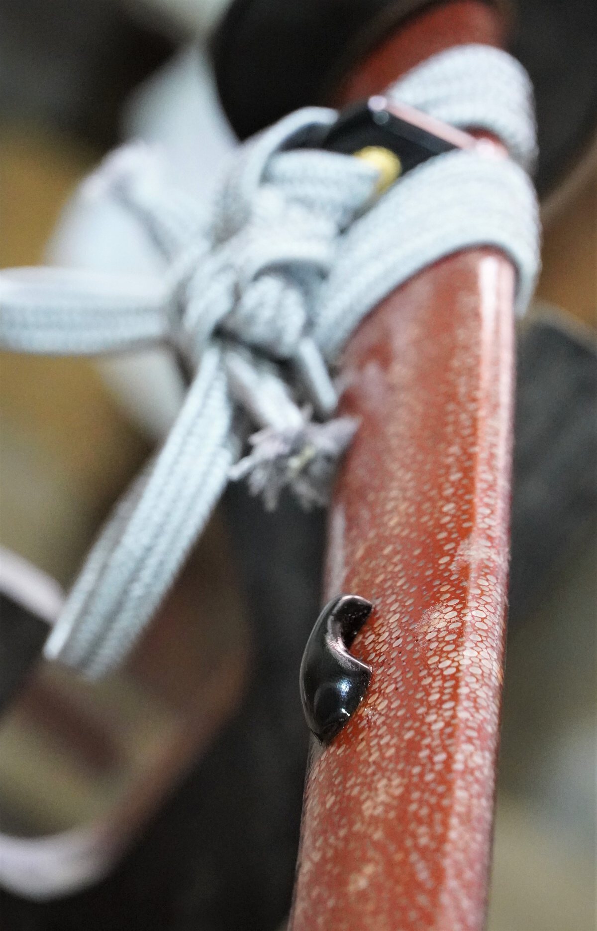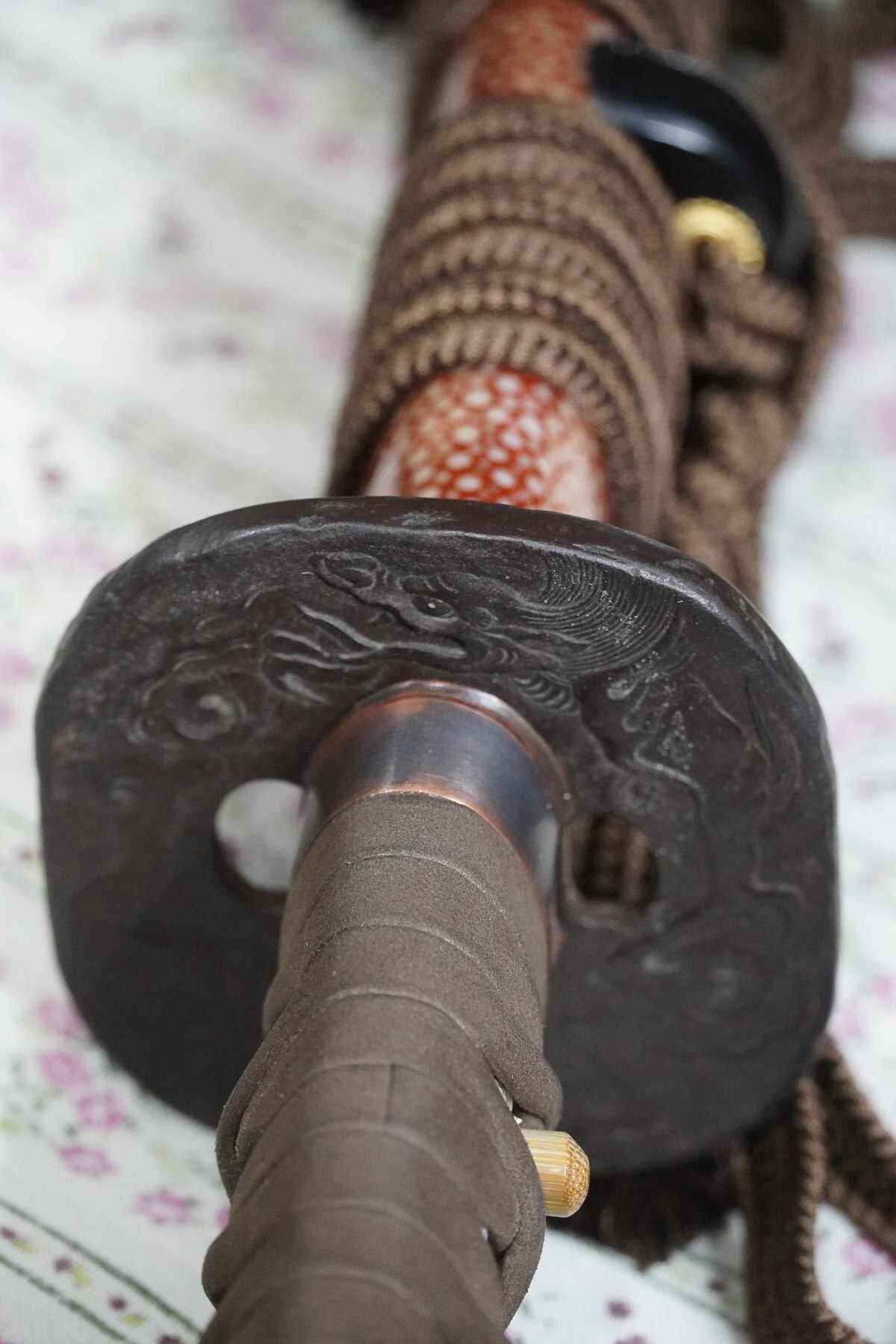 The set is a partial copy of the original set. It is a functional war set. The tsuba with a tattooed edge is made of folded steel. The leather wrapped handle is lacquered. The kashira and parts on the scabbard are made of horn and are also lacquered.