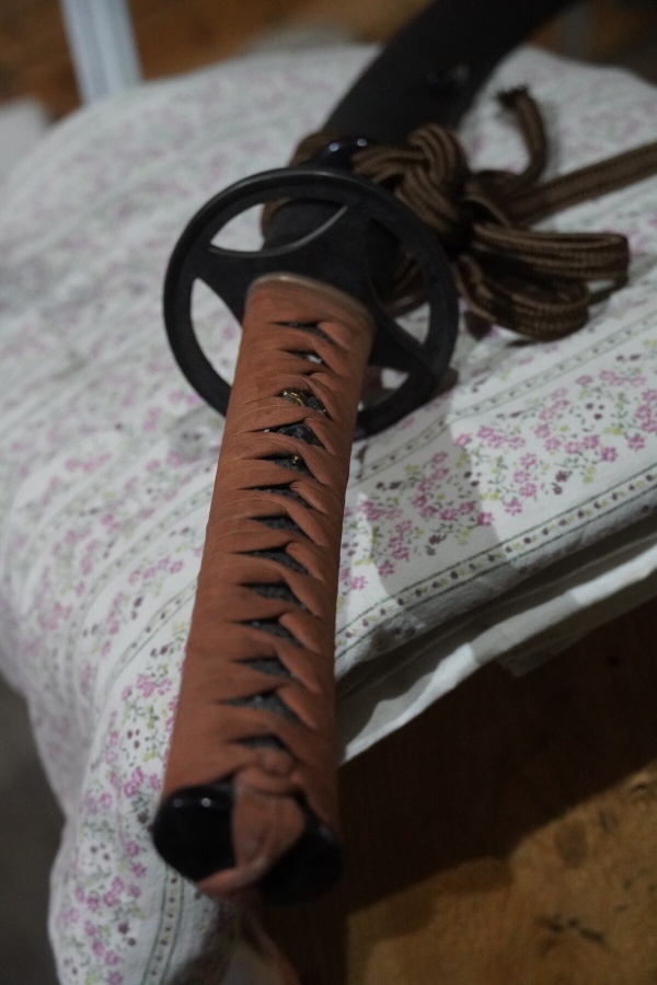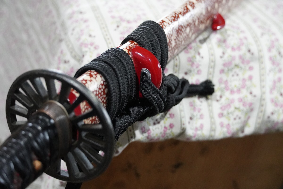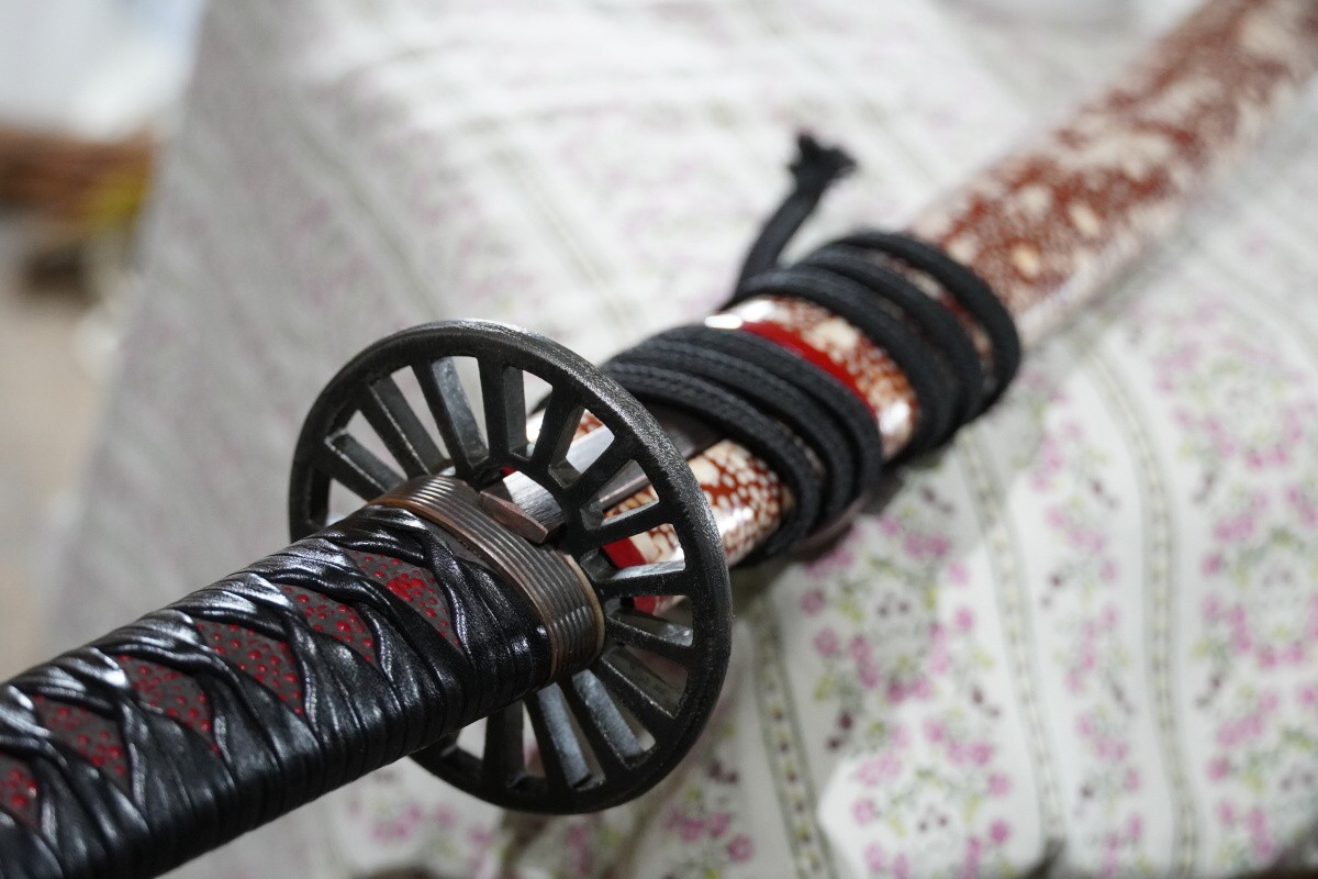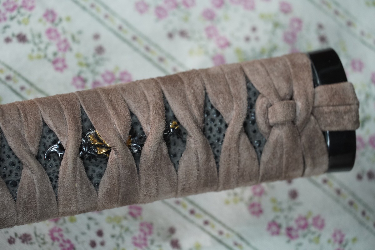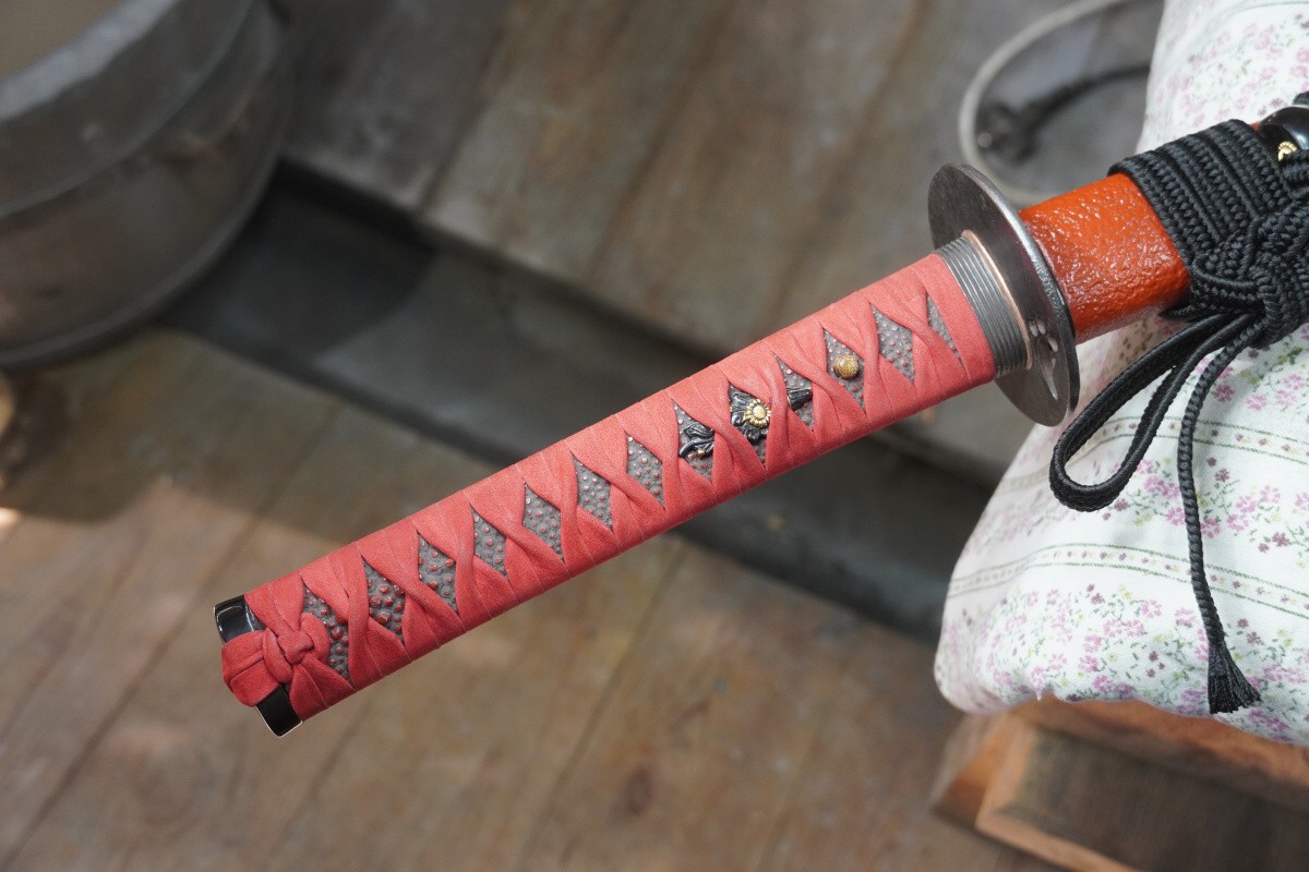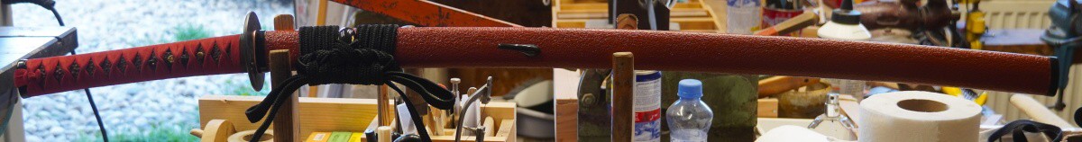 The set is a partial copy of the original set. It is a functional war set. The tsuba with a tattooed edge is made of folded steel. The leather wrapped handle is lacquered. The kashira and parts on the scabbard are made of horn and are also lacquered.