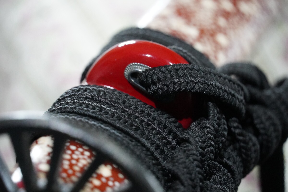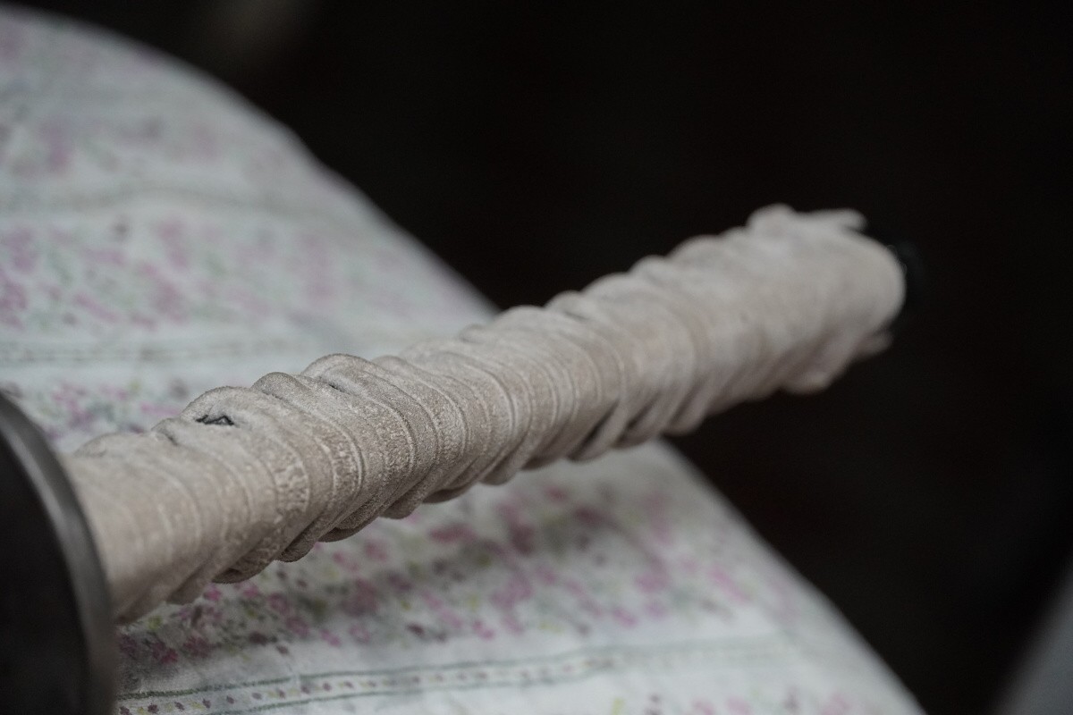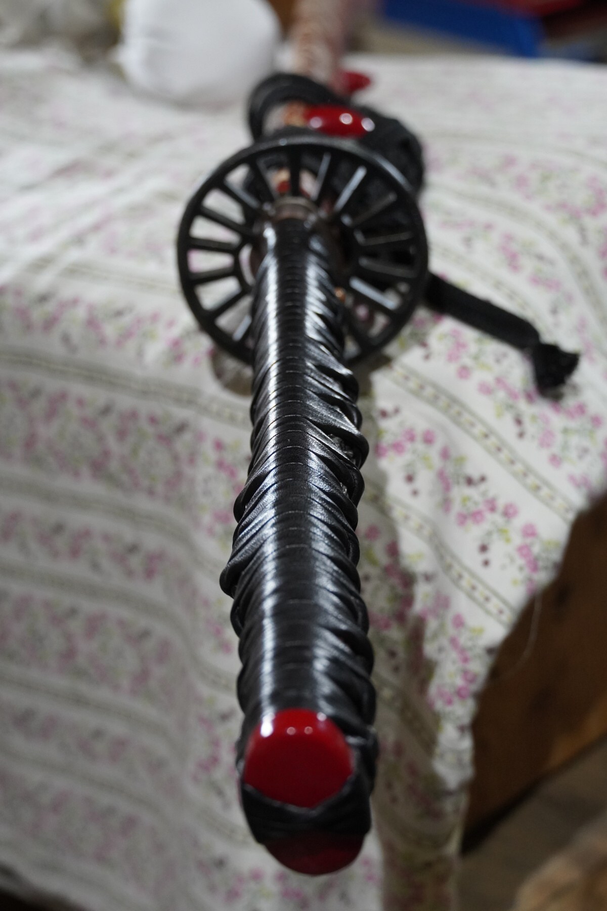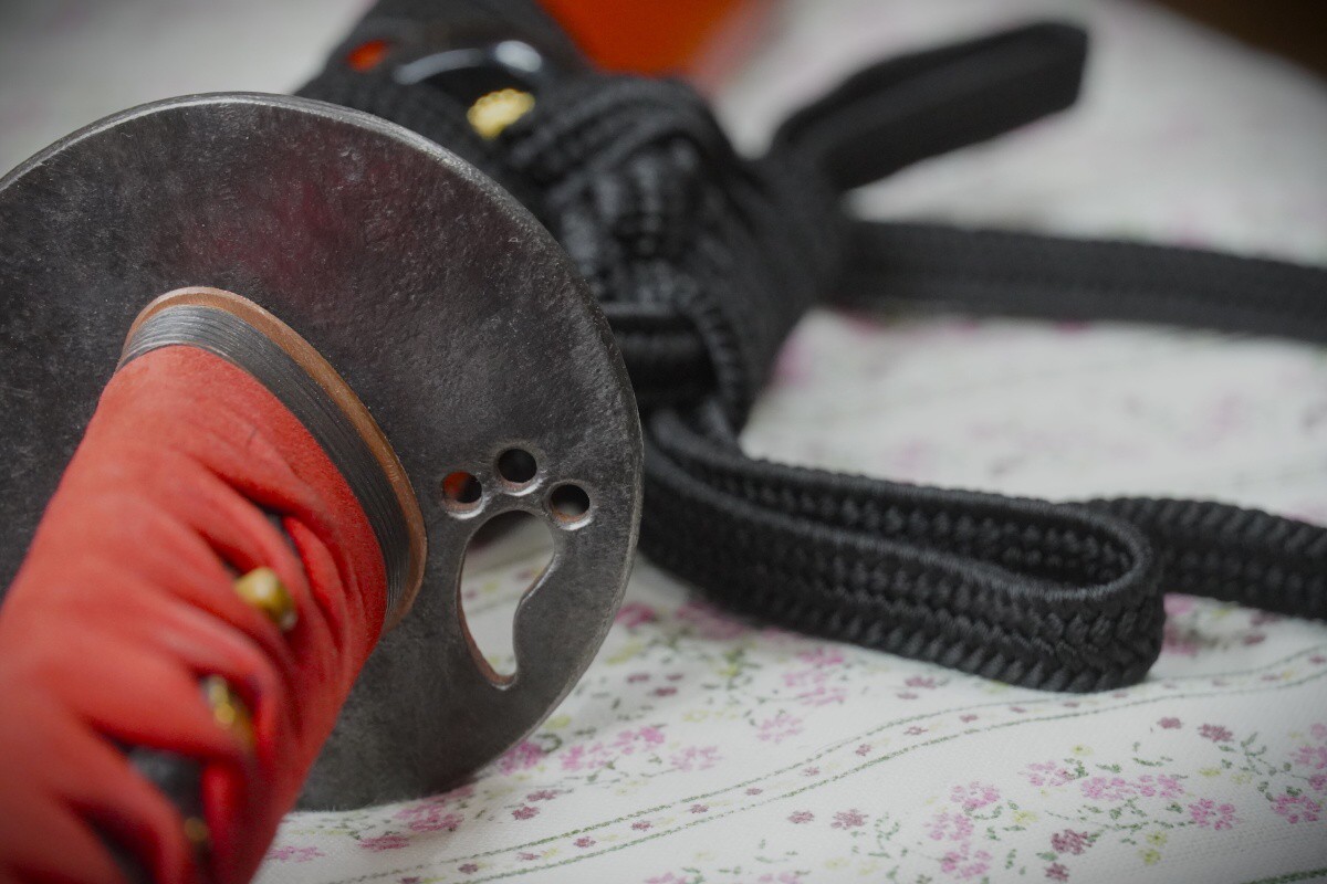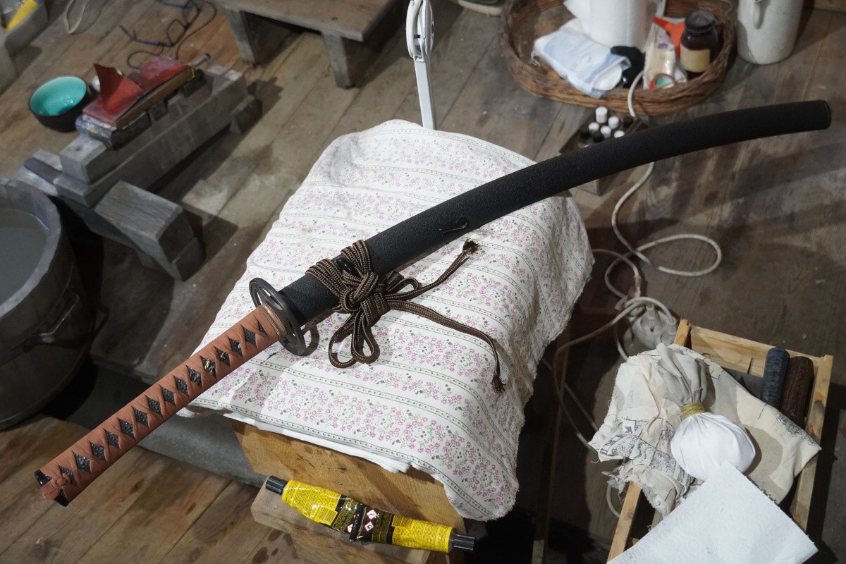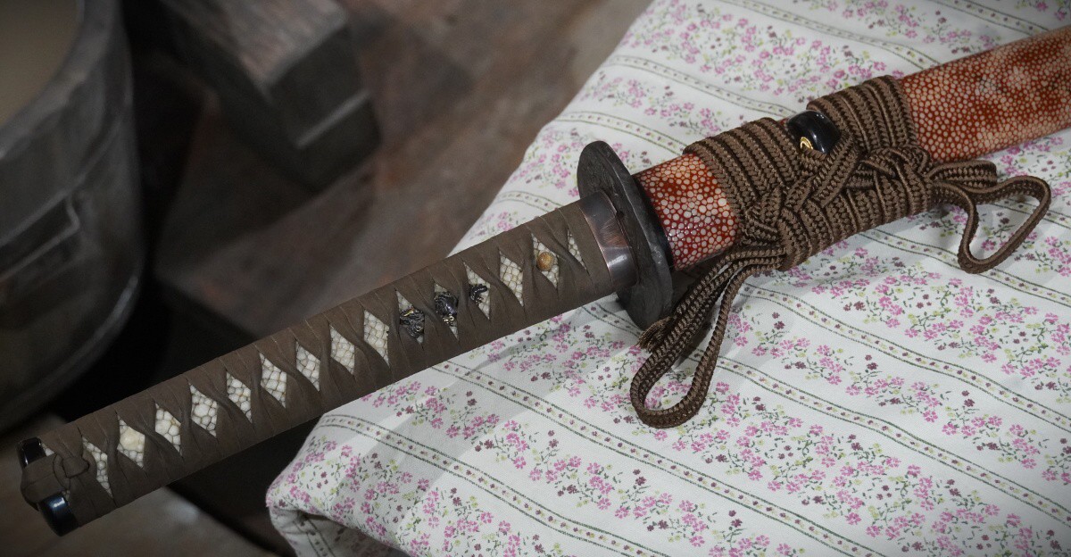 The set is a partial copy of the original set. It is a functional war set. The tsuba with a tattooed edge is made of folded steel. The leather wrapped handle is lacquered. The kashira and parts on the scabbard are made of horn and are also lacquered.