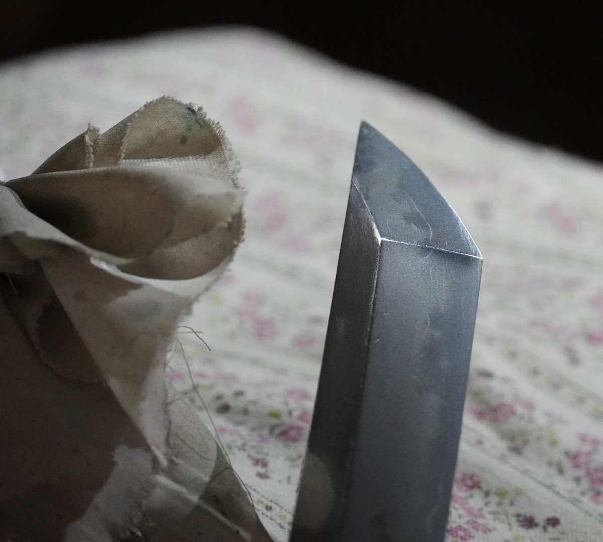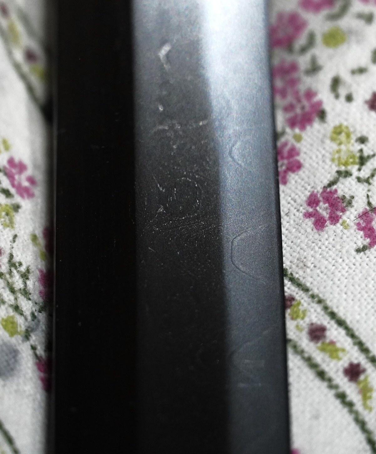 Koshirae: habaki only, two-piece, with a groove on the inner part. Tsuka semi-finished, splinter for the mandrel fills the groove.