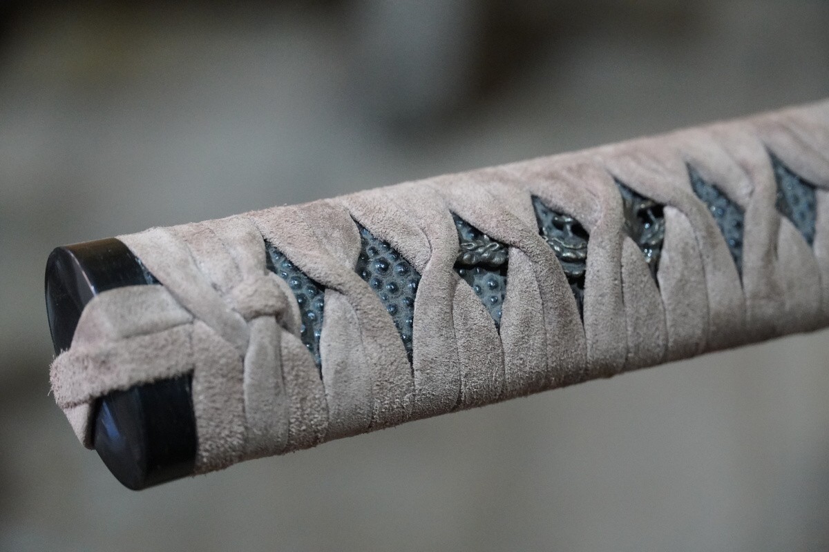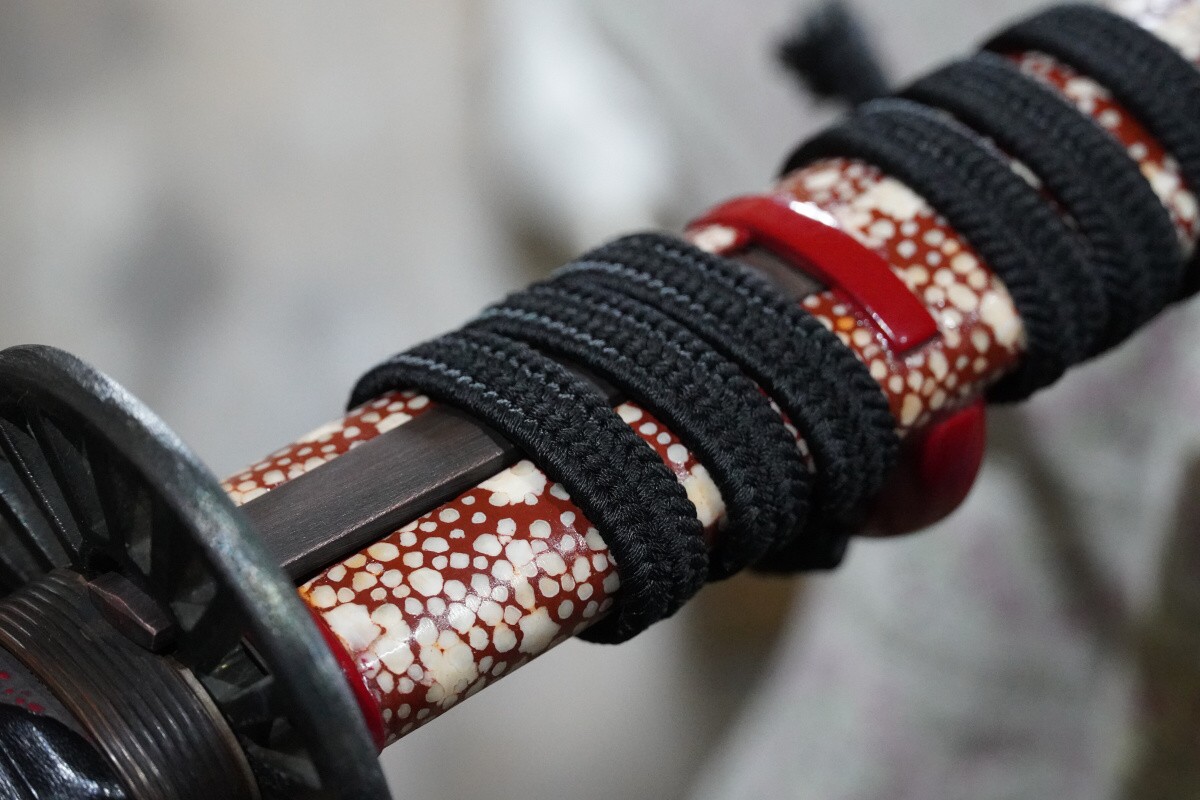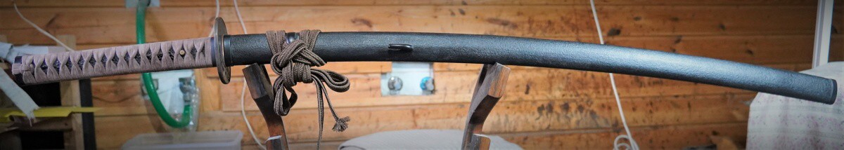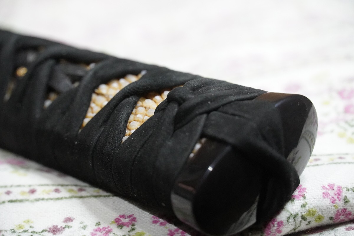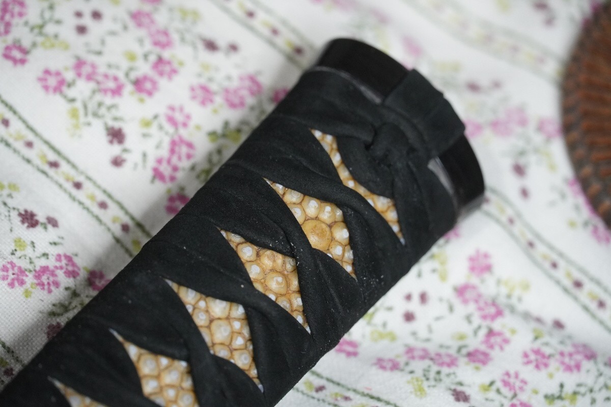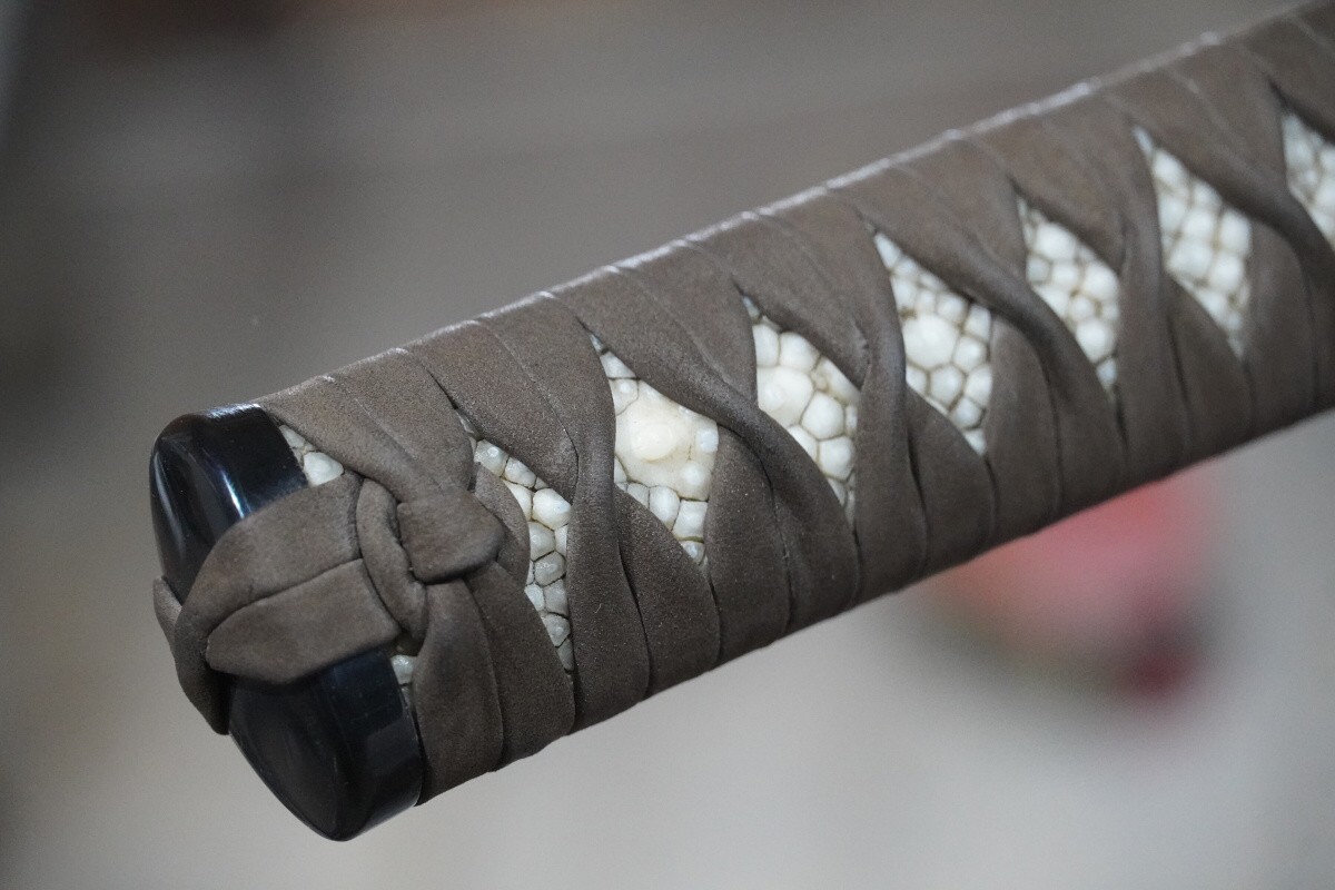 Katana in basic undecorated set in Tensho style. Cotton, silk or leather handle braid. The wooden core of the Tsuka is wrapped around with stingray leather. The stingray is then treated with a combination of lacquer and volcanic ash on the handle. The unadorned tsuba is made of folded low carbon steel. Ishime lacquer on the scabbard. The components on the saya and handle head are made of water buffalo horn.