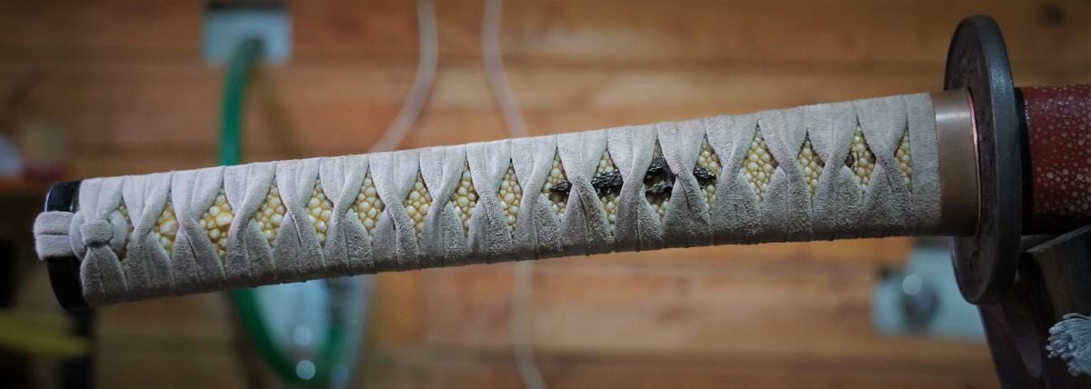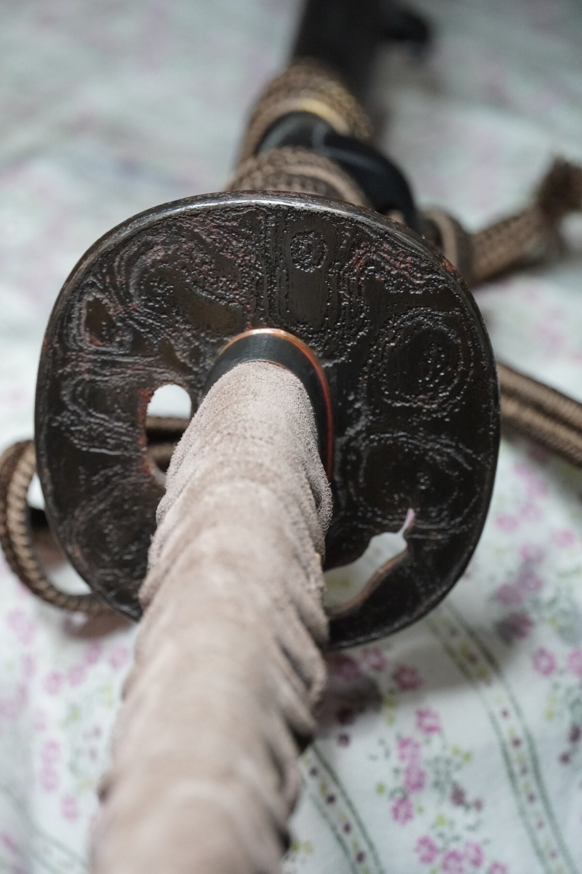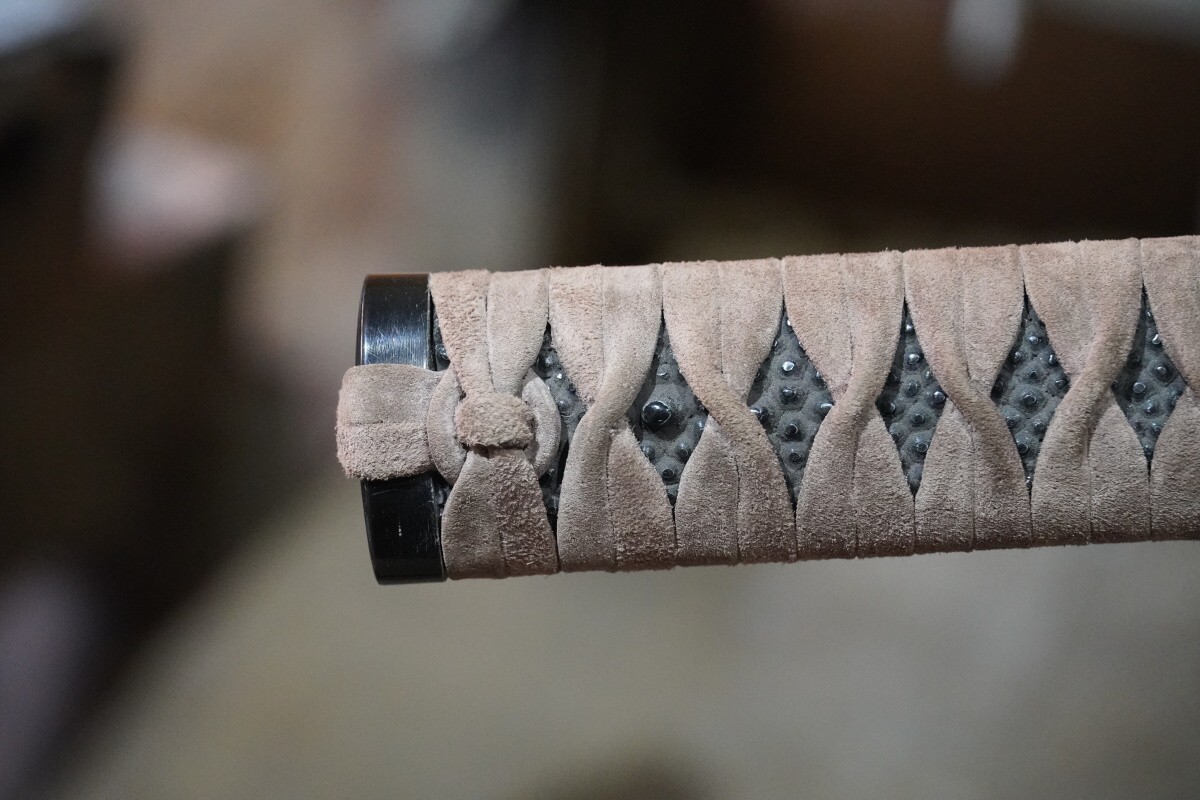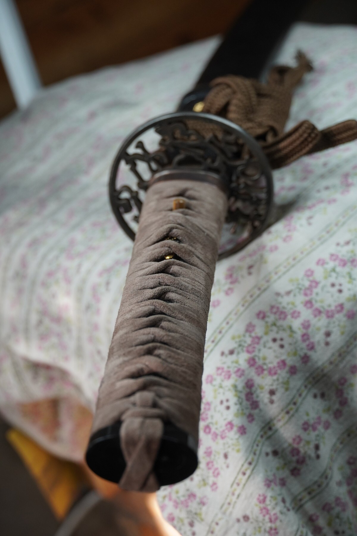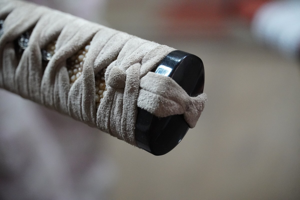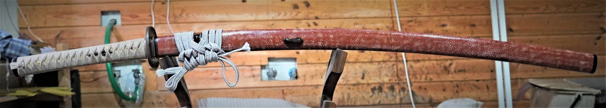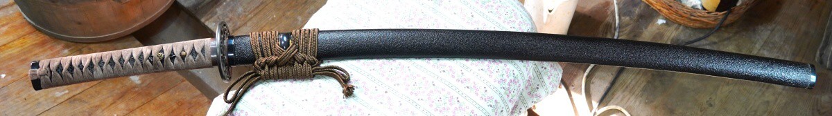 Katana in basic undecorated set in Tensho style. Cotton, silk or leather handle braid. The wooden core of the Tsuka is wrapped around with stingray leather. The stingray is then treated with a combination of lacquer and volcanic ash on the handle. The unadorned tsuba is made of folded low carbon steel. Ishime lacquer on the scabbard. The components on the saya and handle head are made of water buffalo horn.