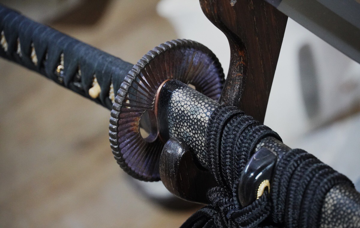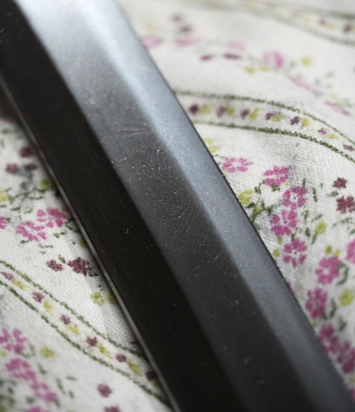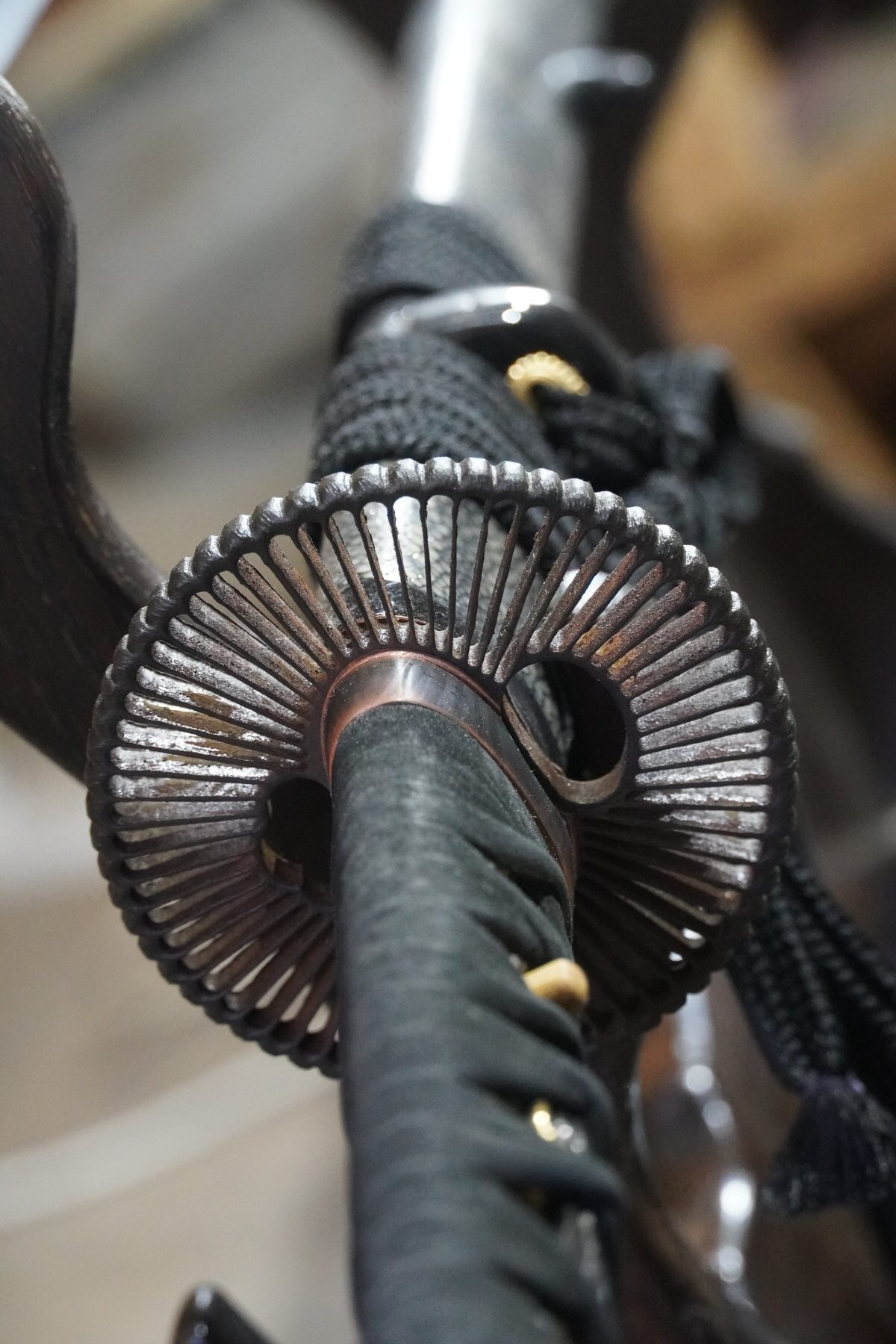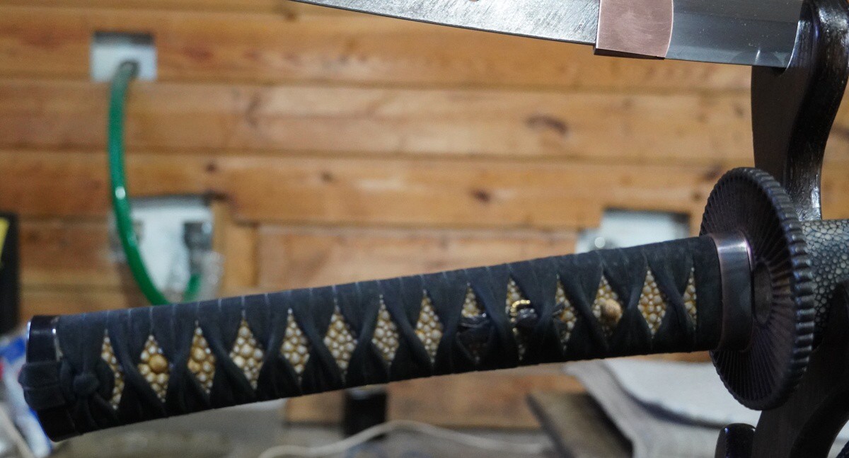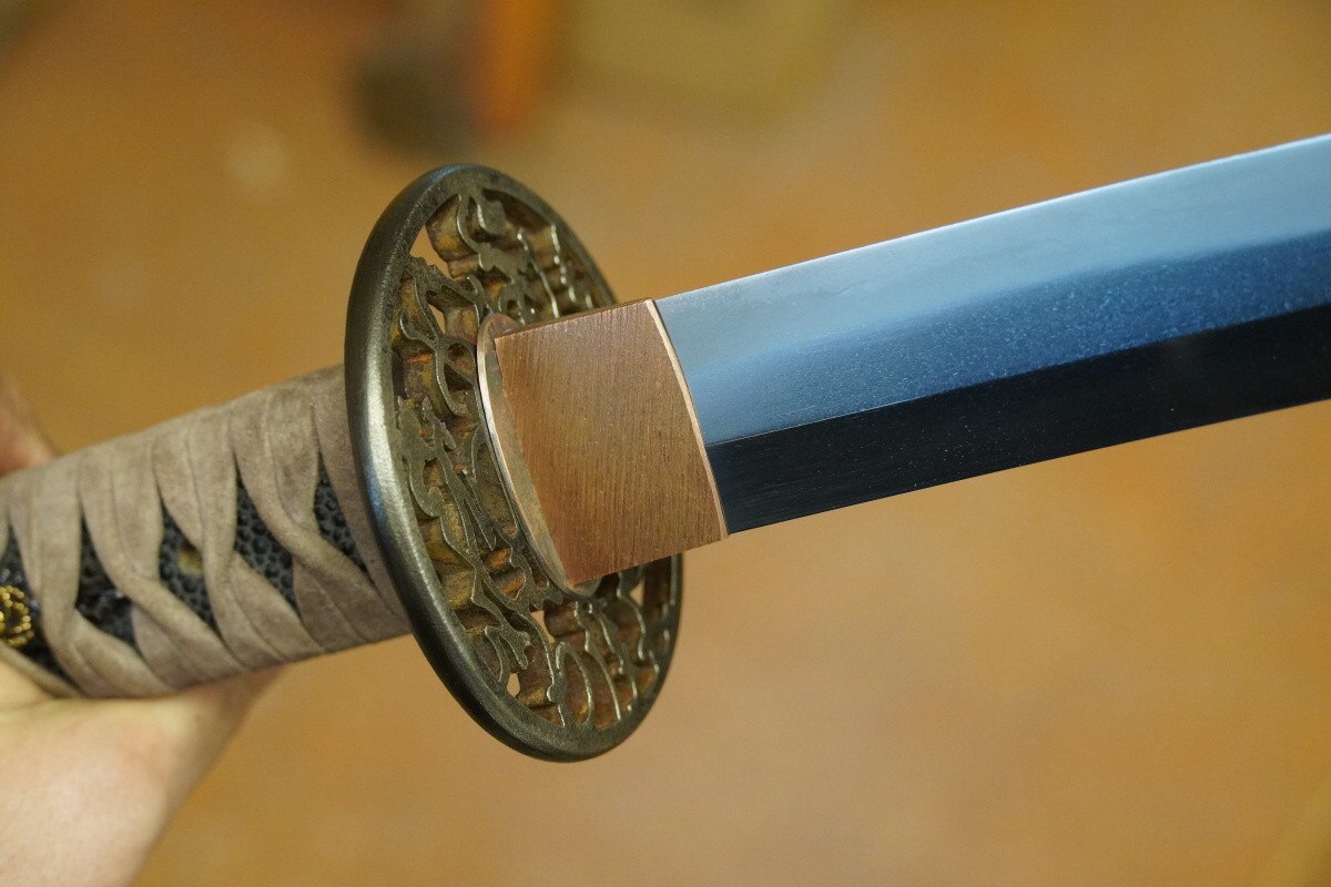Katana in basic undecorated set in Tensho style. Cotton, silk or leather handle braid. The wooden core of the Tsuka is wrapped around with stingray leather. The stingray is then treated with a combination of lacquer and volcanic ash on the handle. The unadorned tsuba is made of folded low carbon steel. Ishime lacquer on the scabbard. The components on the saya and handle head are made of water buffalo horn.