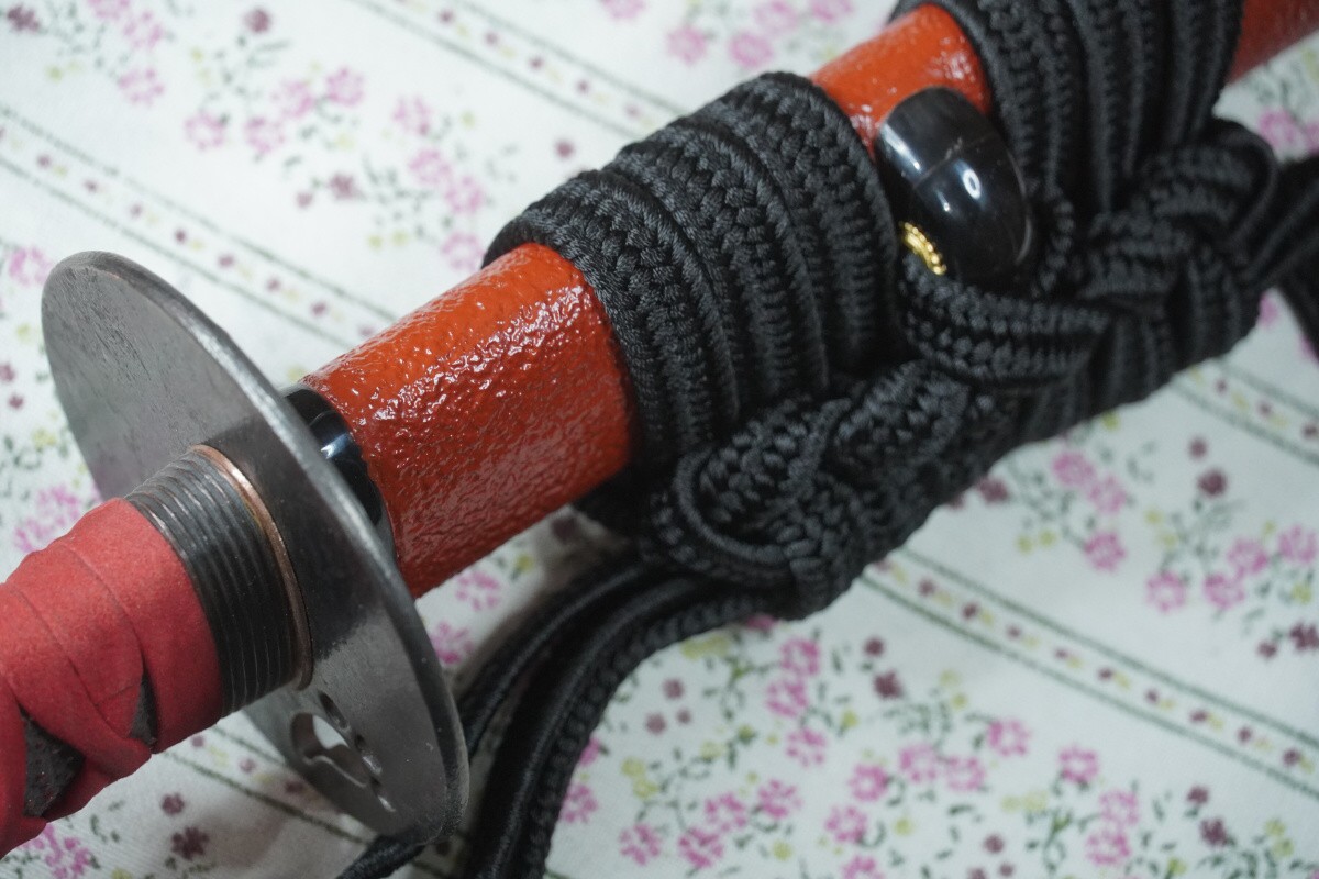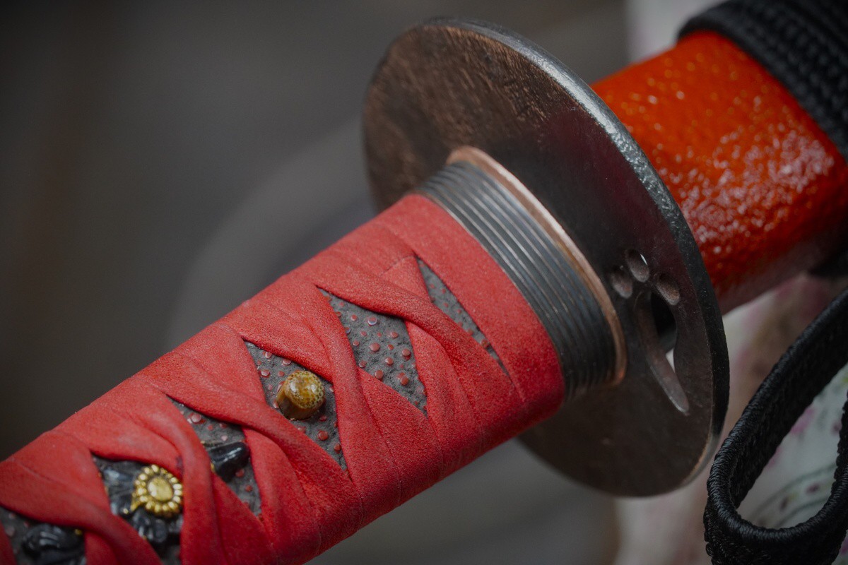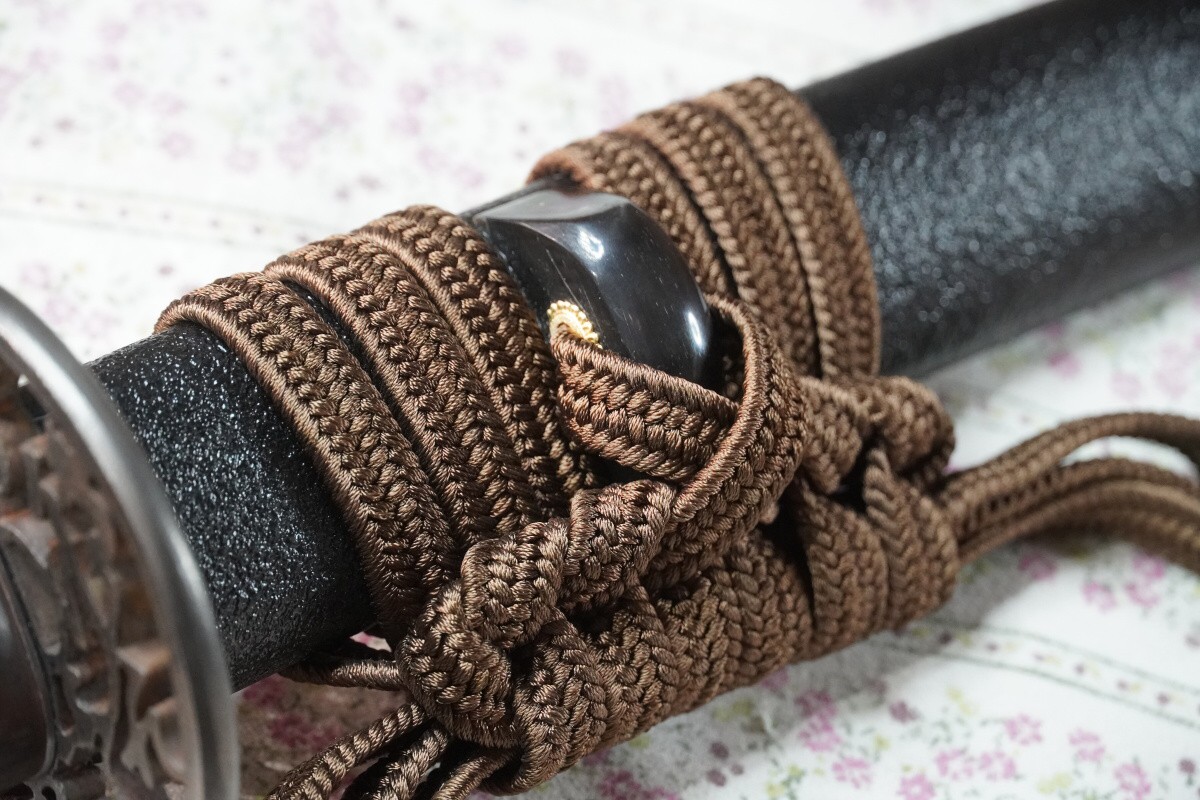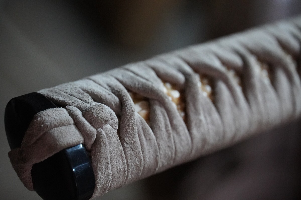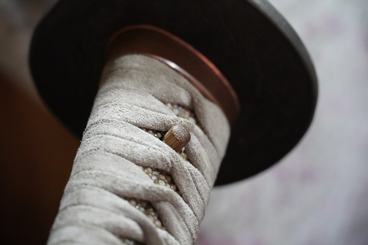 Katana in basic undecorated set in Tensho style. Cotton, silk or leather handle braid. The wooden core of the Tsuka is wrapped around with stingray leather. The stingray is then treated with a combination of lacquer and volcanic ash on the handle. The unadorned tsuba is made of folded low carbon steel. Ishime lacquer on the scabbard. The components on the saya and handle head are made of water buffalo horn.