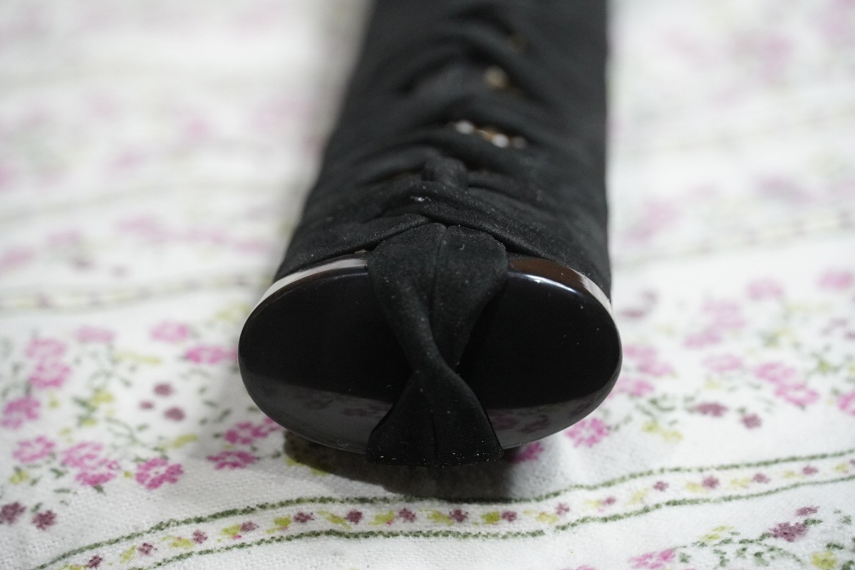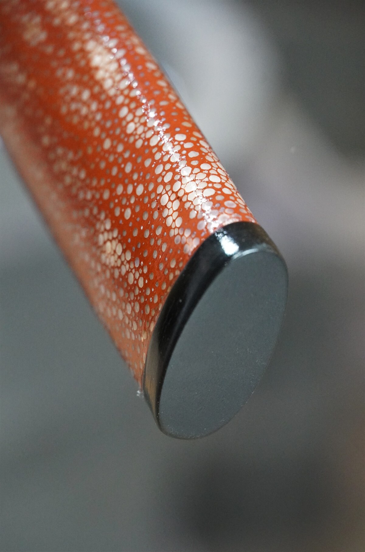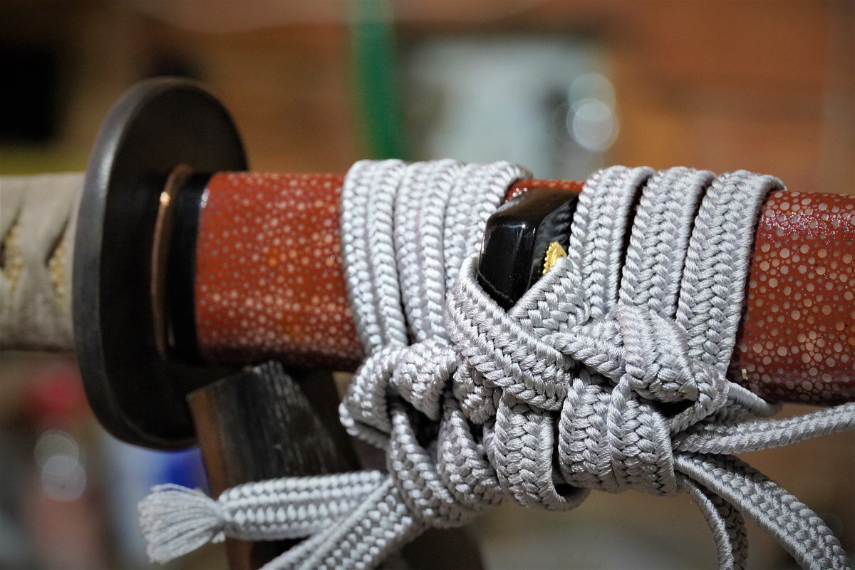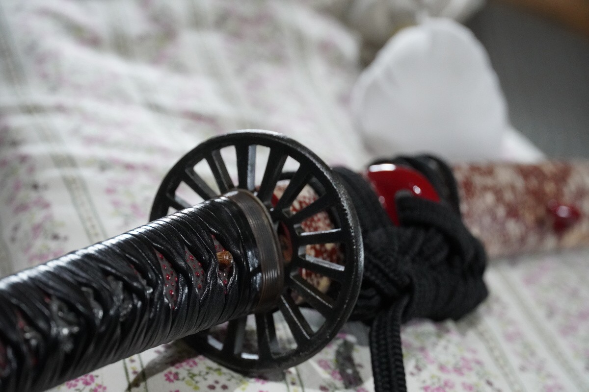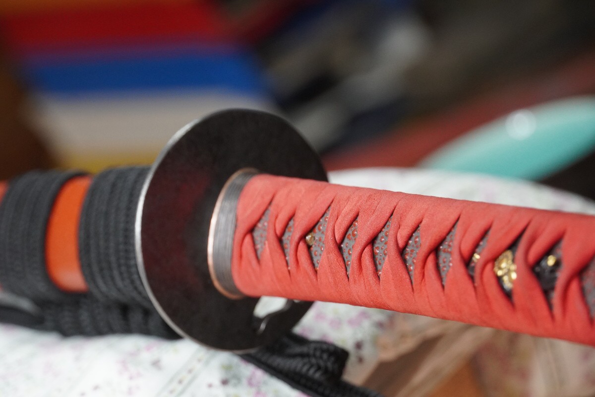 Katana in basic undecorated set in Tensho style. Cotton, silk or leather handle braid. The wooden core of the Tsuka is wrapped around with stingray leather. The stingray is then treated with a combination of lacquer and volcanic ash on the handle. The unadorned tsuba is made of folded low carbon steel. Ishime lacquer on the scabbard. The components on the saya and handle head are made of water buffalo horn.