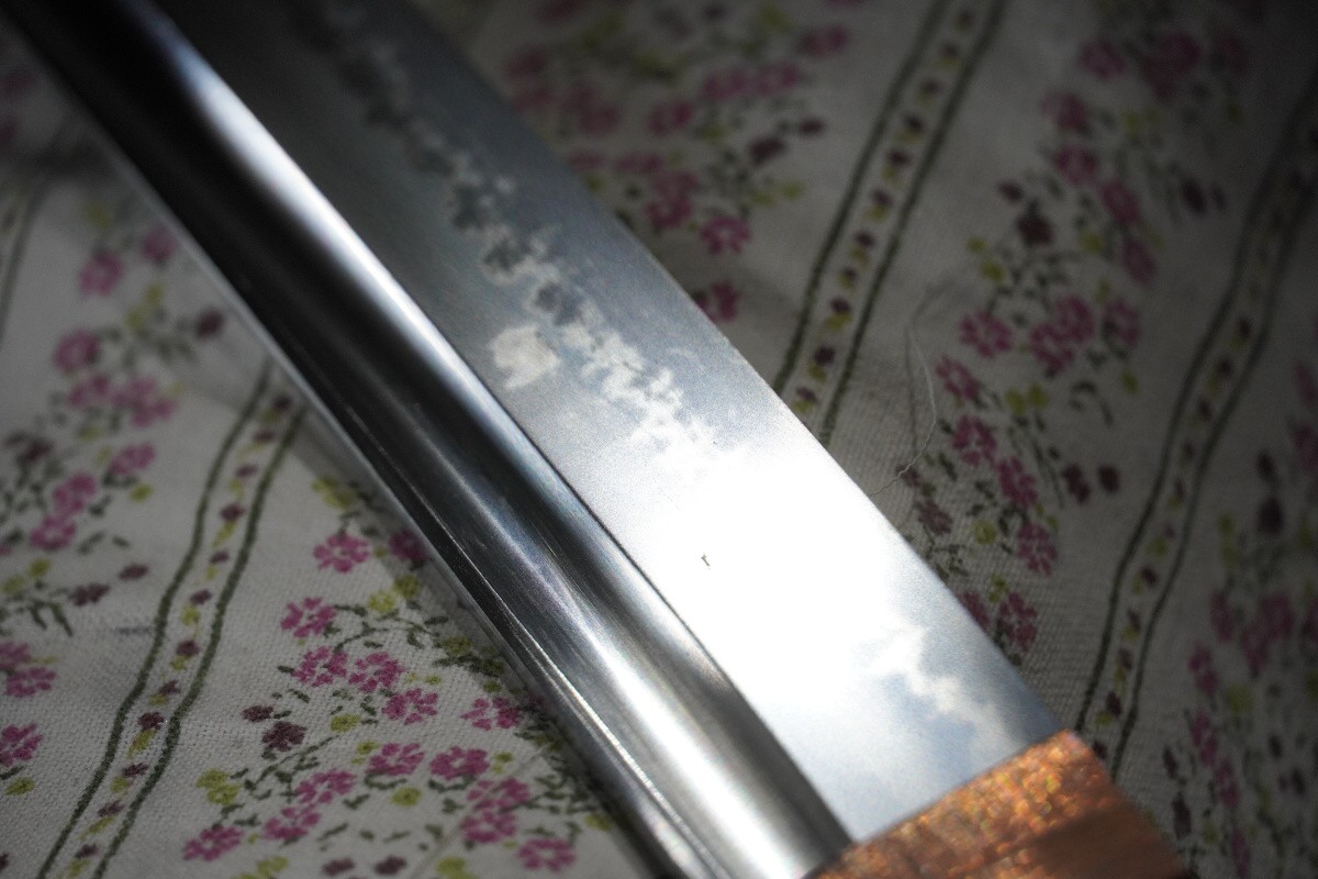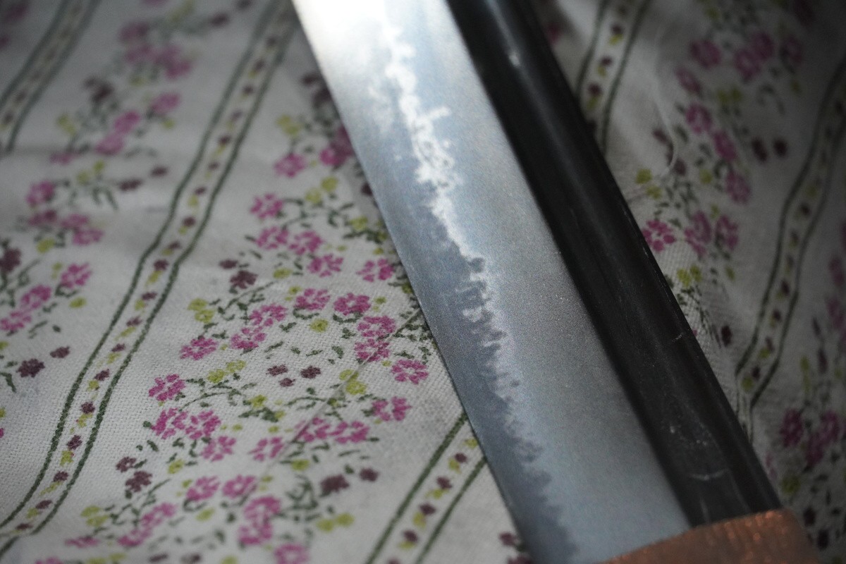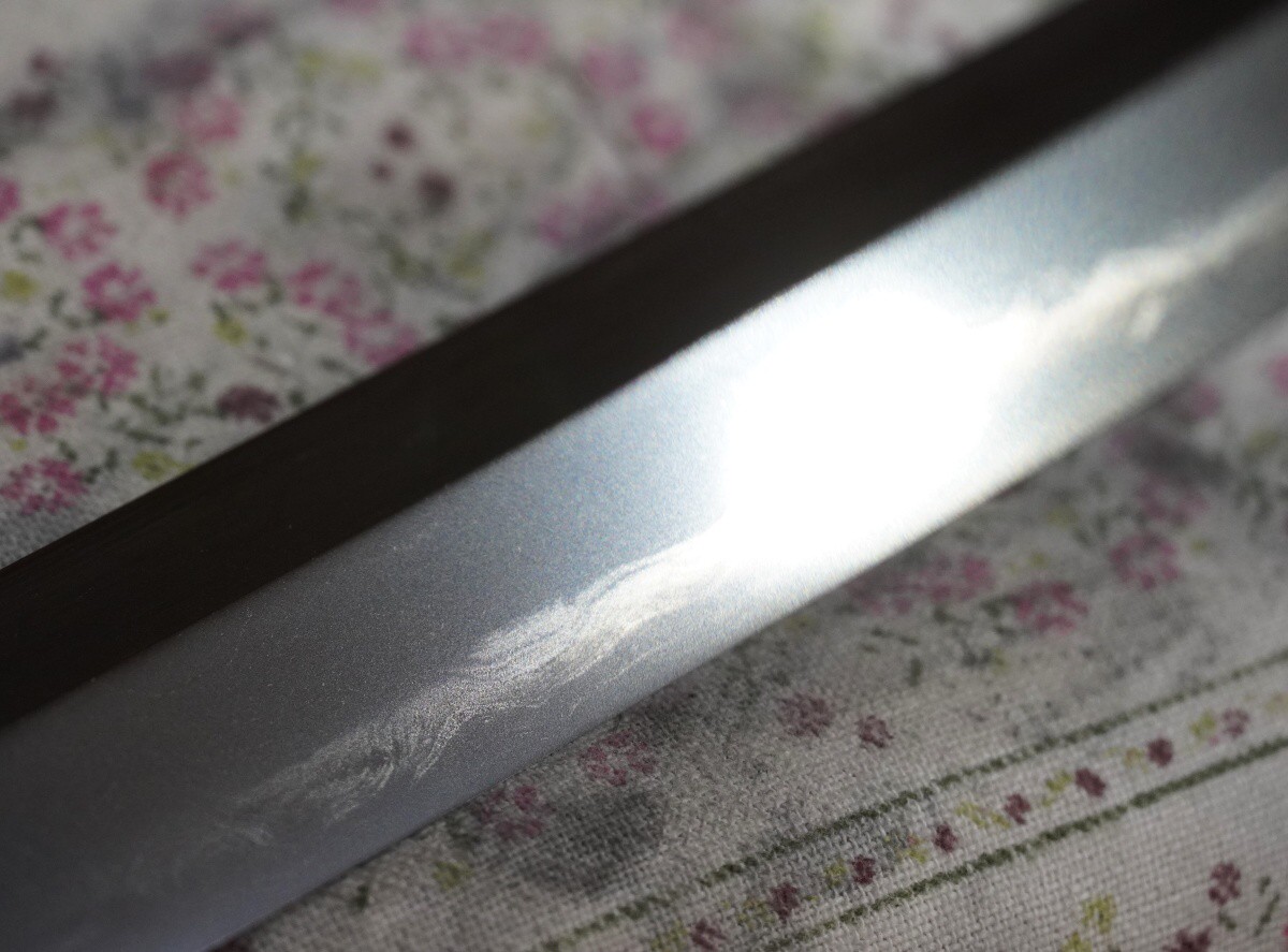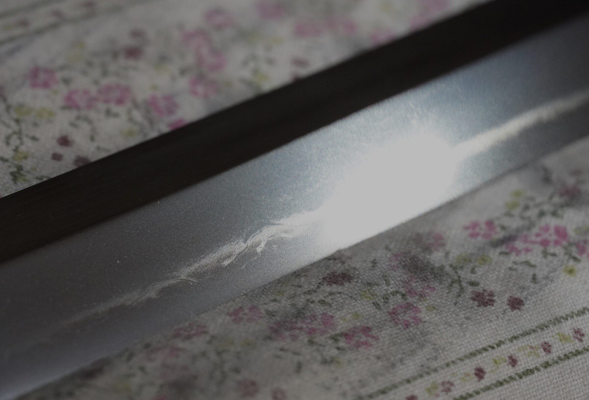 Sunobi tanto. Nambokucho style, hira zukuri, Bizen. Nagasa approx. 31cm. Steel combination of tamahagane /oroshigane own production. Jigane itame. Hamon ko-choji accompanied by nie utsuri (bo-utsuri).