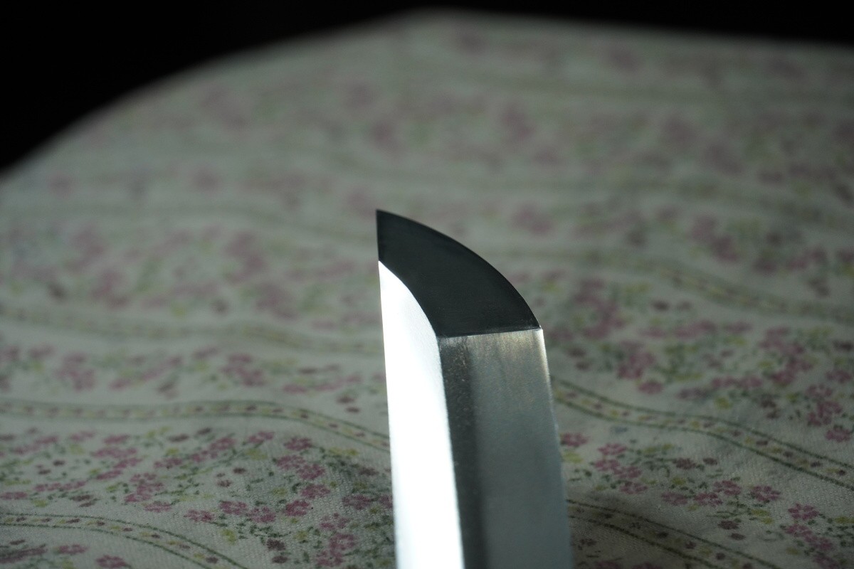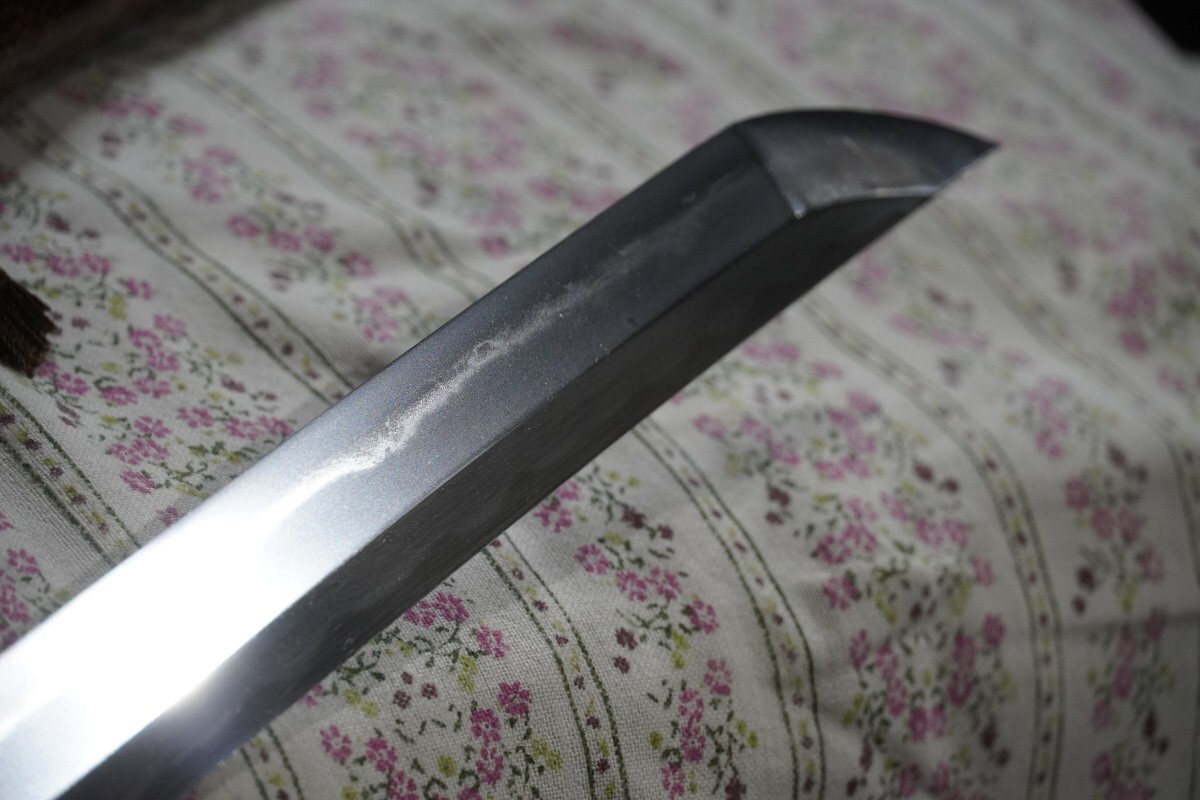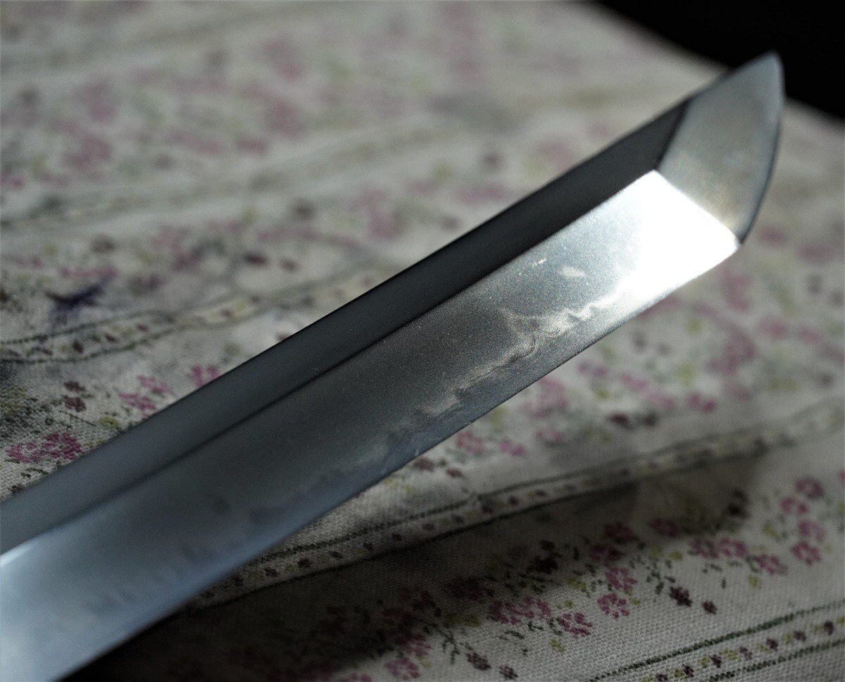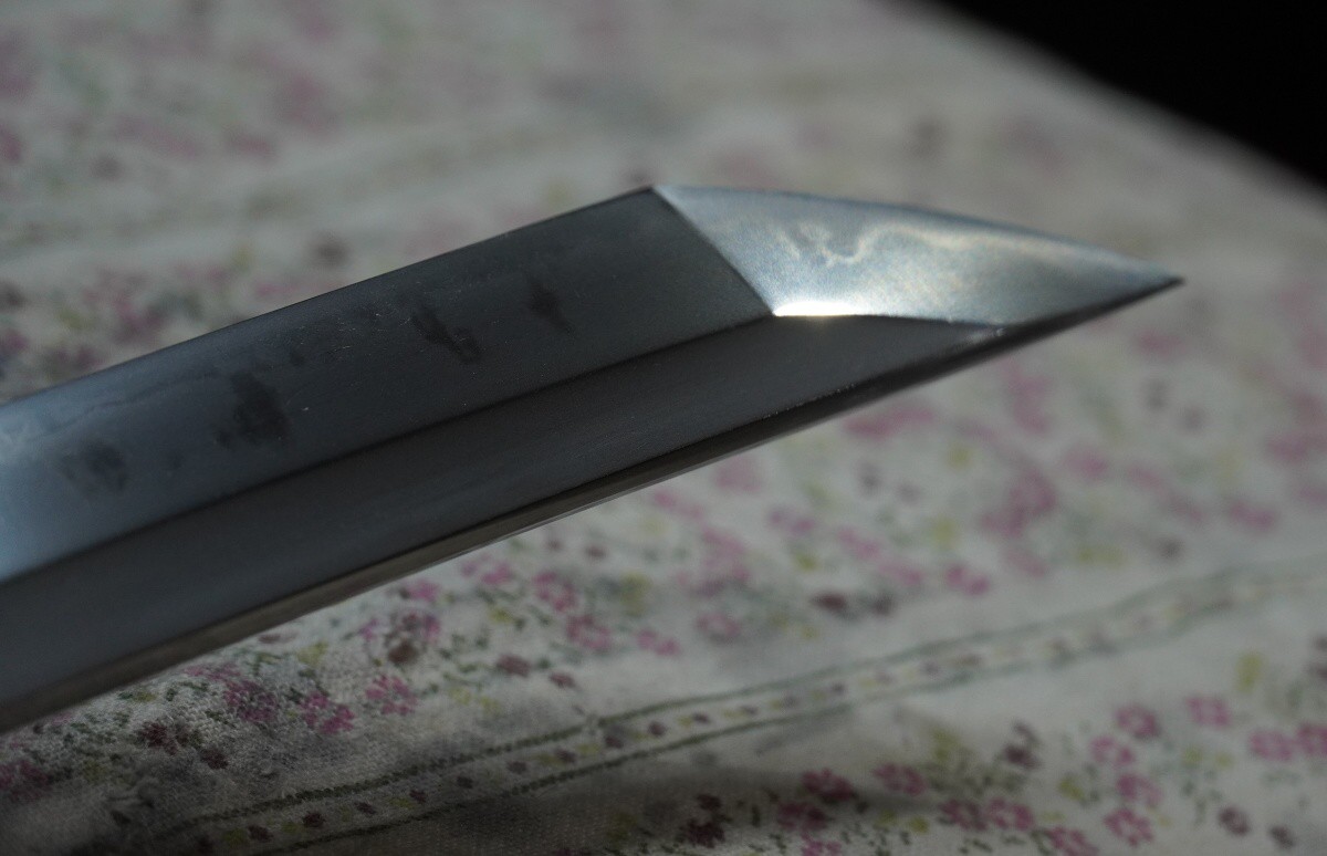 Sunobi tanto. Nambokucho style, hira zukuri, Bizen. Nagasa approx. 31cm. Steel combination of tamahagane /oroshigane own production. Jigane itame. Hamon ko-choji accompanied by nie utsuri (bo-utsuri).