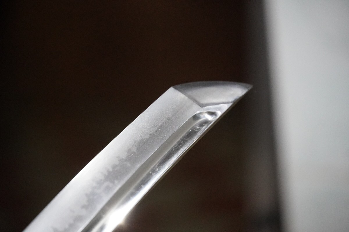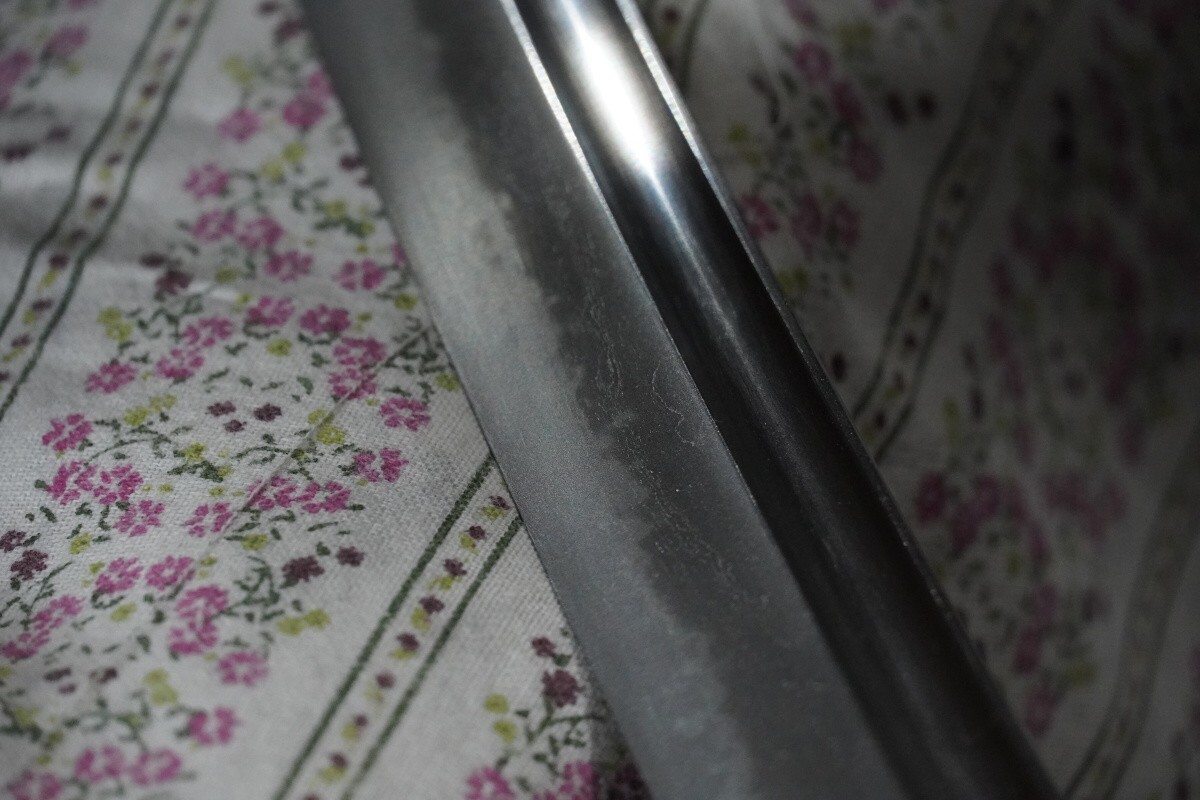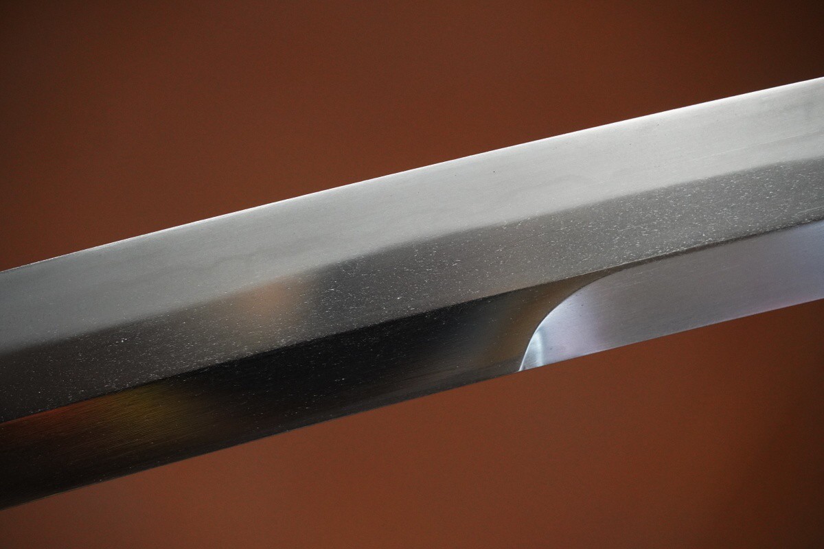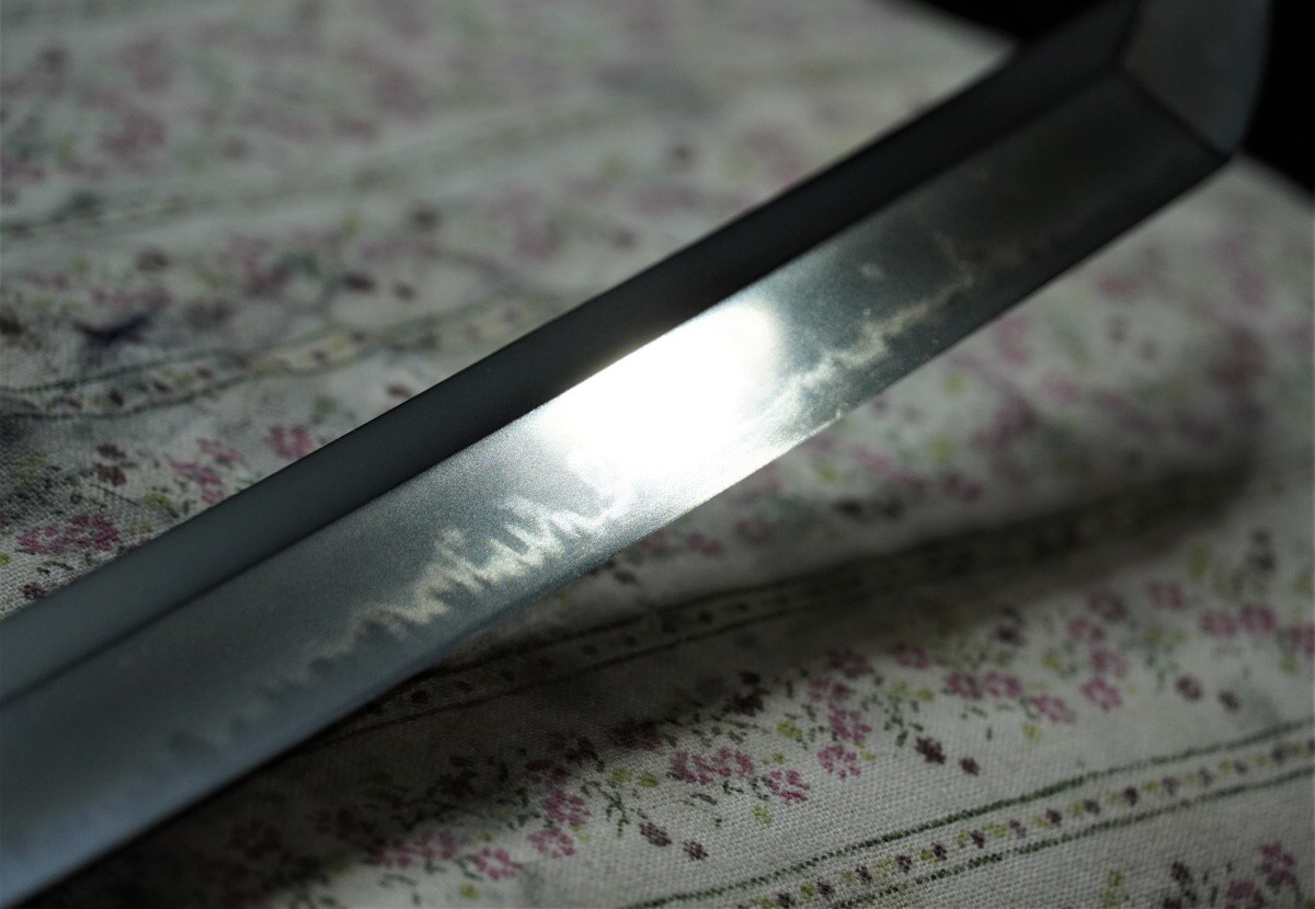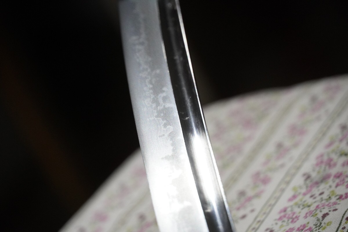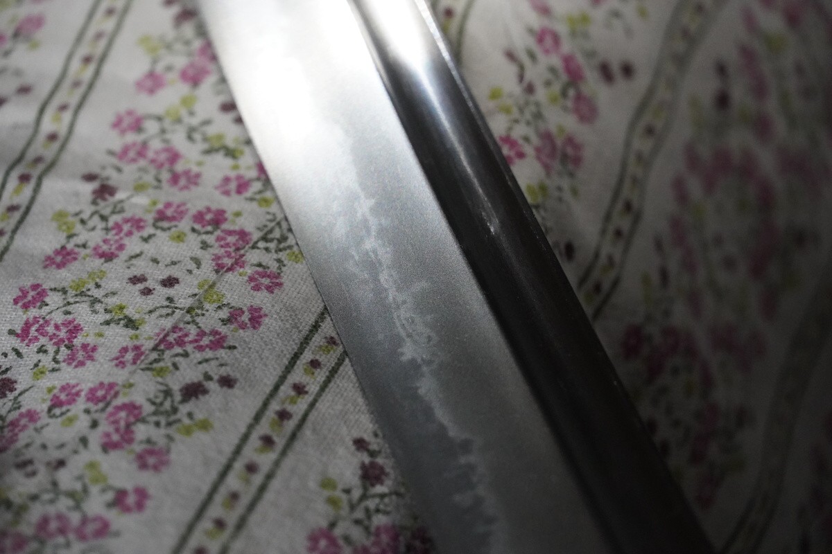 Katana, wide blade in the style of the early Nambokucho period. Nagasa approx. 72cm. Bizen style. Steel mix tamahagane/oroshigane, Hon san mai construction, hada itame, mokume. Hamon ko-choji, choji, sunagashi, kinsuji. Beautiful wide and shining nioiguchi line. Tempered without paste.
