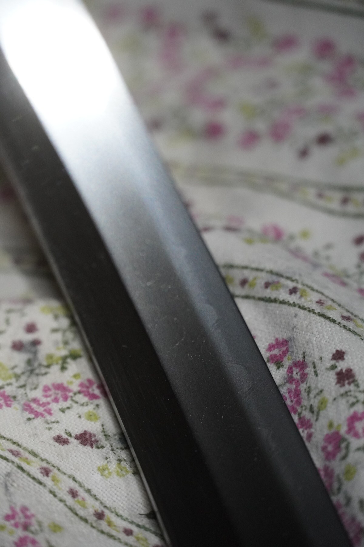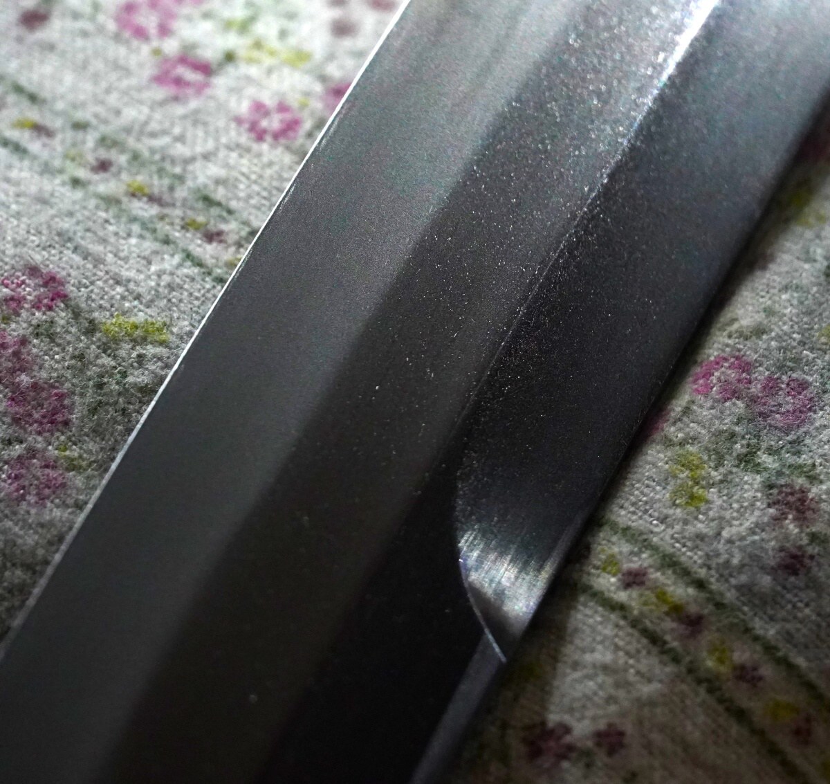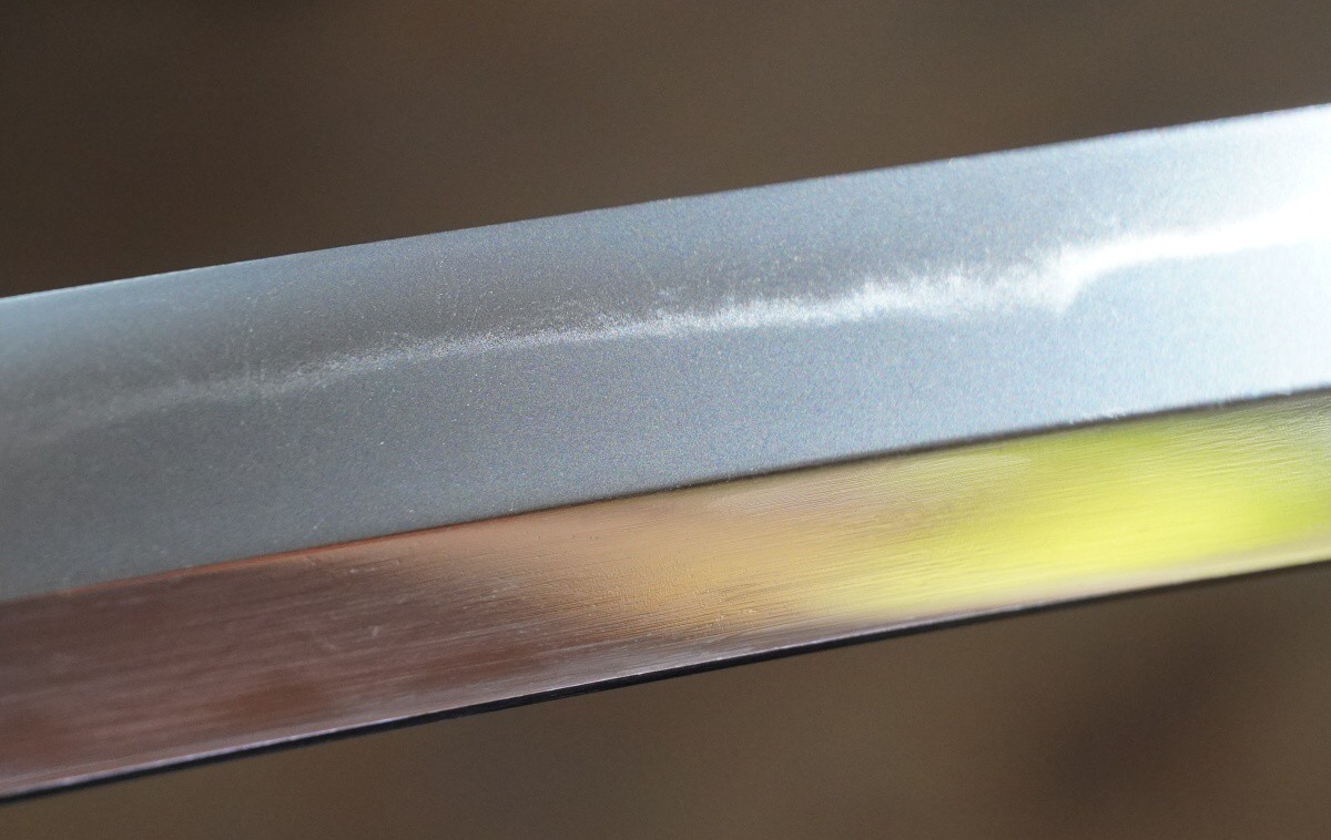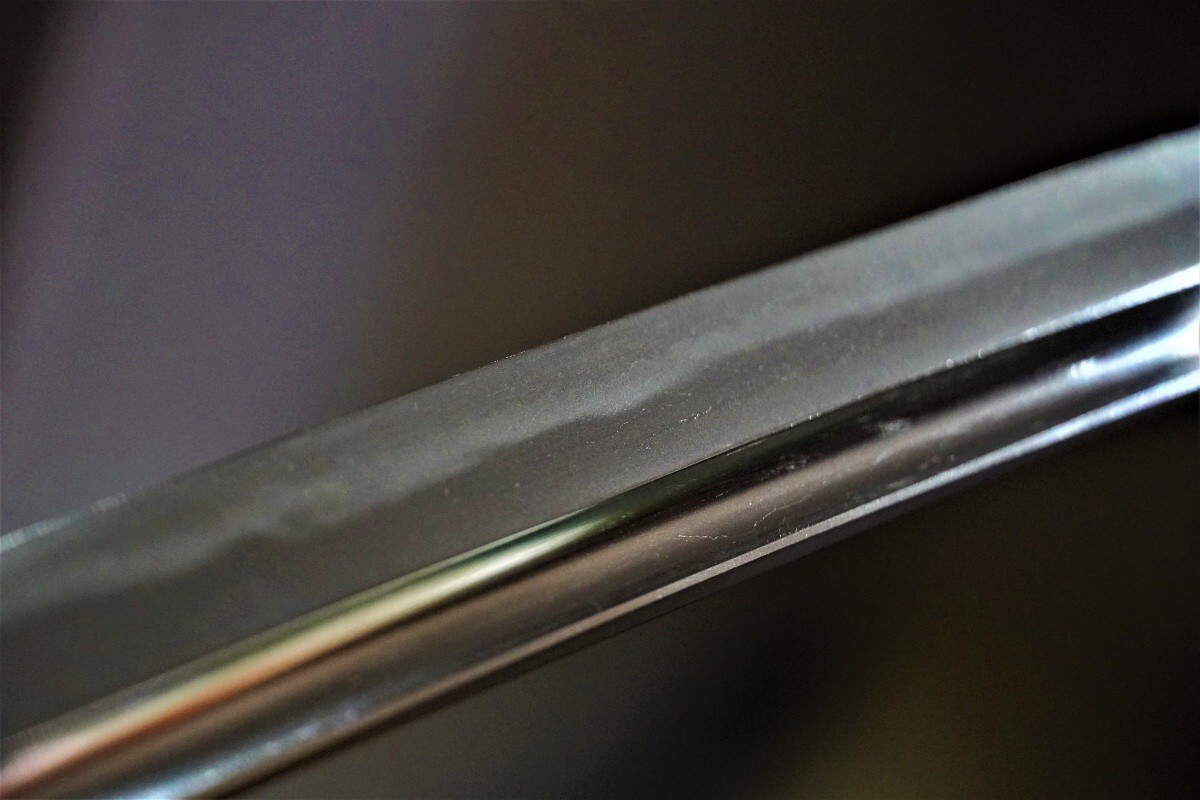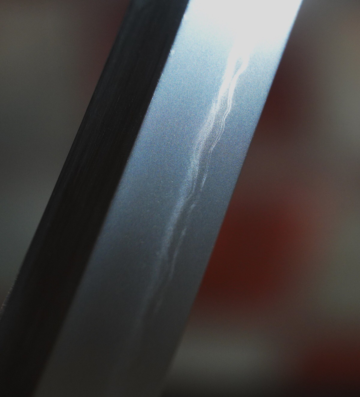 The sword is designed for tameshigiri. Hamon is intentionally harder. It allows for excellent sharpening and is excellent for chopping tatami or green bamboo. The higher hardness is achieved by leaving more carbon in the steel. Approximately 0.7% (I usually adjust to 0.6%C).