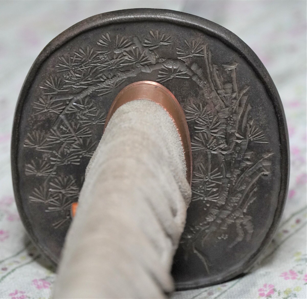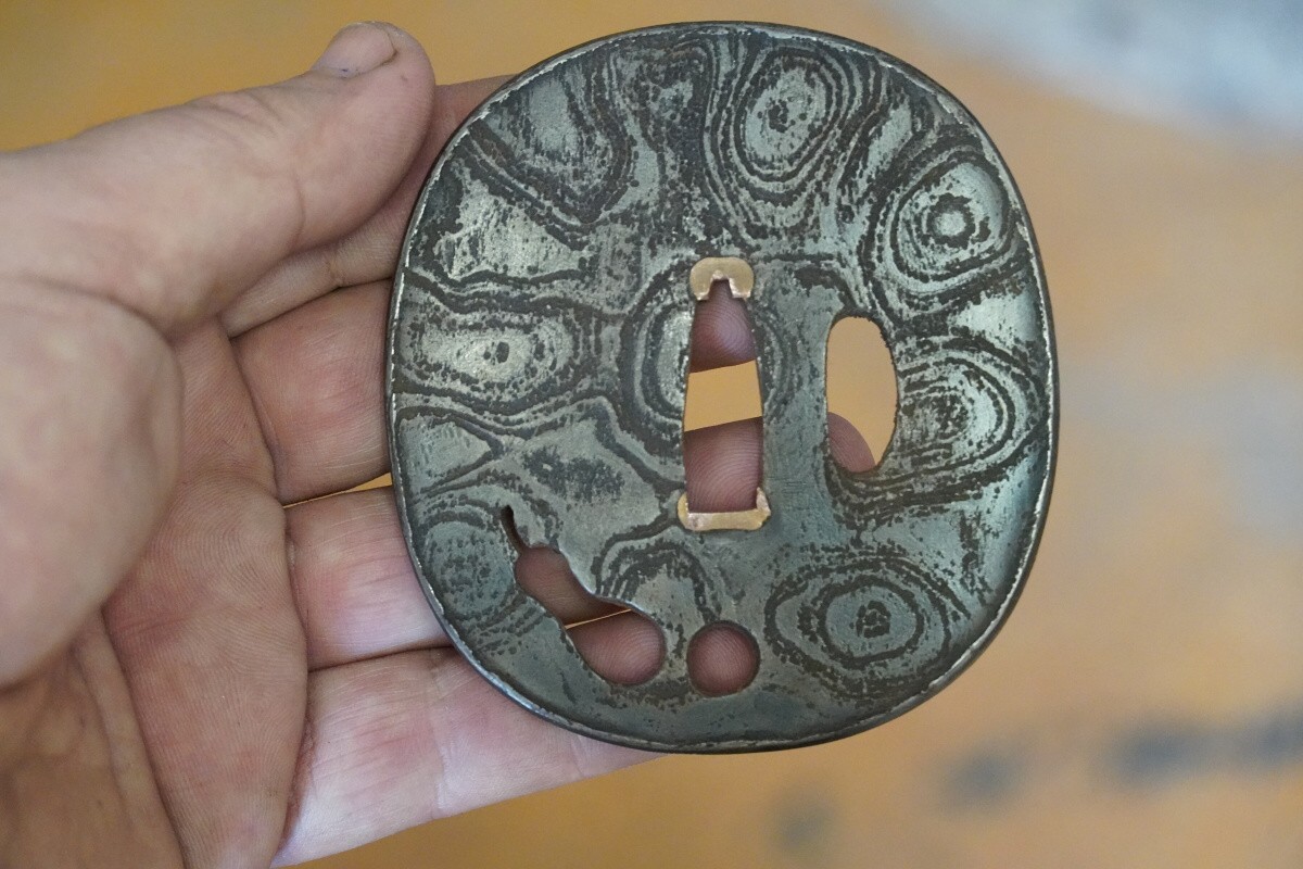 The set is Tensho in the style of the Edo period. Silk braided handle. Tsuba of folded steel in irregular form, with a nailed edge and pine engraving.