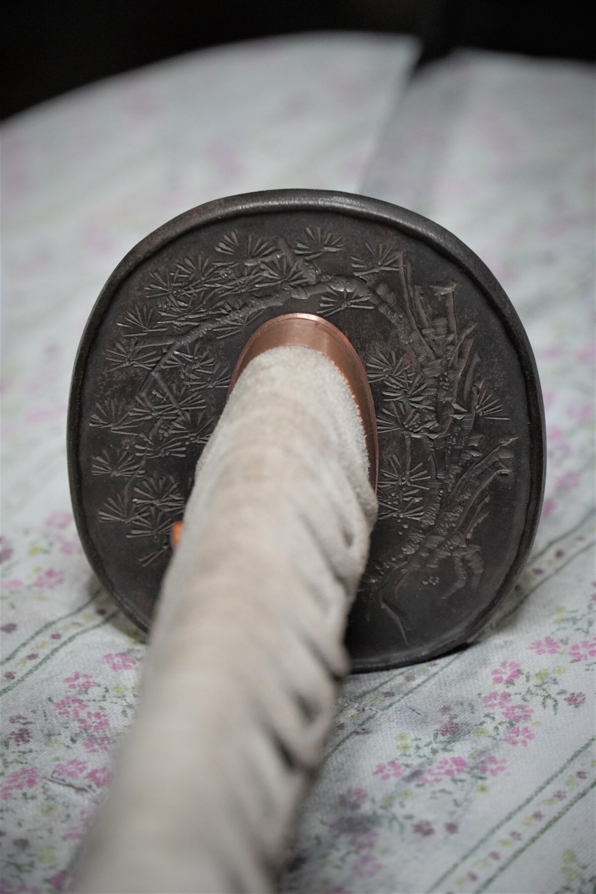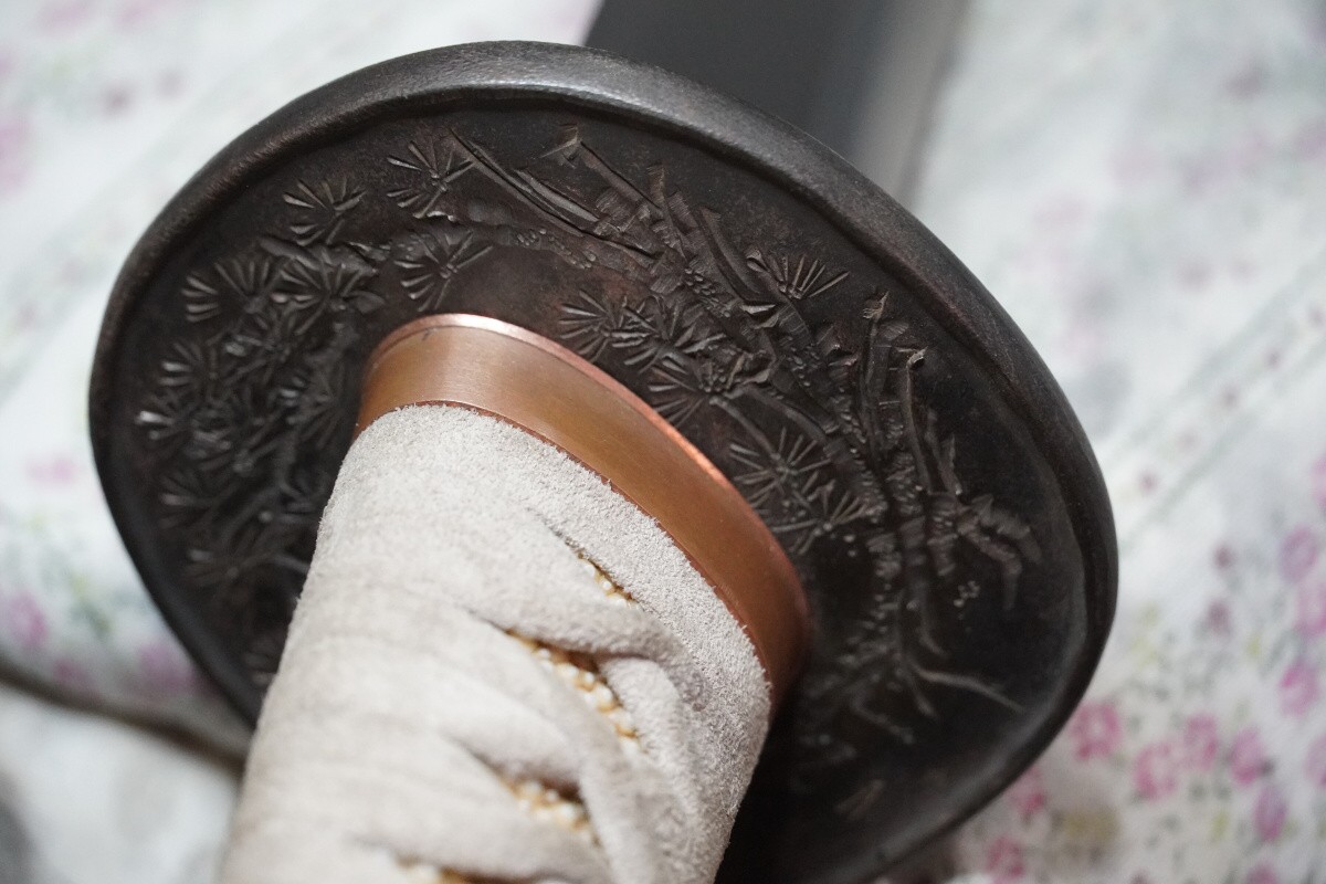 Koshirae Tensho. Tsuba with forged edge is decorated with engraving with pine tree motif. The pine tree motif is also on the menuki.