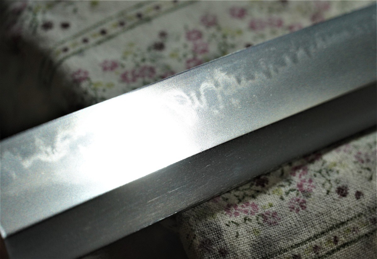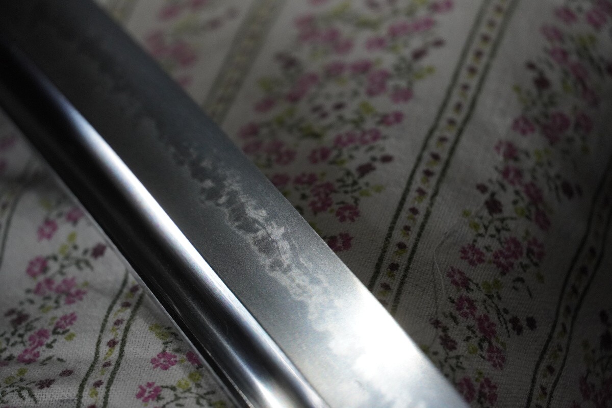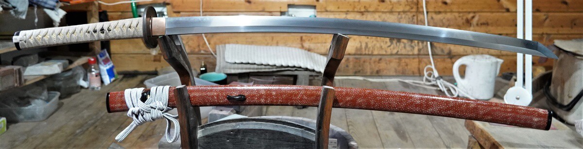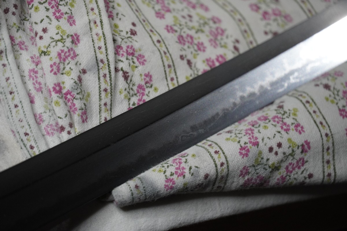 Katana, Nambokucho style, Bizen. Nagasa approx.75cm, mix of tamahagane/oroshigane own production. Jigane mokume, itame, with chikei. Hamon ko-choji. Keisho style polishing.