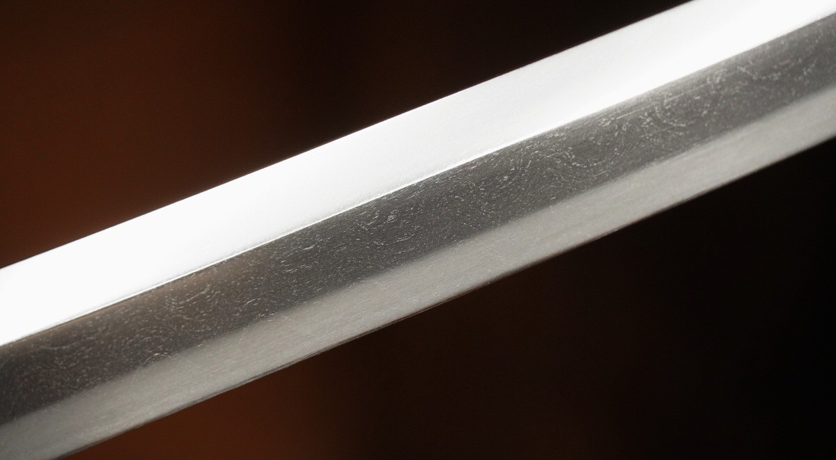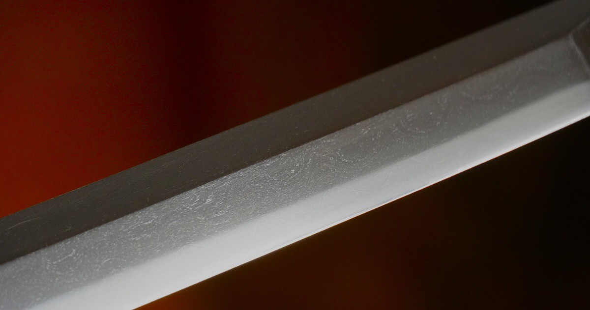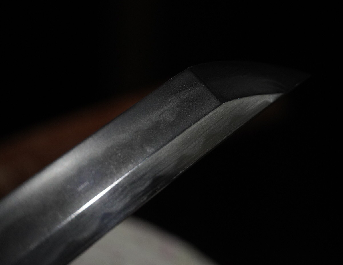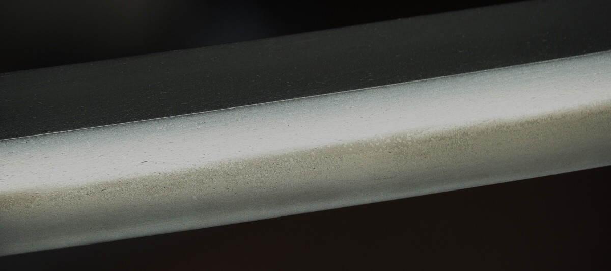 Sōshu style, wide katana, o kissaki, tamahagane/oroshigane mix, hamon midare, choji. Itame/mokume hada. Beautiful habuchi, reflective particles form changing formations. Nijuba, sunagashi, konsuji. Utsuri is subtle, reaches high to shinogi.