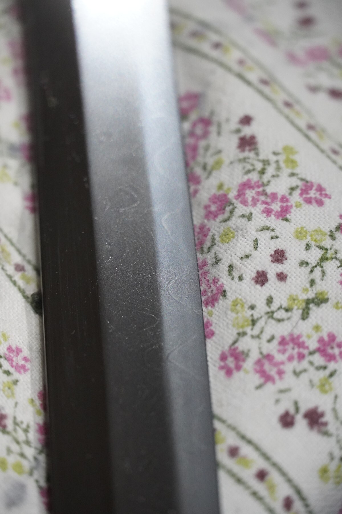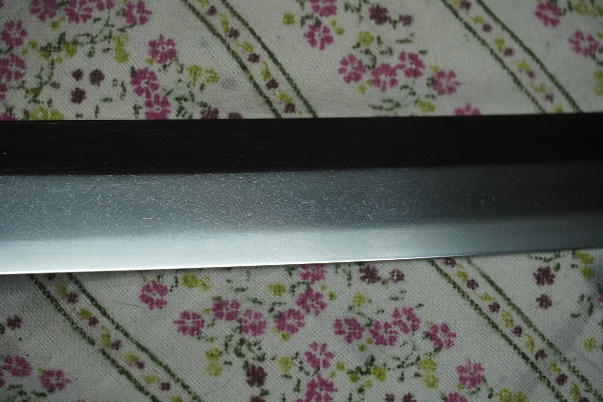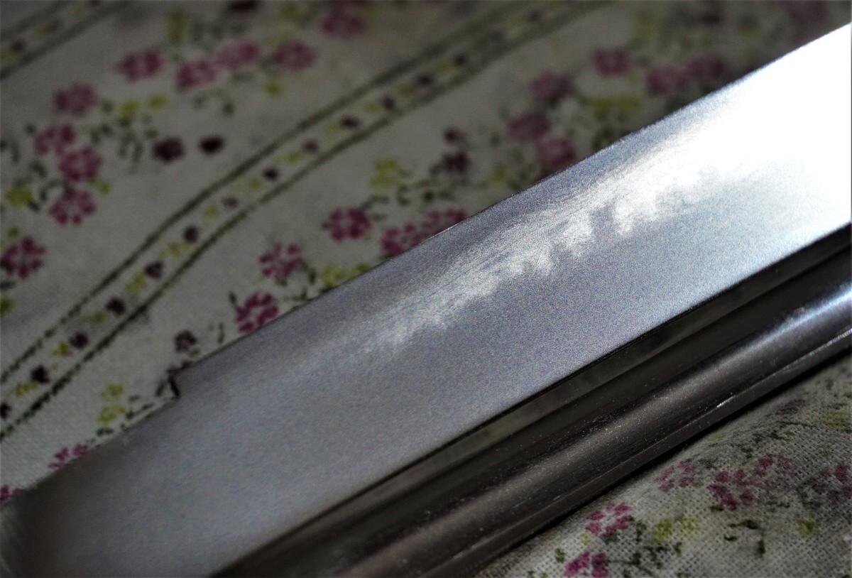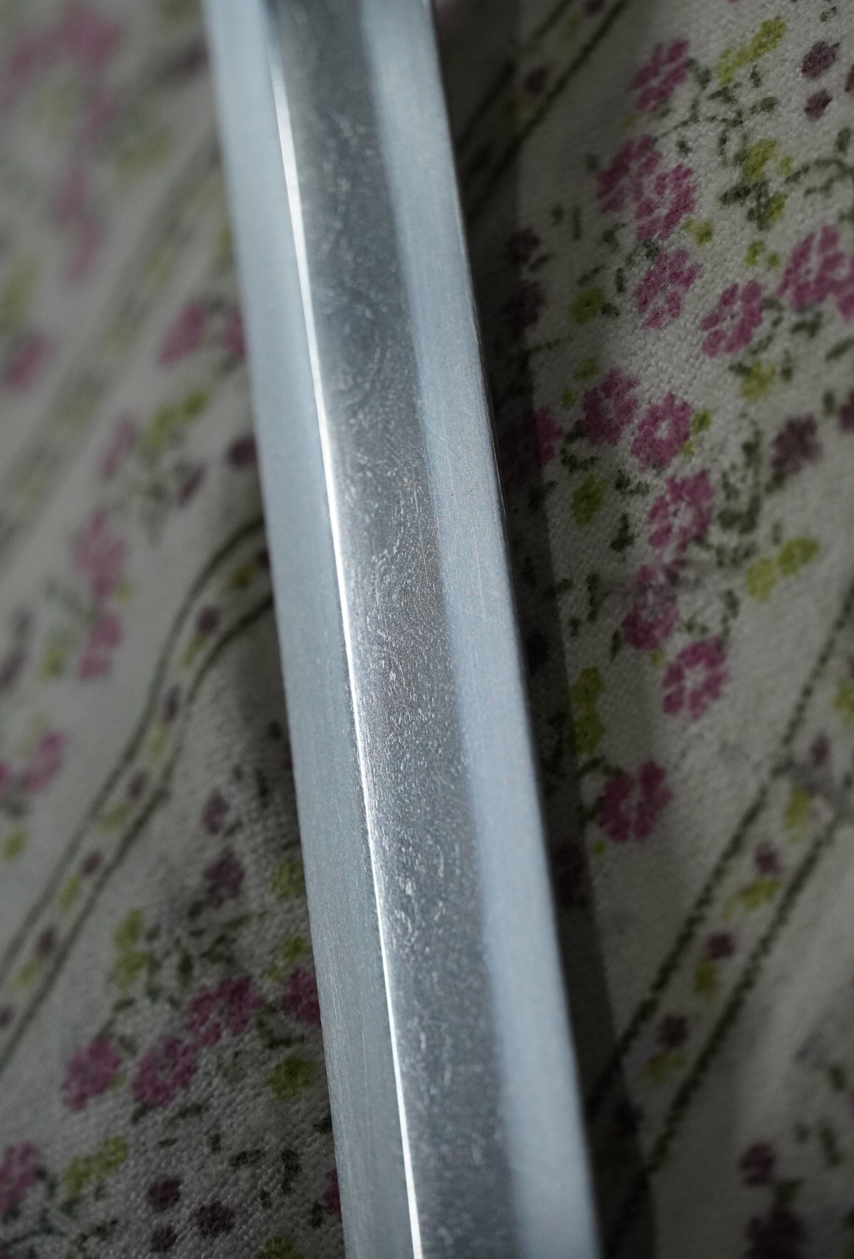 Katana, blade in Nambokucho period style, nagasa 83 cm, o-kissaki. Metallurgically very interesting blade in old style. Hamon suguha, midare, choji. Extremely distinctive utsuri, nie utsuri. From the hamachi rises a very distinctive koshiba. Present kinsuji, sunagashi, chikei. Jigane mokume, itame. In the original polishing, both the hada and the utsuri were much less pronounced. After the purchase of new polishing stones, the sword was re-polished, and with the use of the jizuya stone, the texture of the steel and metallurgy came out almost immediately. No chemicals were used for highlighting. Only the stones and jitekko. Polished in sashikomi style.