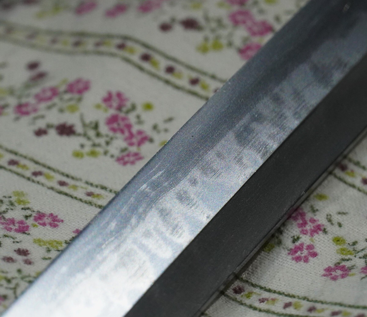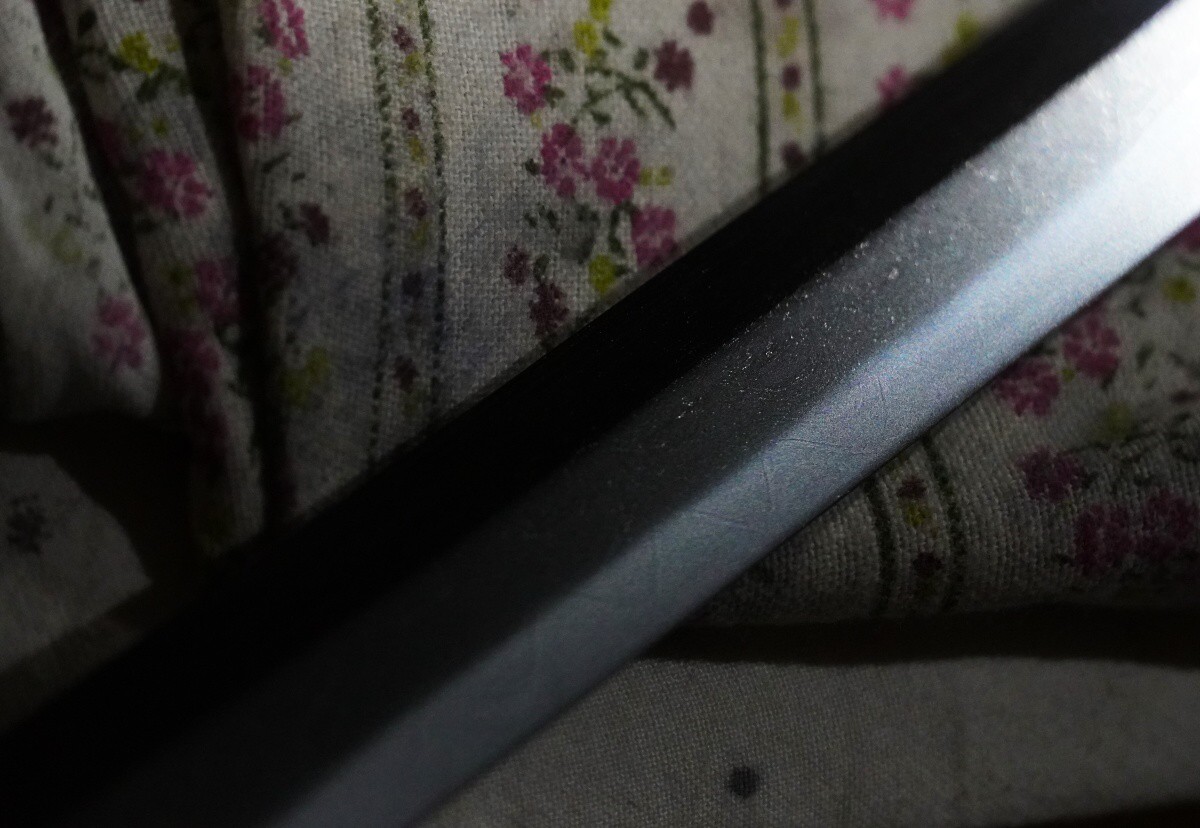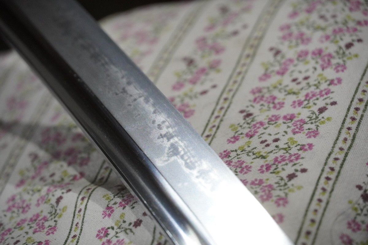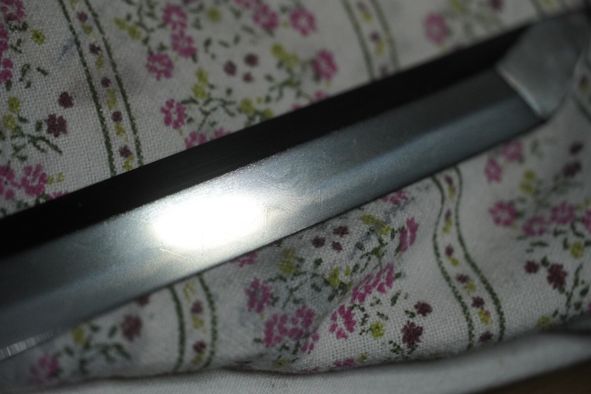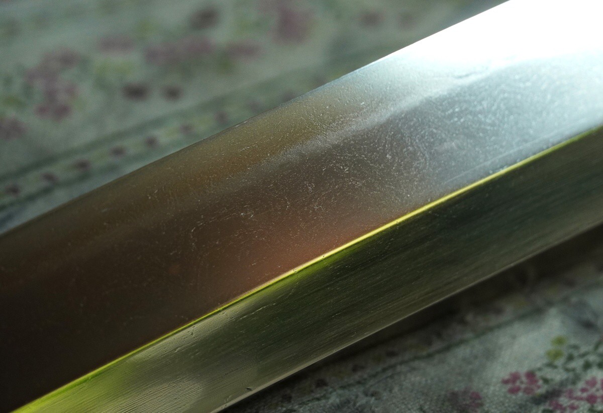 Katana, blade in Nambokucho period style, nagasa 83 cm, o-kissaki. Metallurgically very interesting blade in old style. Hamon suguha, midare, choji. Extremely distinctive utsuri, nie utsuri. From the hamachi rises a very distinctive koshiba. Present kinsuji, sunagashi, chikei. Jigane mokume, itame. In the original polishing, both the hada and the utsuri were much less pronounced. After the purchase of new polishing stones, the sword was re-polished, and with the use of the jizuya stone, the texture of the steel and metallurgy came out almost immediately. No chemicals were used for highlighting. Only the stones and jitekko. Polished in sashikomi style.