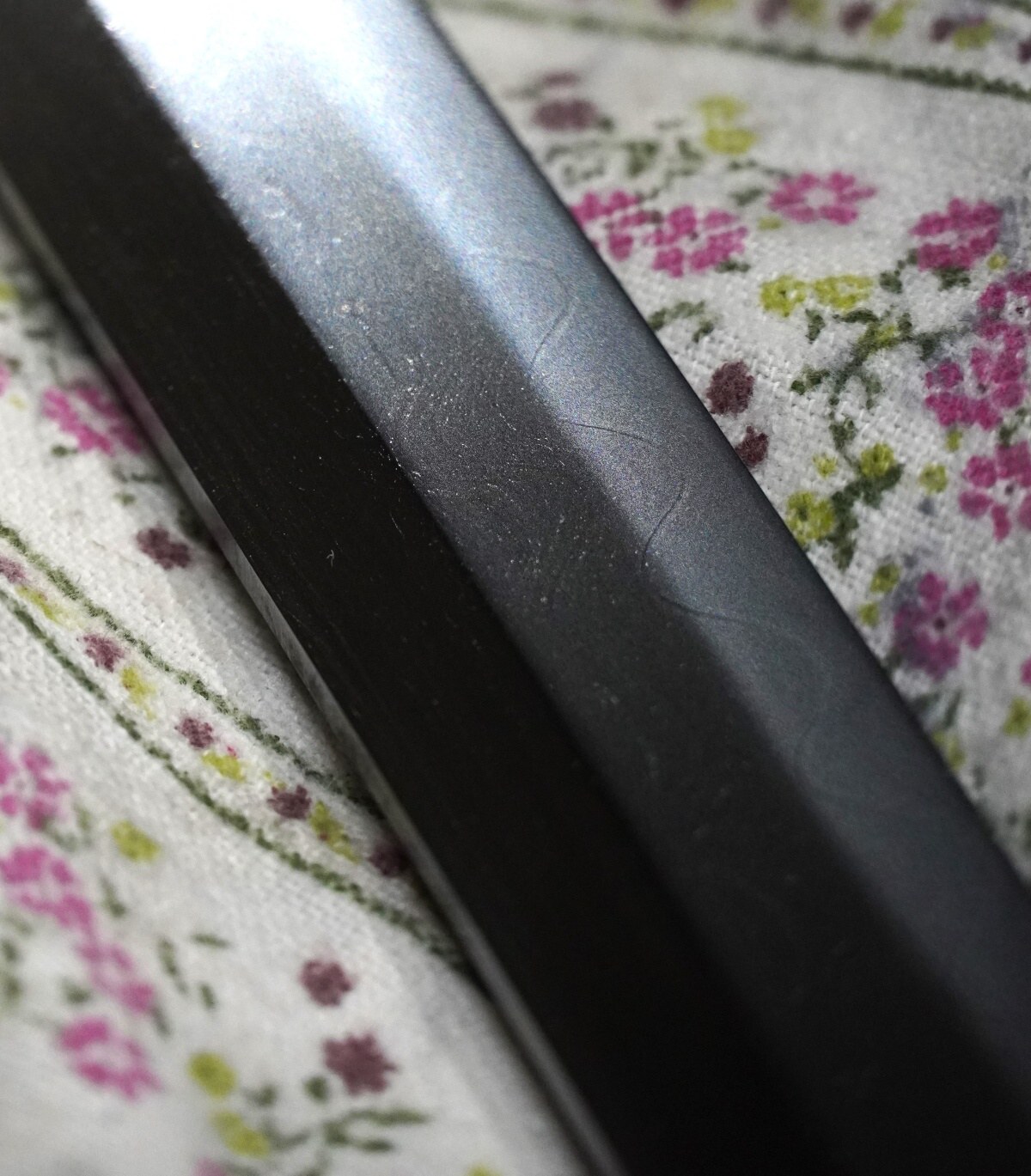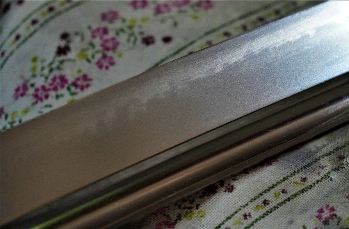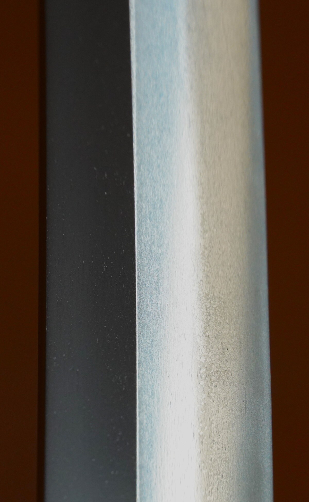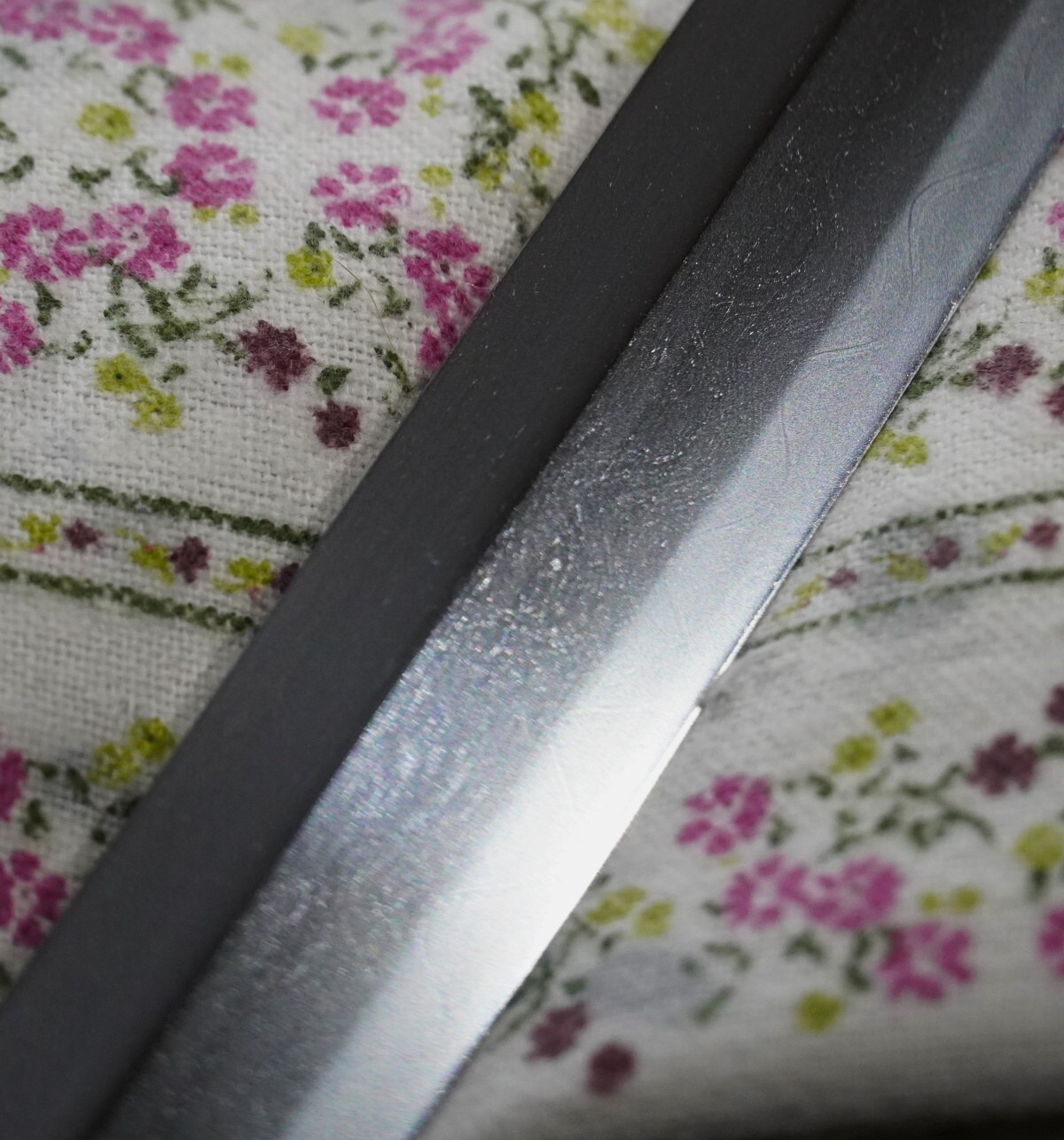 Katana, blade in Nambokucho period style, nagasa 83 cm, o-kissaki. Metallurgically very interesting blade in old style. Hamon suguha, midare, choji. Extremely distinctive utsuri, nie utsuri. From the hamachi rises a very distinctive koshiba. Present kinsuji, sunagashi, chikei. Jigane mokume, itame. In the original polishing, both the hada and the utsuri were much less pronounced. After the purchase of new polishing stones, the sword was re-polished, and with the use of the jizuya stone, the texture of the steel and metallurgy came out almost immediately. No chemicals were used for highlighting. Only the stones and jitekko. Polished in sashikomi style.