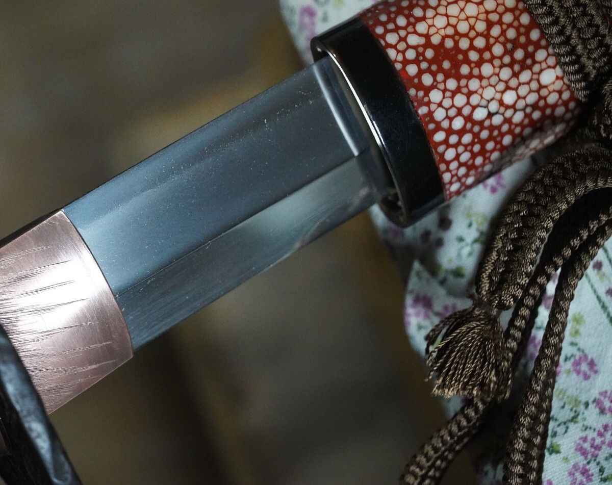 The sets are in Tensho style. The sword scabbards are in the same style as the saja, covered with stingray leather and varnished. The folded steel tsubas are engraved with a pine tree motif and a riveted edge. The pine engraving is also on the blade of the kogatan in the tanto set. The blades are polished in the traditional classical sashikomi style.