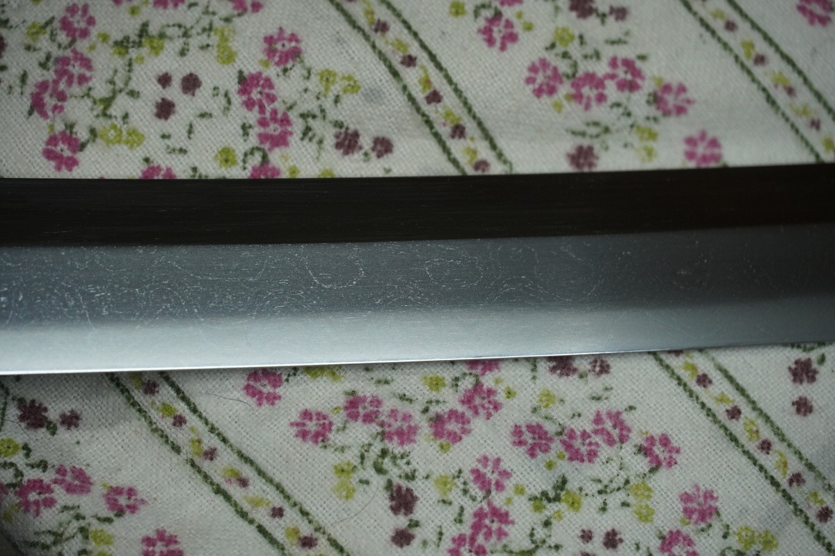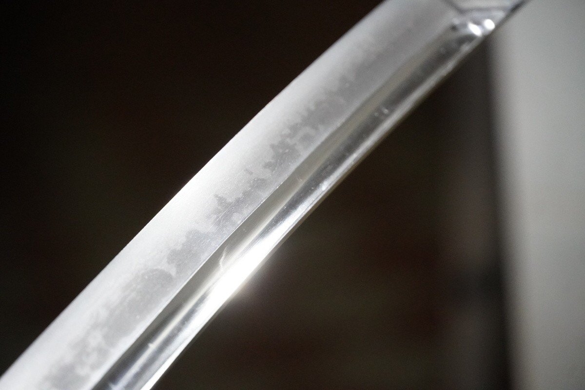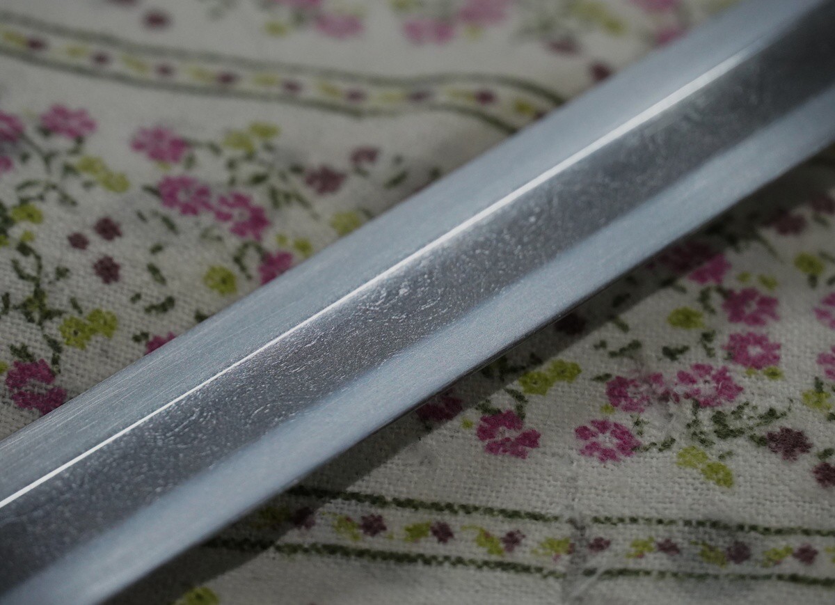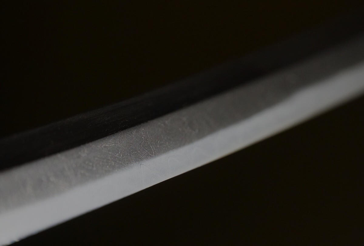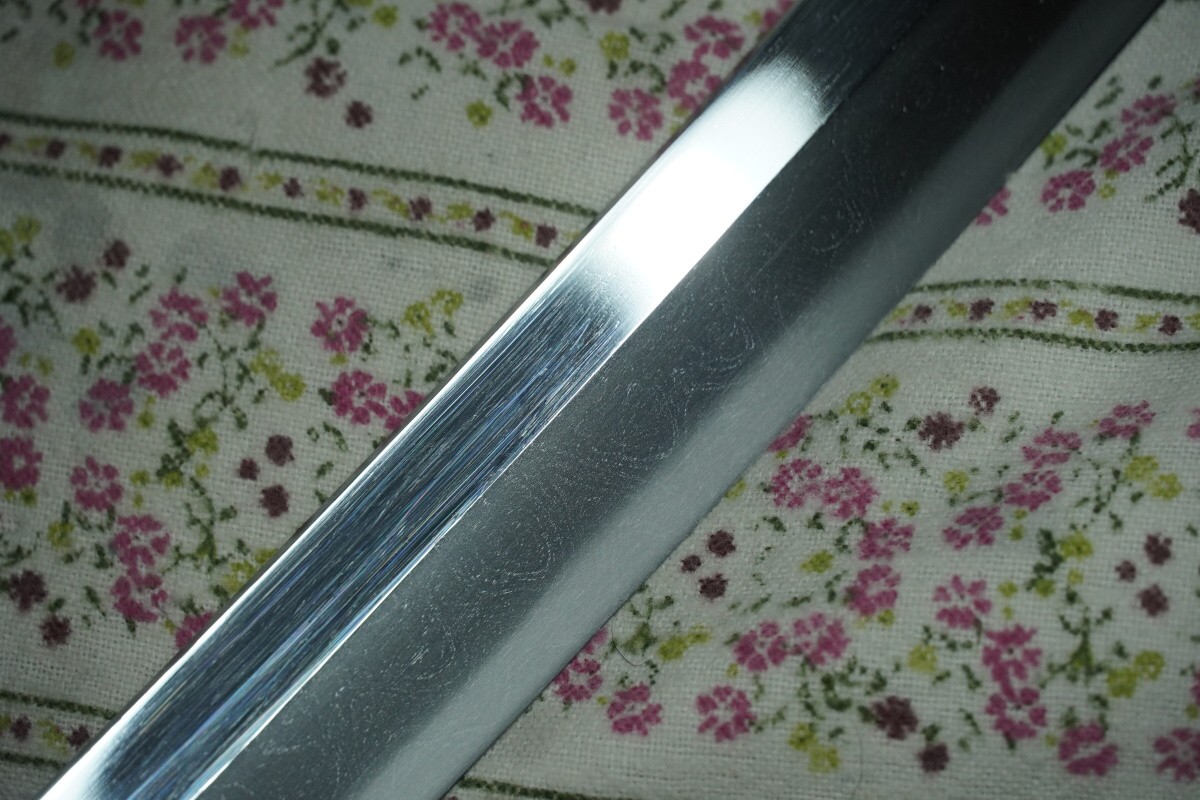 Katana nagasa about 70cm. Very semi-firm itame, ko mokume hada. Present distinctive kinsuji after folding the packet in Hon san mai style. Hamon coded, suguha with ashi. Weak utsuri. Polished in hadori style. Set in Edo period tensho koshirae, scabbard pocket for kogatana knife. Wrap ito. Menuki and tsuba with chrysanthemum motif in Akasaka style. Tsuba folded steel.