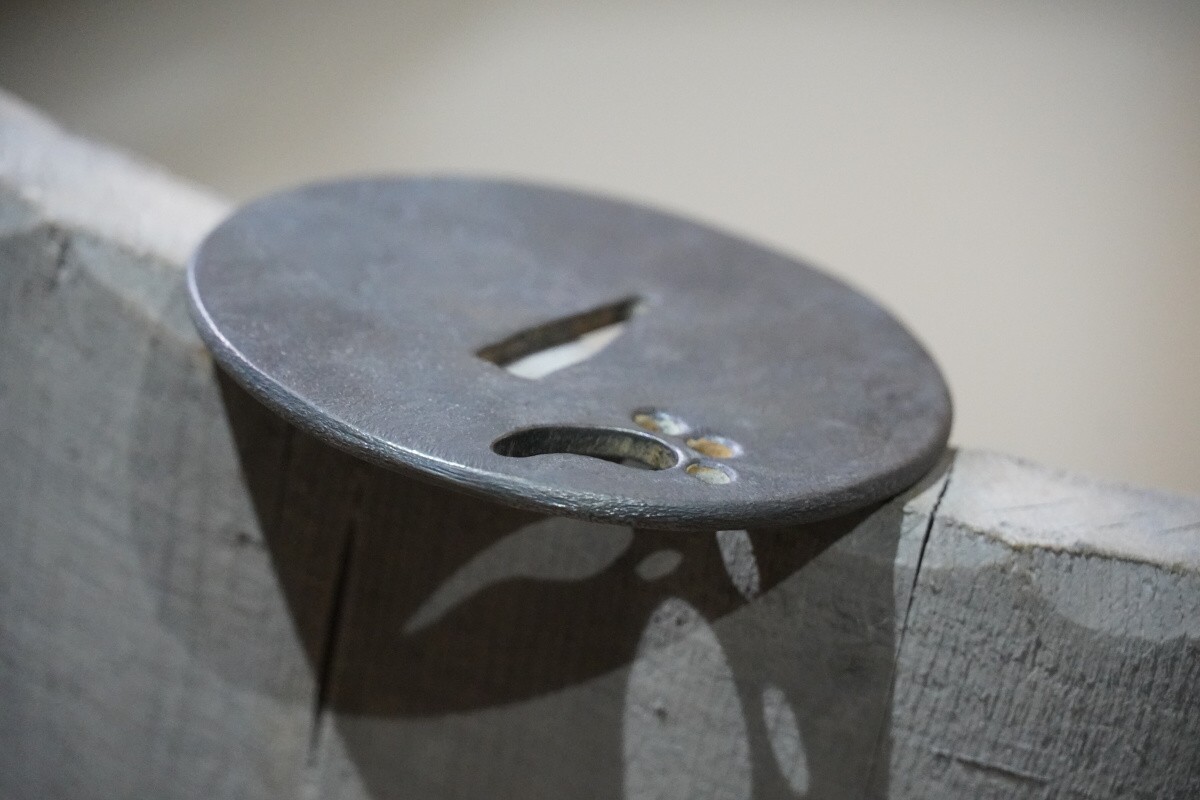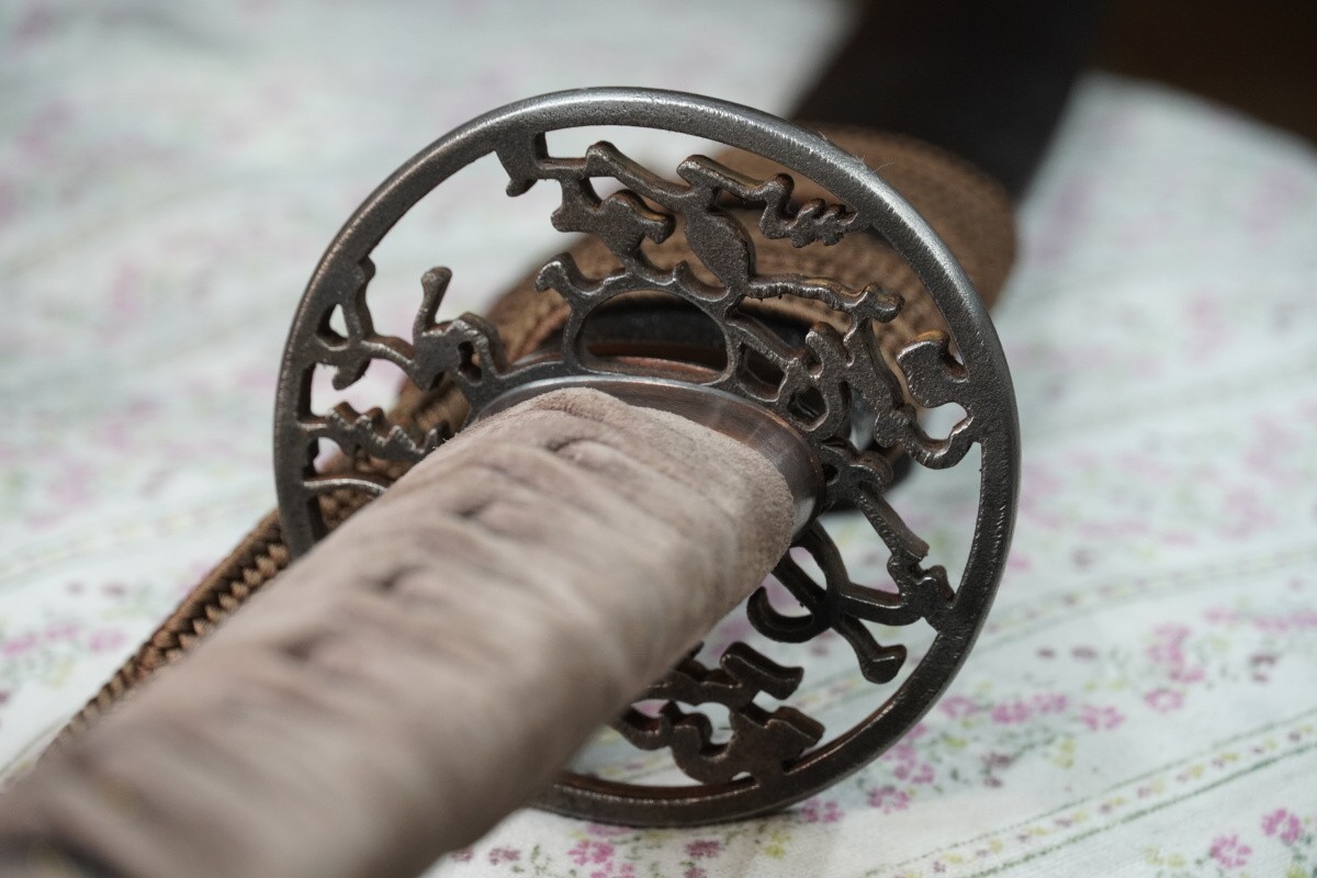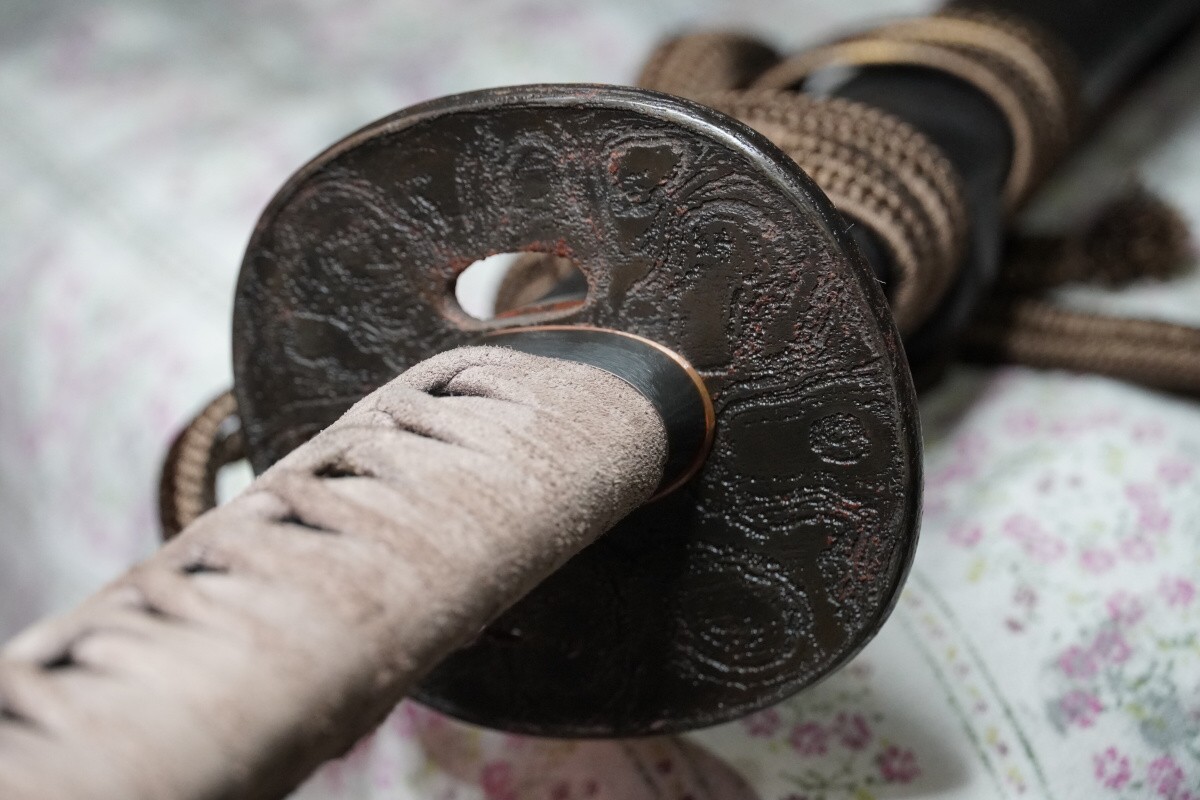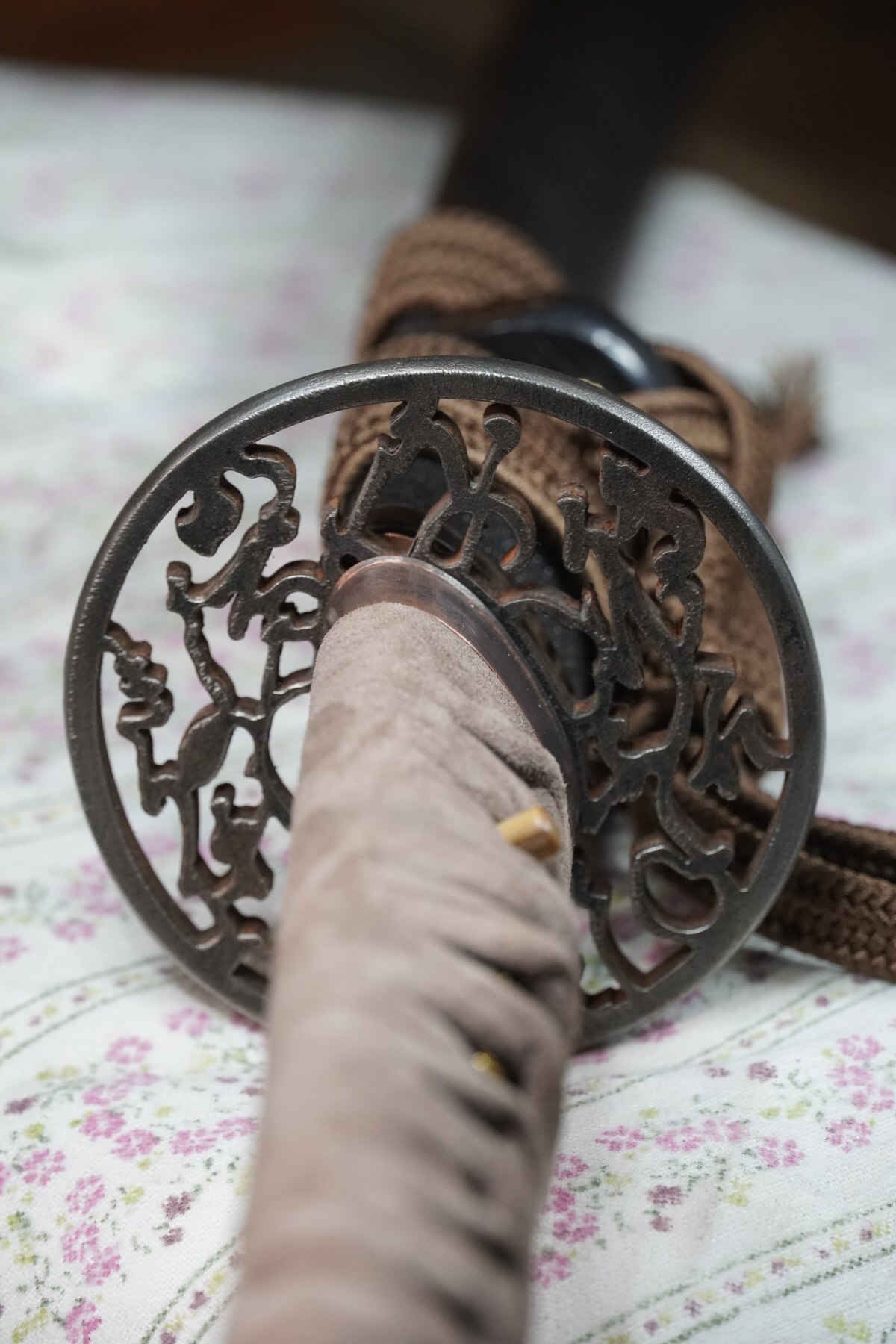 Koshirae tensho, light leather braid, ishime lacquer. Tsuba in overlaid low carbon steel with a hammered edge. Decorated with an engraving of a flowering plum motif.
