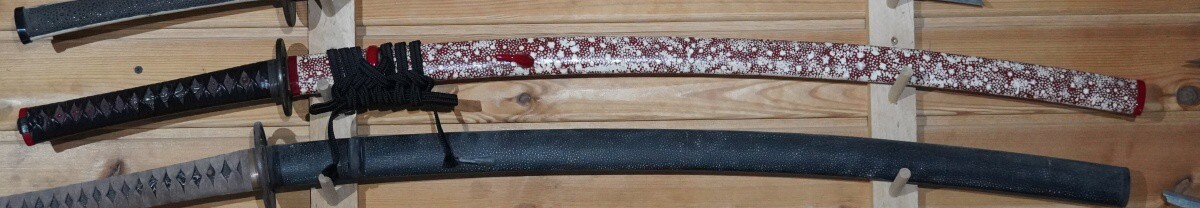 Simple tensho-style set. Two-piece habaki. Leather braided handles, Ishime-style saya lacquering.