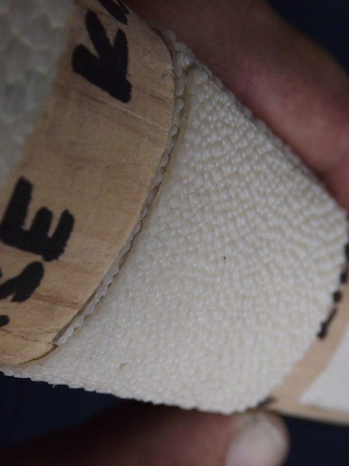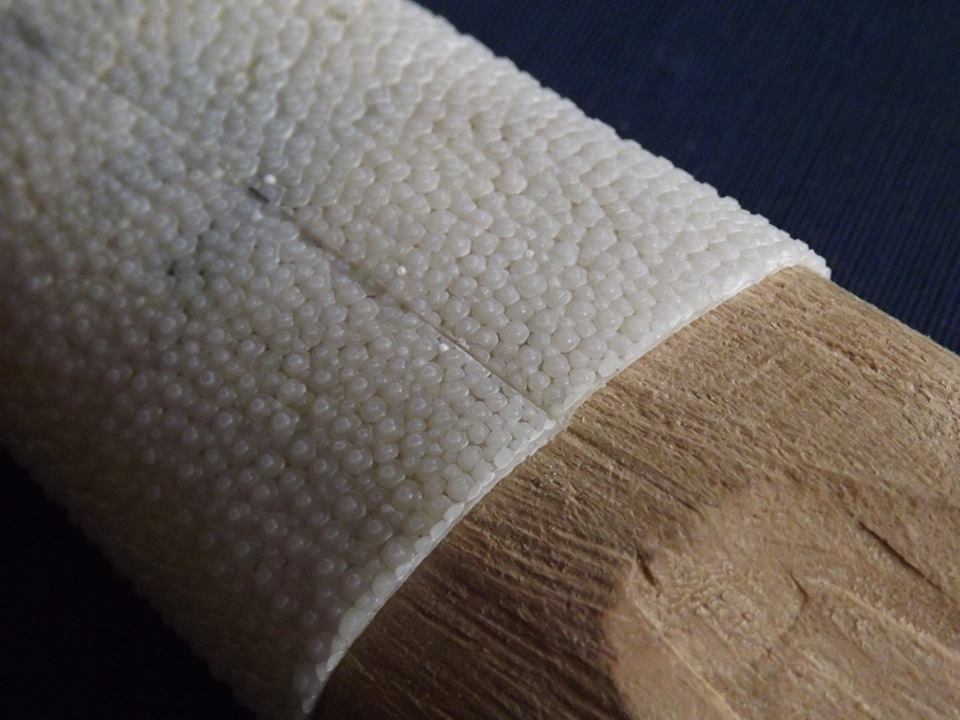 The large stones occurring in the centre of the leather are always placed on the OMOTE side of the handle.The leather is very hard in its raw state and needs to be soaked before being placed on the handle. Once soaked, it softens and can be used to accurately fit the shape of the handle. After the wet leather is placed on the wooden core, everything is wrapped tightly with cord and left to dry. After drying, the shape of the same is fine-tuned, the overlaps are cut and sanded and the leather is glued to the wood.After the glue has dried, the leather can be repainted to increase moisture resistance. This is typical of my favourite style, Tensho, for example.