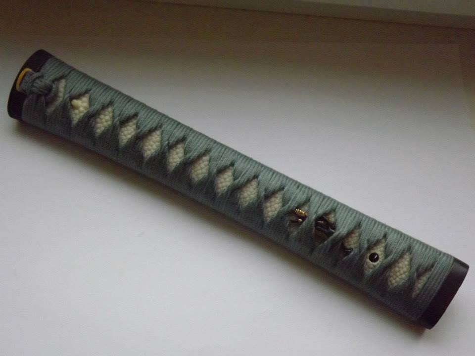 Samegawa tsuka. The wooden core of the handle is covered with stingray leather. It is very hard. Its surface is made of bone grains. There are three styles of using stingray skin on a sword hilt.