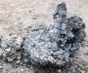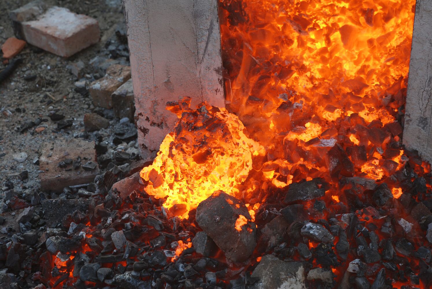 The second furnace was brick, with a square base and a wall length of about 60 cm. In the first smelting the air was drawn in by two pumps, in the second smelting by one pump. The charge was about 40 kg of satetsu and 150 kg of charcoal. Reduction time approx. 4 hours. The furnace was operated by Loki. The first smelting resulted in 4 kera, one high carbon, almost cast iron and three smaller compact kera of high quality high carbon tamahagane weighing 3-5 kg each. The second one-pot smelting was carried out very carefully with minor changes based on the results and experience of the first, test smelting. The result was a huge kera of about 20kg and one smaller compact kera of about 3kg. The large bark is compact, consisting of high carbon steel. There is a smaller protrusion at the top which has not been fully reduced by the ferrous sand. This part of the kera shows the process of reduction, the conversion of iron oxide into steel.